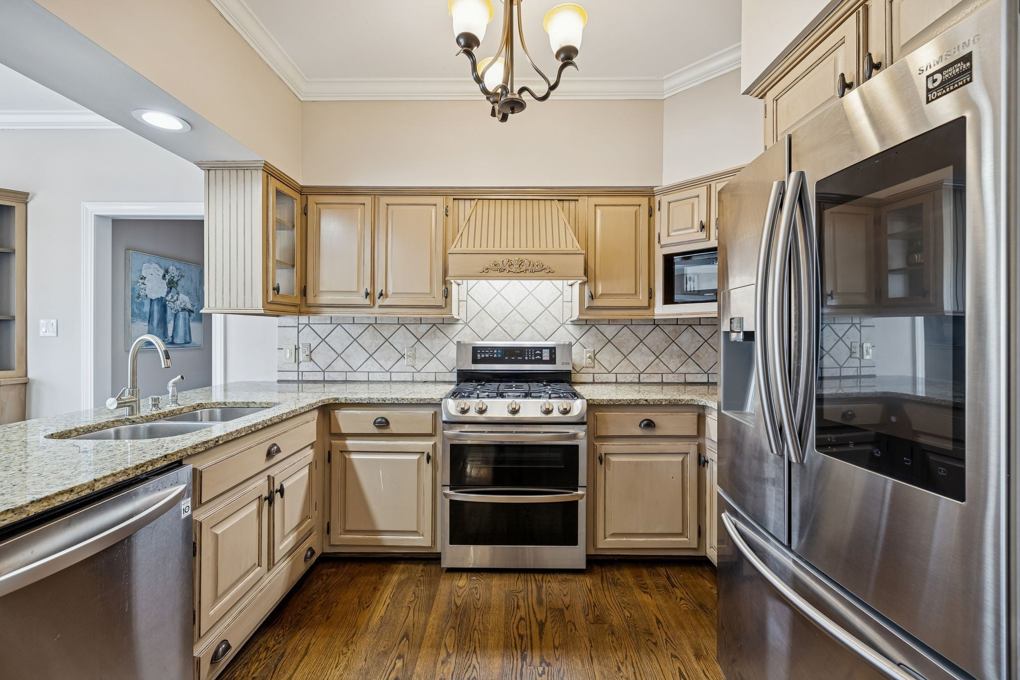 - Gas Oven, Gas Range, Dishwasher, Disposal, Freezer, Microwave, Refrigerator, Stainless Steel Appliance(s)