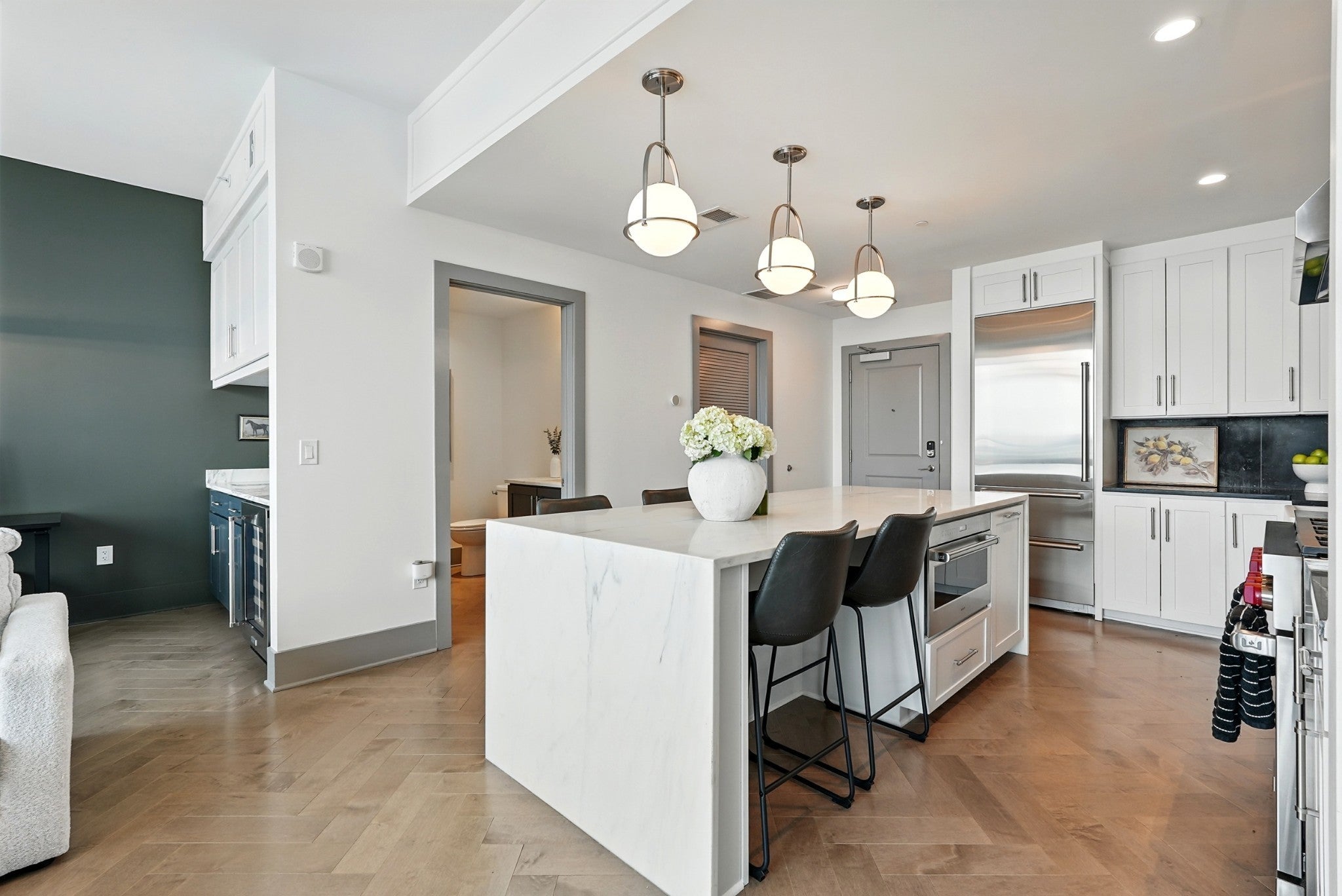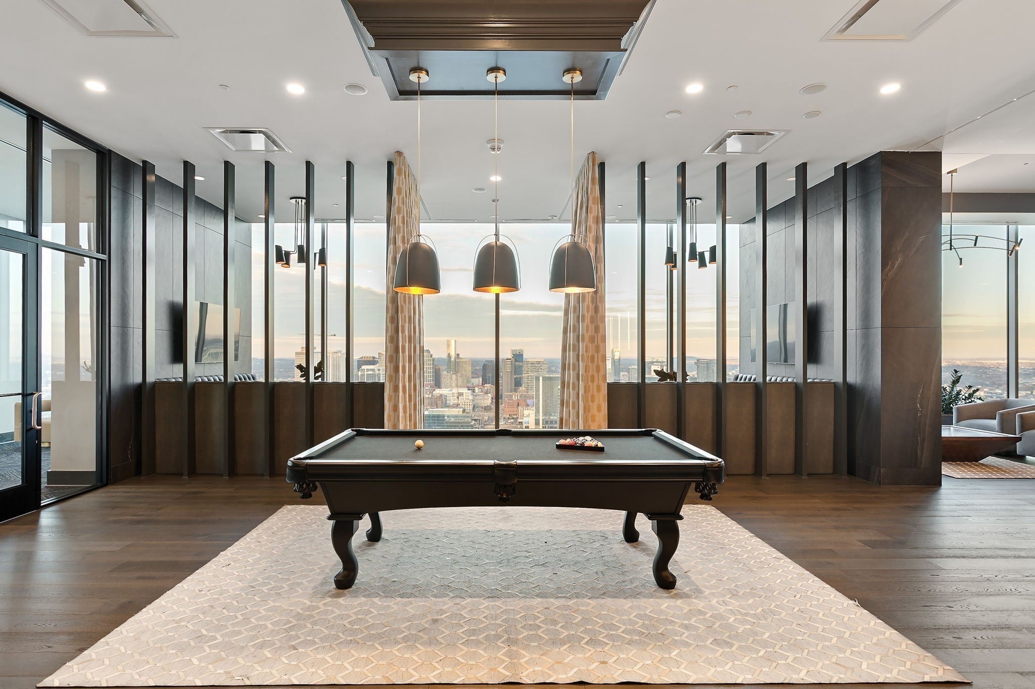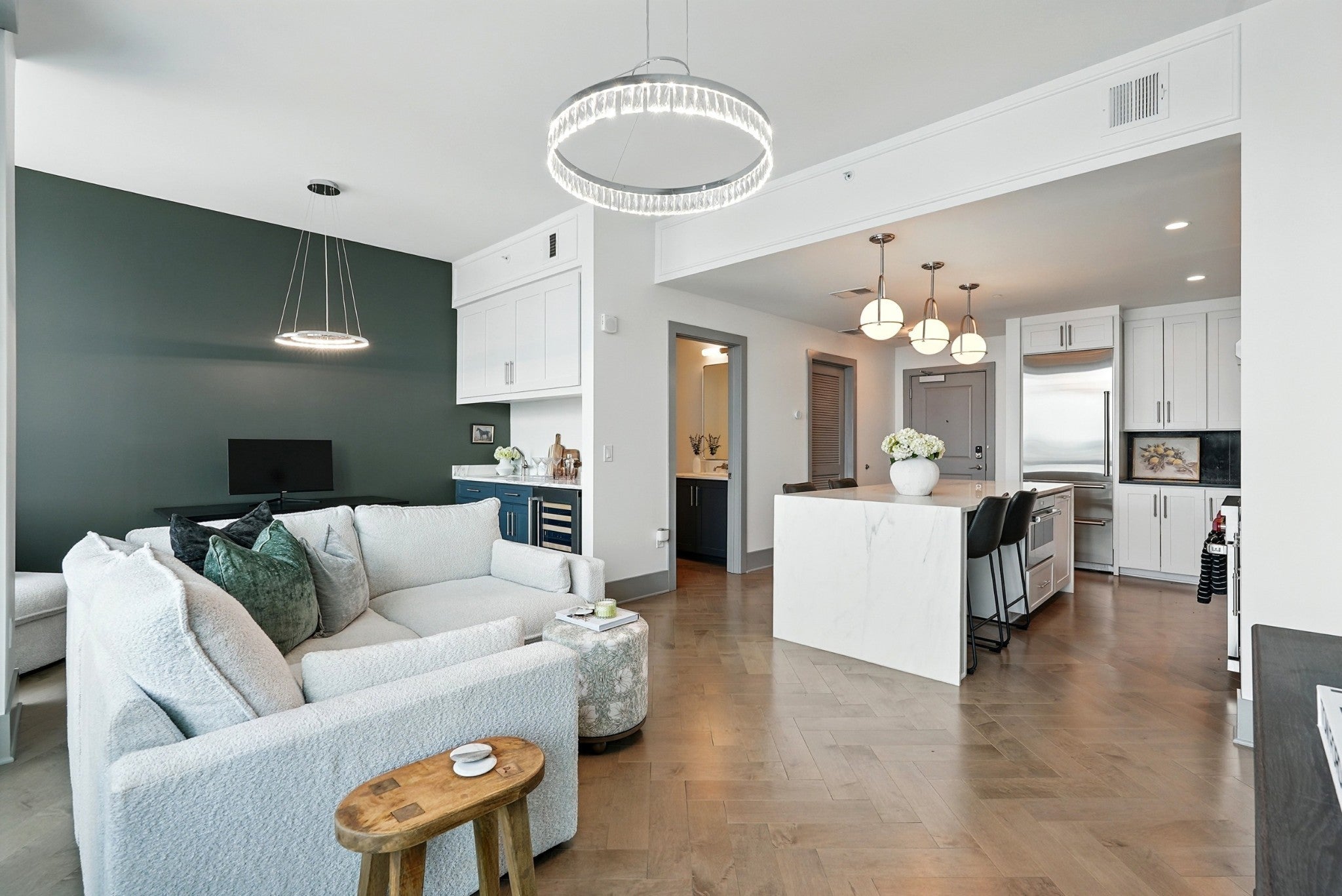 Offered fully furnished with premium Restoration Hardware pieces, this stunning 16th-floor residence at Broadwest delivers effortless, turnkey living with unmatched style and sophistication. As the largest floor plan available, this spacious and thoughtfully designed condo features large living area, a custom wet bar with flex office or dining space, powder room, laundry room, walk-in closets, and a luxurious spa bath with freestanding tub. The gourmet kitchen boasts a Wolf gas cooktop, SubZero refrigerator, marble countertops and backsplash, and a waterfall island. Floor-to-ceiling windows with motorized shades frame gorgeous sunset views from the large private balcony, perfectly positioned for a private and serene western exposure. Residents enjoy access to resort-style rooftop amenities on the 34th floor—exclusive to owners—including a fitness center, steam/sauna, golf simulator, billiards room, library, rooftop pool with cabanas, private dining room, lounge, and 360° views of Downtown Nashville. With a la carte services provided by the Conrad Hotel, this is luxury living redefined in the heart of Nashville.