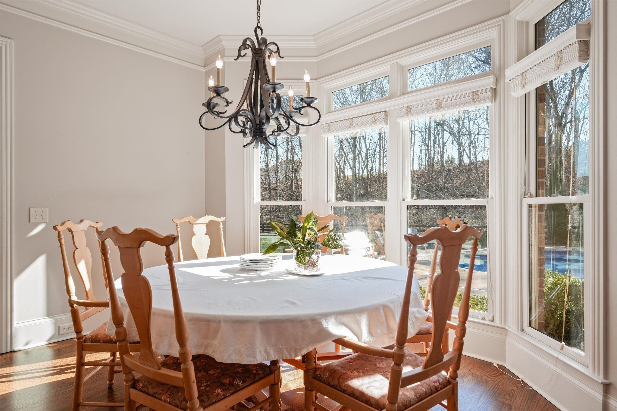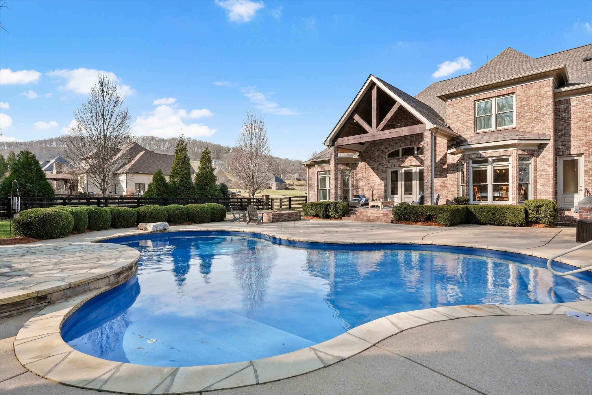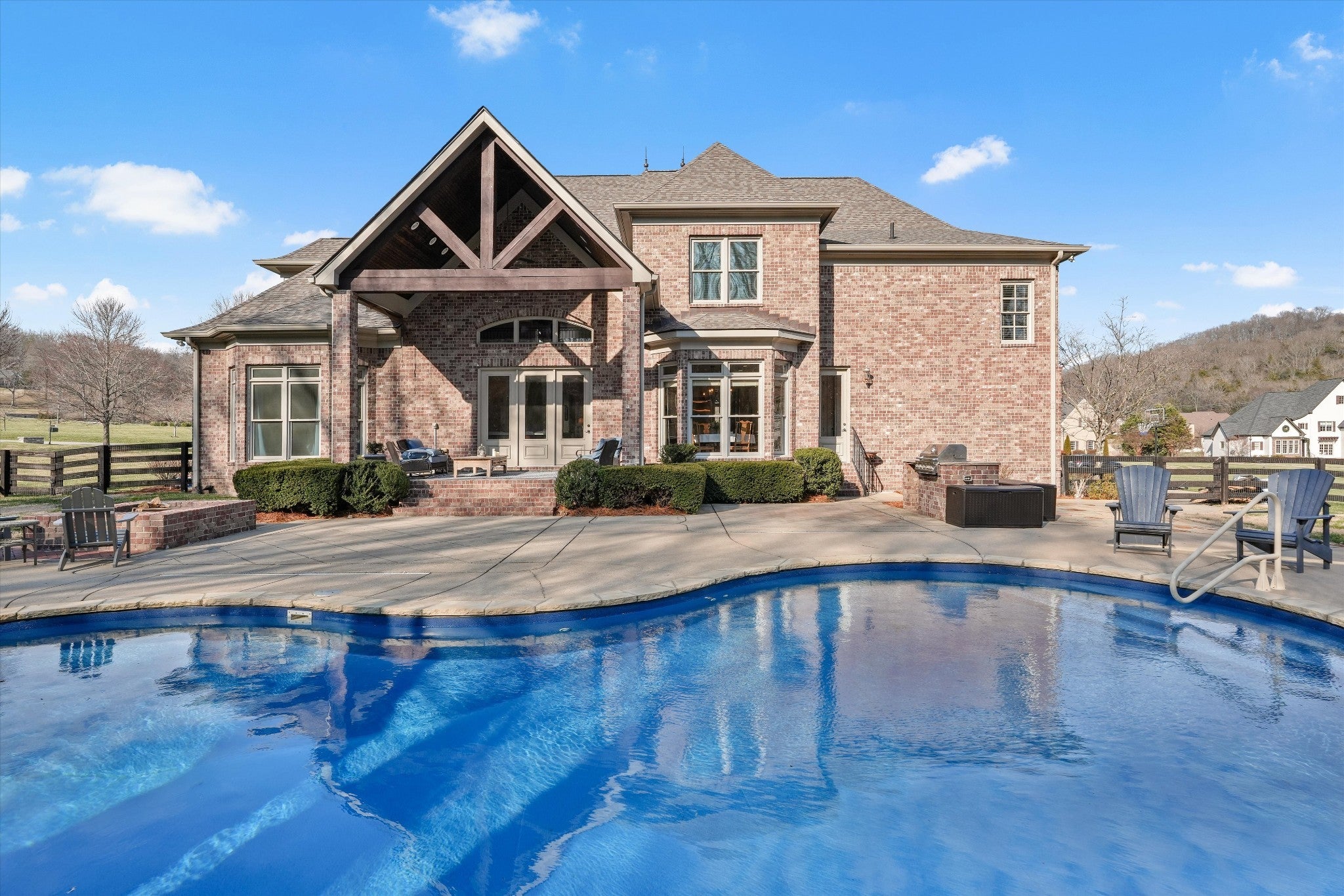Set on a level one-acre lot backing to a tree line, this 4,745-square-foot home offers four bedrooms and four full baths with a layout designed for both everyday living and entertaining. The primary bedroom is located on the main level, along with a formal dining room, an open kitchen that connects easily to the living spaces, and a versatile flex room. Upstairs, a large bonus room with a wet bar anchors the upper level, alongside three secondary bedrooms—each with its own direct, private en-suite bathroom—a second laundry, and an additional flex space suitable for a home office, gym, or other uses. Outside, the resort-style backyard centers around an in-ground pool, surrounded by mature landscaping and generous green space, while a substantial parking pad provides ample off-street parking. Ideally located with quick access to the interstate, downtown Franklin, and Cool Springs, the property offers a perfect balance of privacy, function, and accessibility.