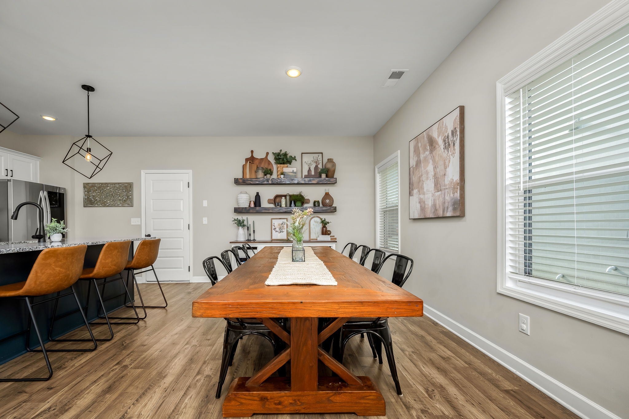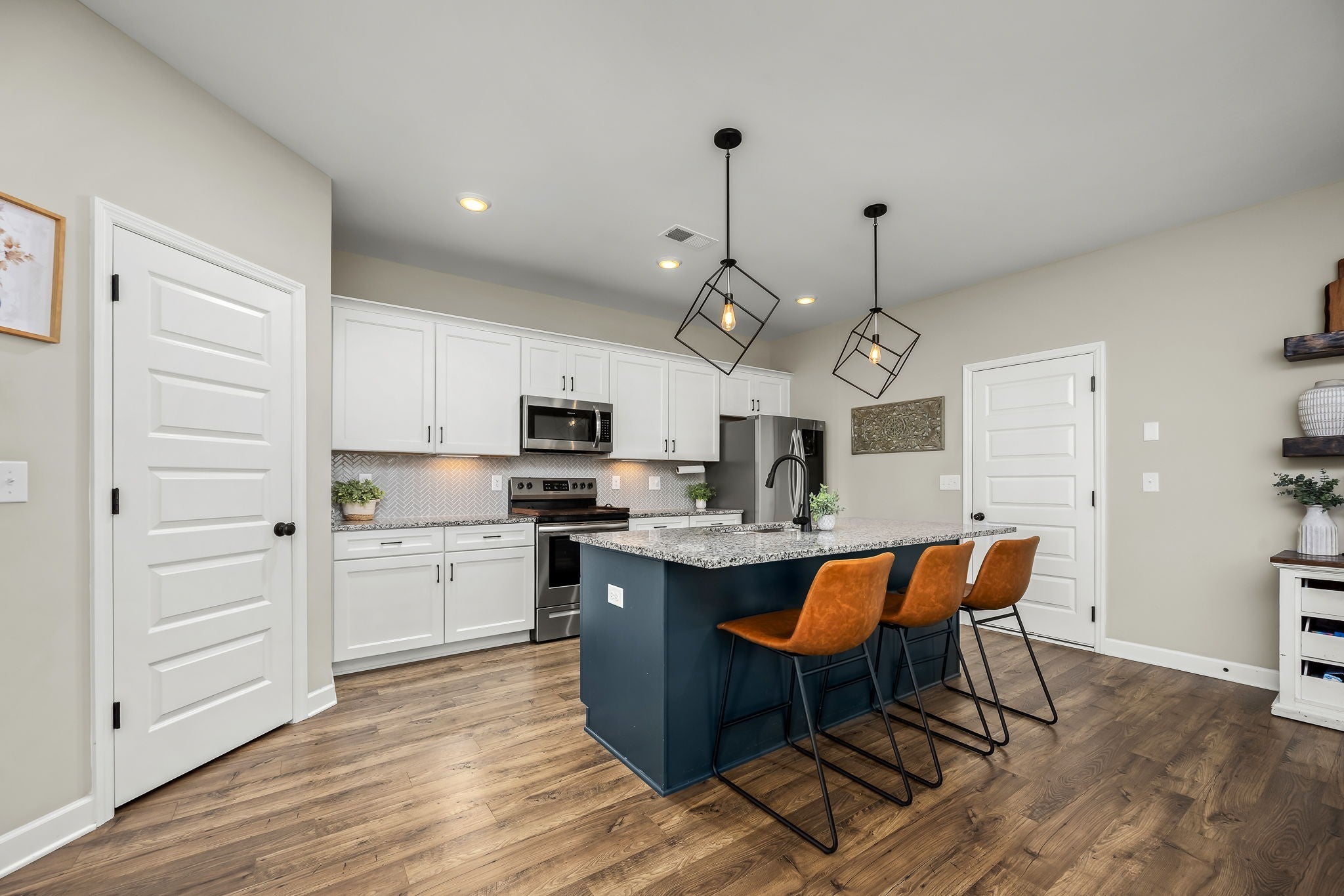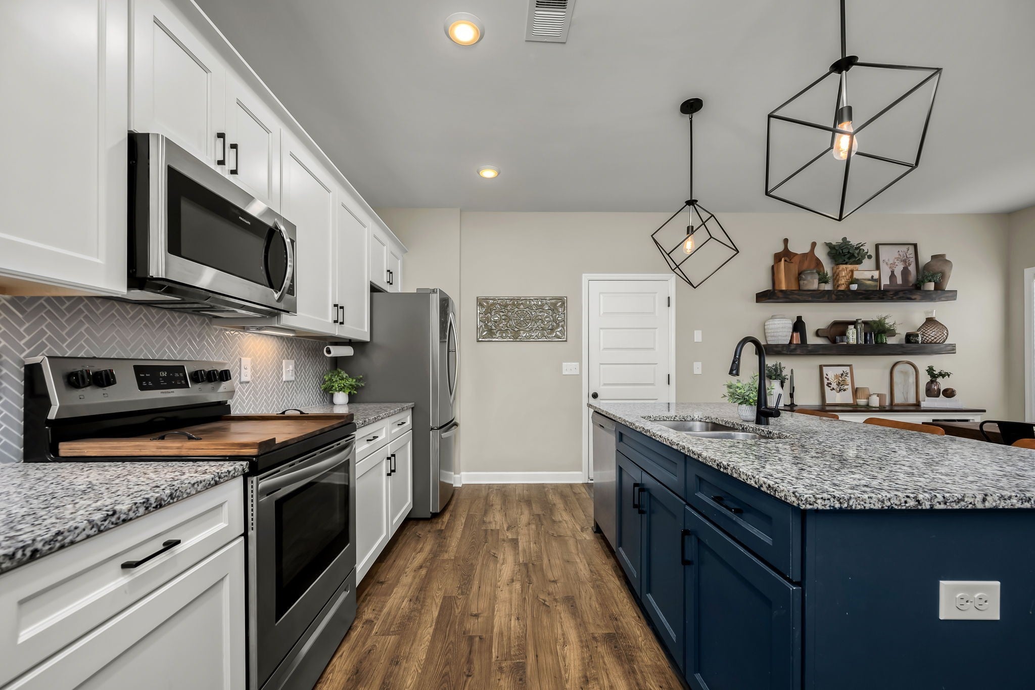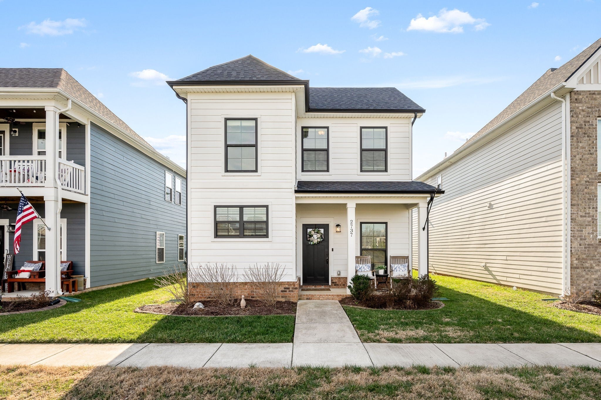 Welcome home to your next chapter, where classic charm meets modern comfort. Striking black-framed windows paired with white Hardie board create beautiful curb appeal, complemented by a rocking chair front porch with a tongue & groove ceiling, perfect for slow mornings & relaxing evenings. Inside, an open, light-filled living room welcomes you with beautiful flooring & soaring 9' ceiling. The heart of the home is a stunning kitchen designed for entertaining & everyday living, featuring stainless steel app., granite, white cabinetry with under cabinet lighting, herringbone backsplash, an accent island with bar seating, & a large walk-in pantry. The adjacent dining area includes floating shelves & is ideal for casual meals & hosting for the holidays. A convenient half bath & additional storage complete the main level. Upstairs, a versatile loft with a vaulted ceiling offers the perfect space to relax, gather, & enjoy movie nights, the big game, and more. The bright & airy owner’s suite is a true retreat featuring a vaulted ceiling, double vanities, walk-in shower with bench, walk-in closet, plus an additional closet. Inviting guest rooms include large double door closets, with an upgraded utility room conveniently nearby. This smart home is built for efficiency & comfort, featuring spray foam insulation, multi zone HVAC with smart Google Home thermostats allowing separate temperature control for both levels, Ring doorbell camera, AT&T/Google fiber internet, an insulated garage with built-in shelving, insulated smart garage door & decorative beam. Rear solar cell lighting adds to the home’s efficiency. Enjoy community amenities including a pool, a short distance away, with food trucks visiting throughout the year. Along with sidewalks and lawn maintenance included with dues. Conveniently located only 3.5 mi from the interstate & close to a vast amount of restaurants, shopping, & medical facilities. This is more than a home, it’s the lifestyle you have been waiting for.