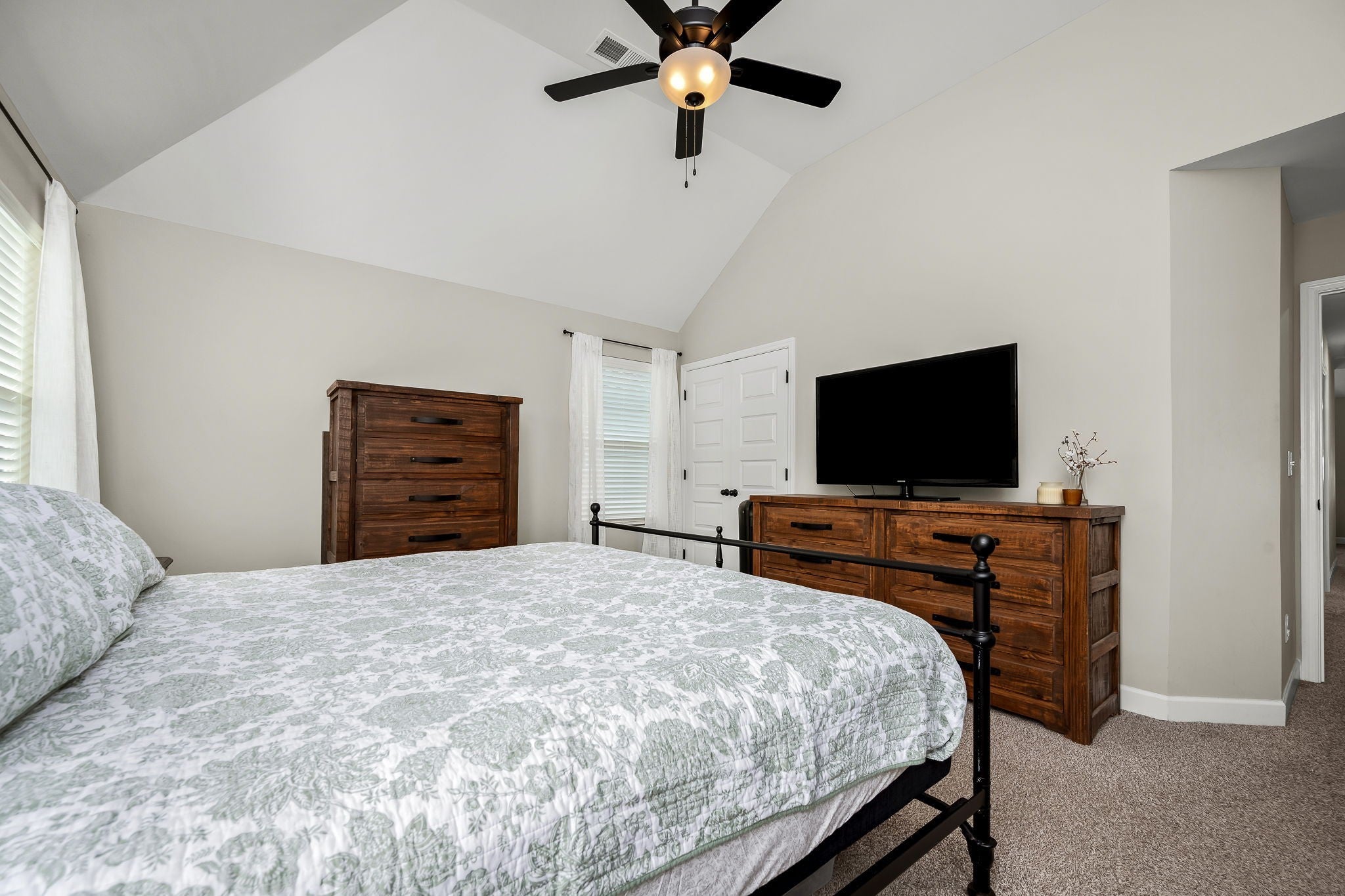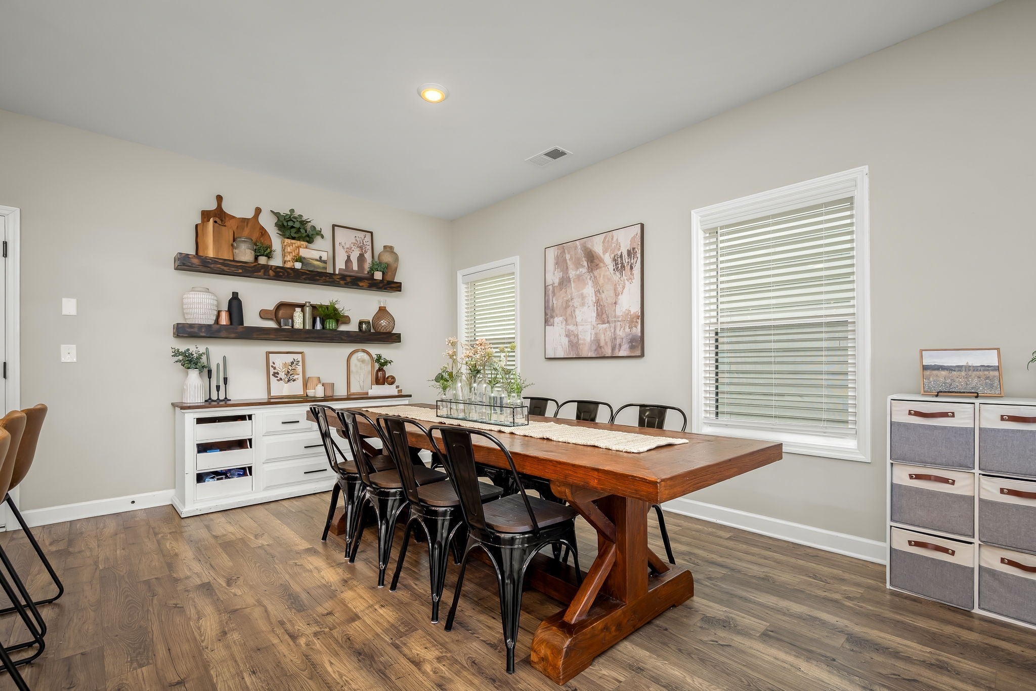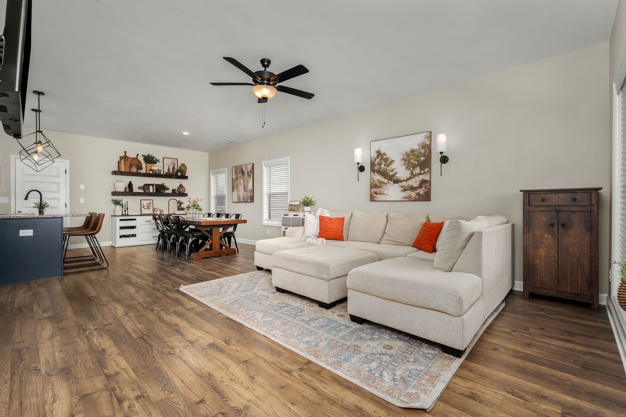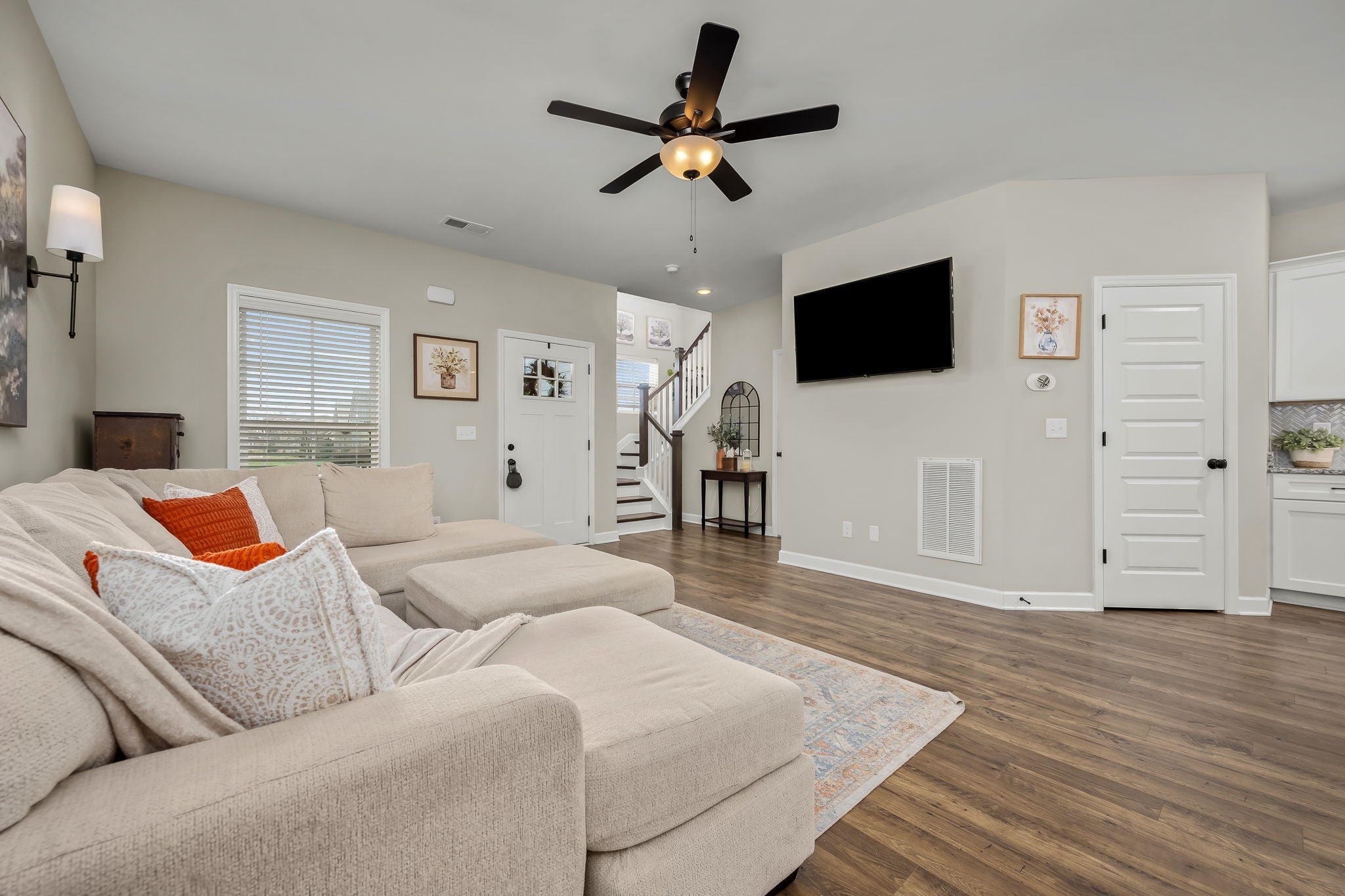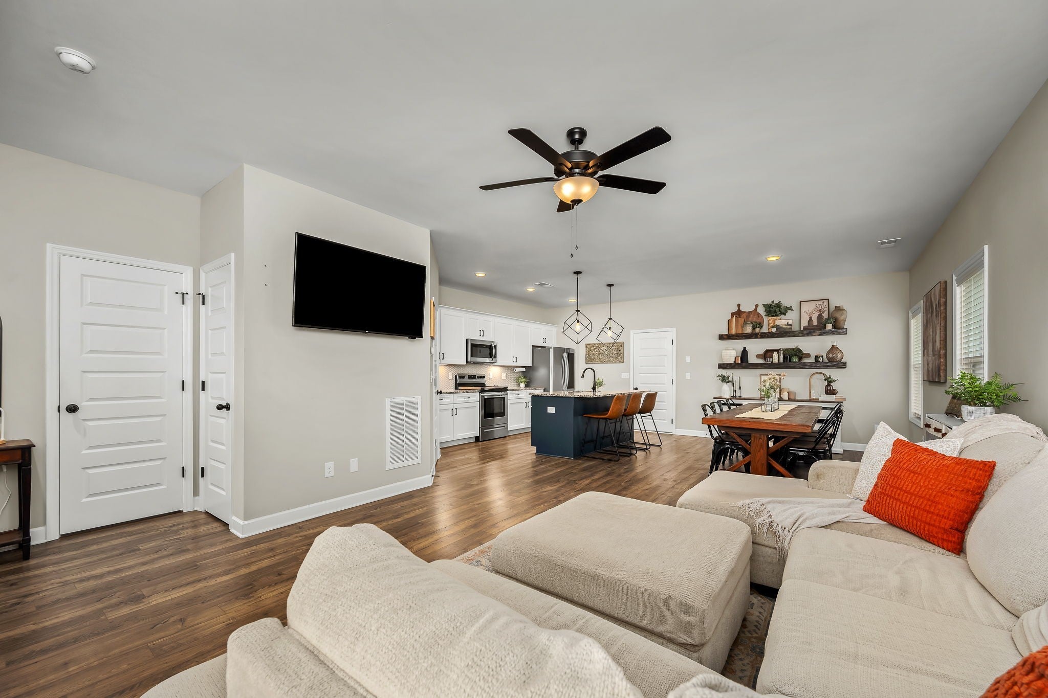 Welcome home to your next chapter, where classic charm meets modern comfort. Striking black-framed windows paired with white Hardie board create beautiful curb appeal, complemented by a rocking chair front porch with a tongue & groove ceiling, perfect for slow mornings & relaxing evenings. Inside, an open, light-filled living room welcomes you with beautiful flooring & soaring 9' ceiling. The heart of the home is a stunning kitchen designed for entertaining & everyday living, featuring stainless steel app., granite, white cabinetry with under cabinet lighting, herringbone backsplash, an accent island with bar seating, & a large walk-in pantry. The adjacent dining area includes floating shelves & is ideal for casual meals & hosting for the holidays. A convenient half bath & additional storage complete the main level. Upstairs, a versatile loft with a vaulted ceiling offers the perfect space to relax, gather, & enjoy movie nights, the big game, and more. The bright & airy owner’s suite is a true retreat featuring a vaulted ceiling, double vanities, walk-in shower with bench, walk-in closet, plus an additional closet. Inviting guest rooms include large double door closets, with an upgraded utility room conveniently nearby. This smart home is built for efficiency & comfort, featuring spray foam insulation, multi zone HVAC with smart Google Home thermostats allowing separate temperature control for both levels, Ring doorbell camera, AT&T/Google fiber internet, an insulated garage with built-in shelving, insulated smart garage door & decorative beam. Rear solar cell lighting adds to the home’s efficiency. Enjoy community amenities including a pool, a short distance away, with food trucks visiting throughout the year. Along with sidewalks and lawn maintenance included with dues. Conveniently located only 3.5 mi from the interstate & close to a vast amount of restaurants, shopping, & medical facilities. This is more than a home, it’s the lifestyle you have been waiting for.