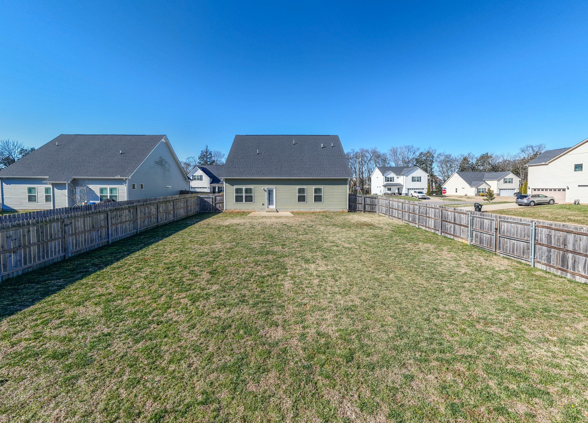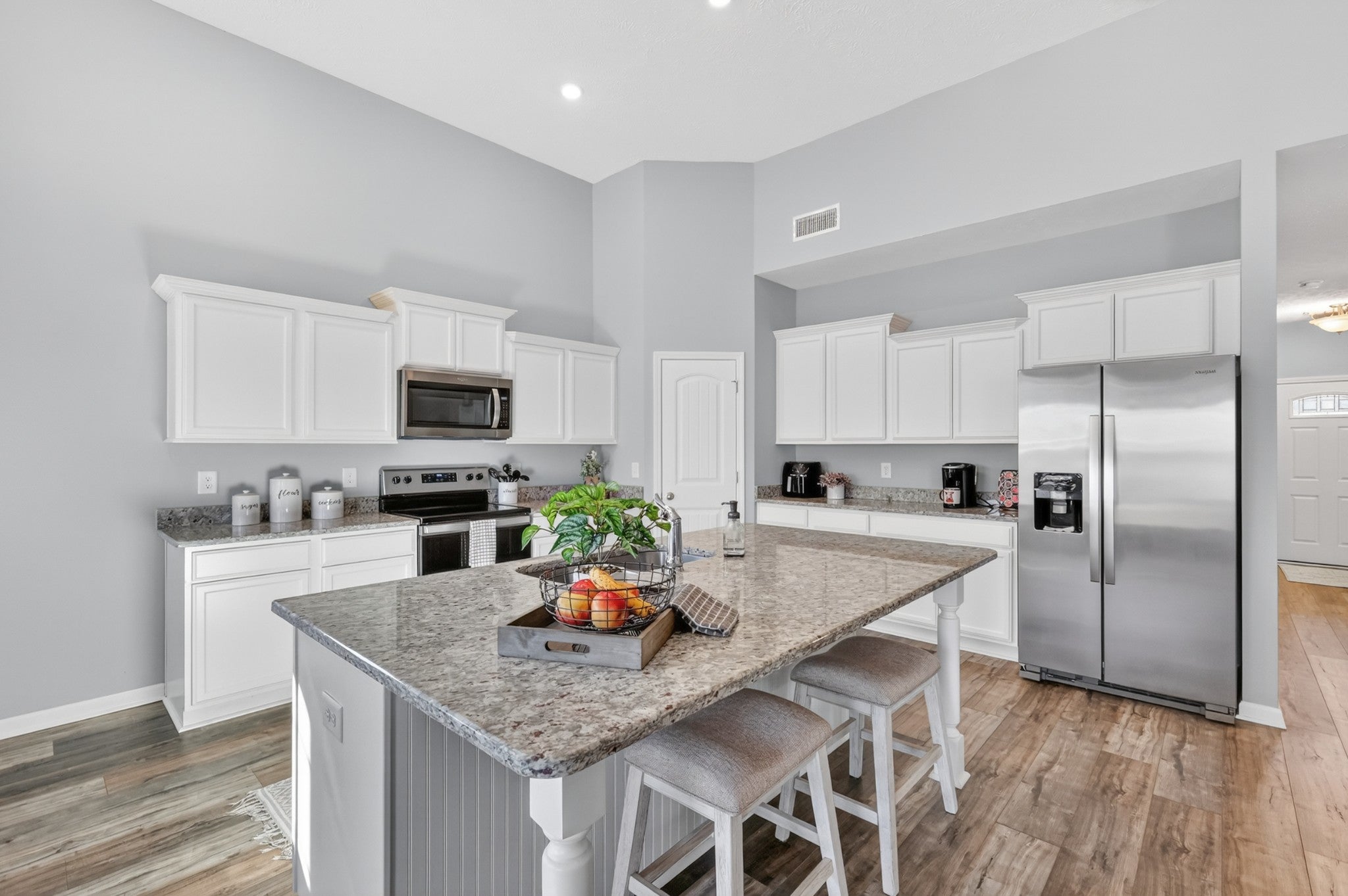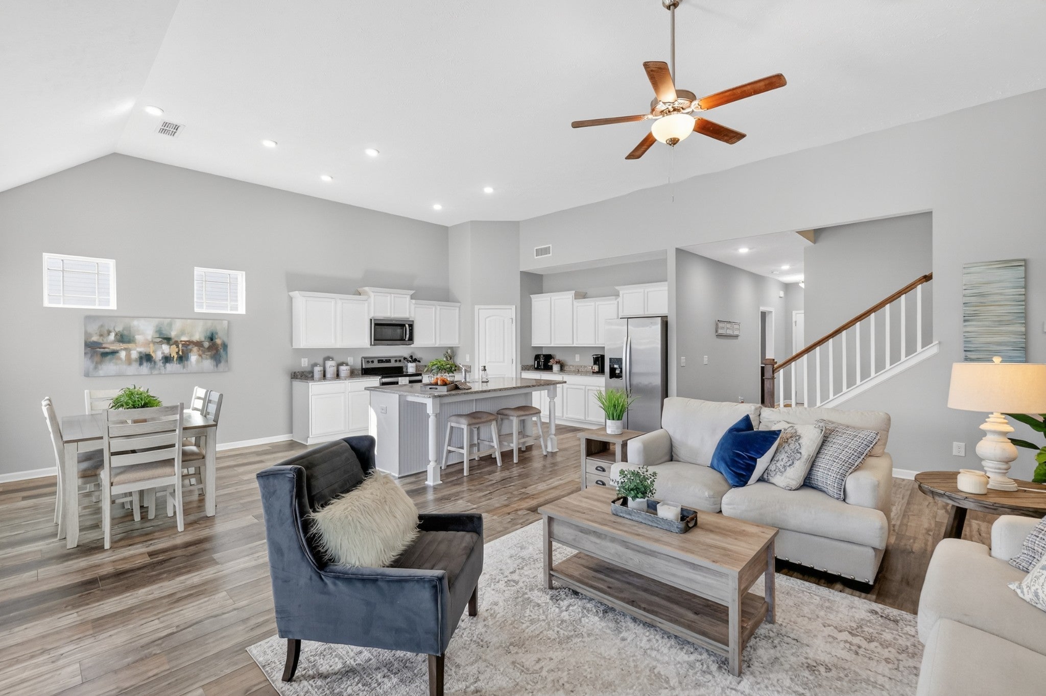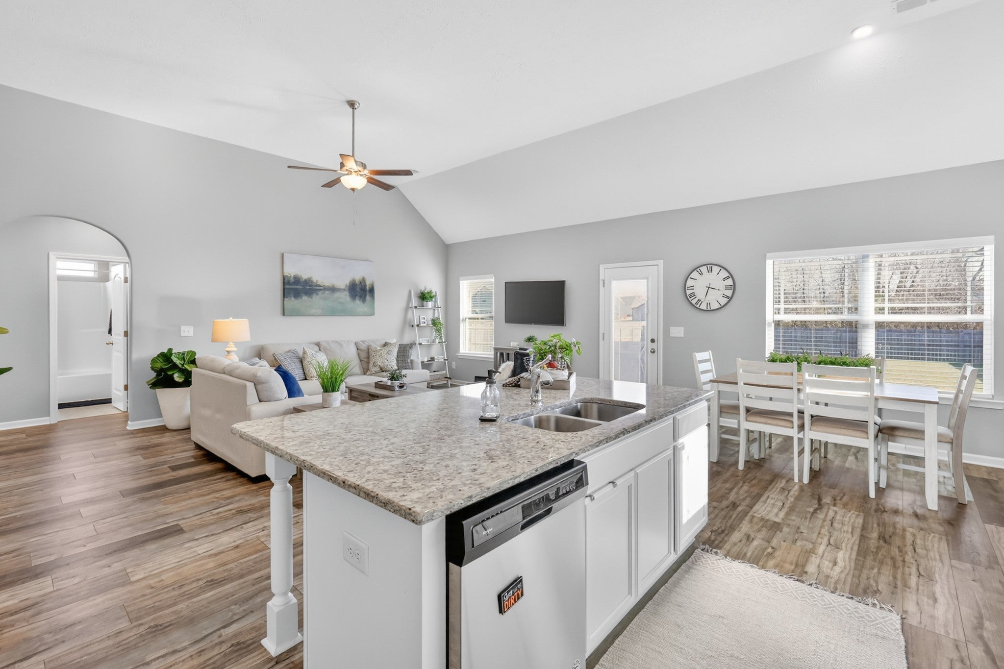 Thoughtfully designed living spaces feature laminate flooring throughout the kitchen, dining, and great room, creating a seamless and inviting flow. The kitchen is anchored by an expansive island, generous cabinetry, pantry storage, and stainless steel appliances—ideal for both everyday living and entertaining. The primary suite offers a private retreat with a spa-inspired bath showcasing extra counter space and a large walk-in shower. All bedrooms are conveniently located on the main level, including the primary suite and two additional zoned bedrooms, providing flexible living and privacy. Outdoors, a large fenced backyard enhances this desirable corner lot, offering both privacy and ample space for outdoor gatherings, pets, or play.