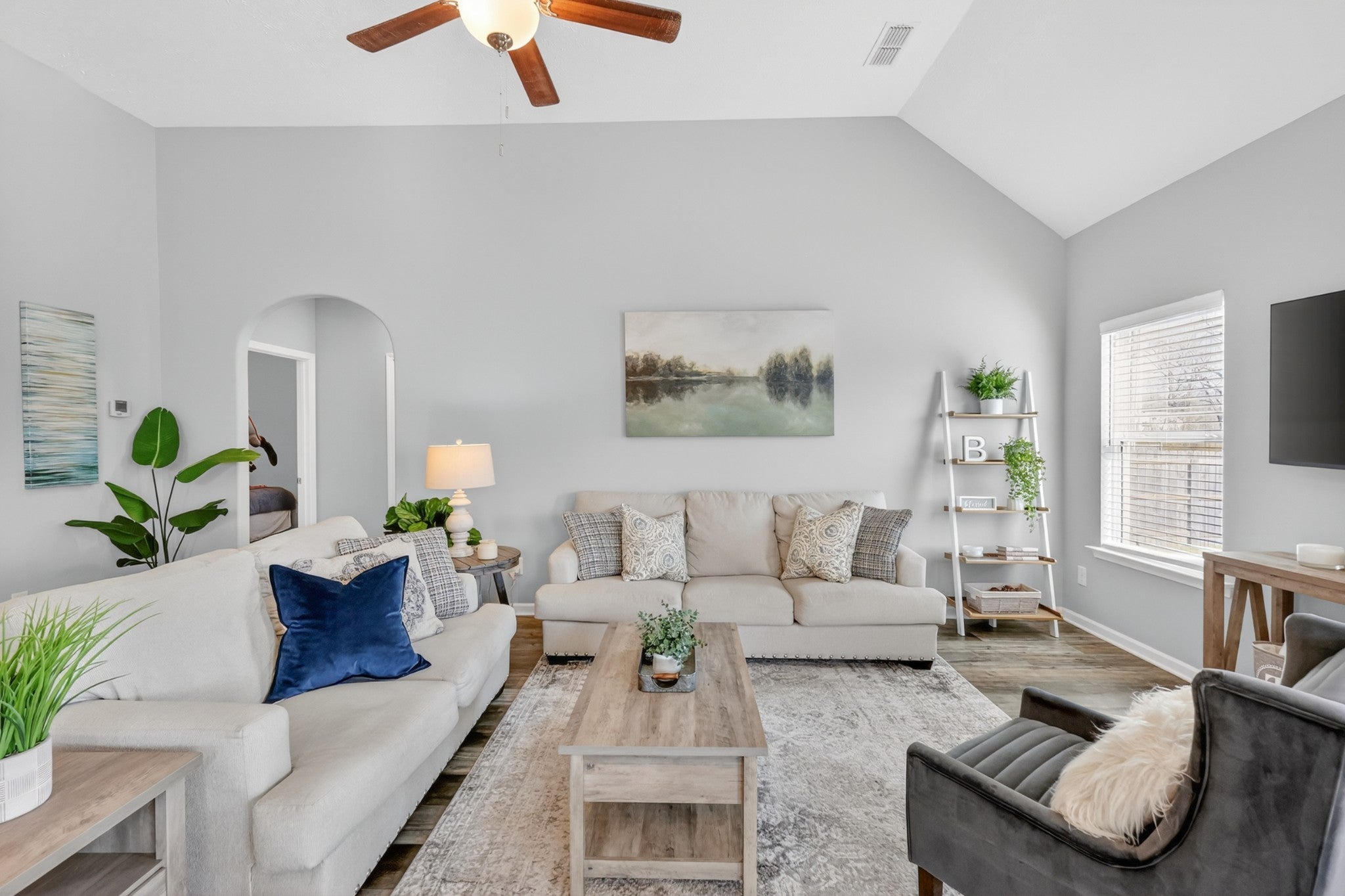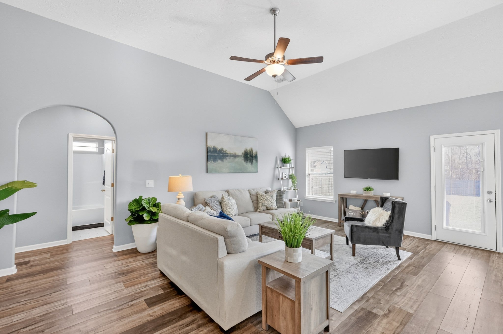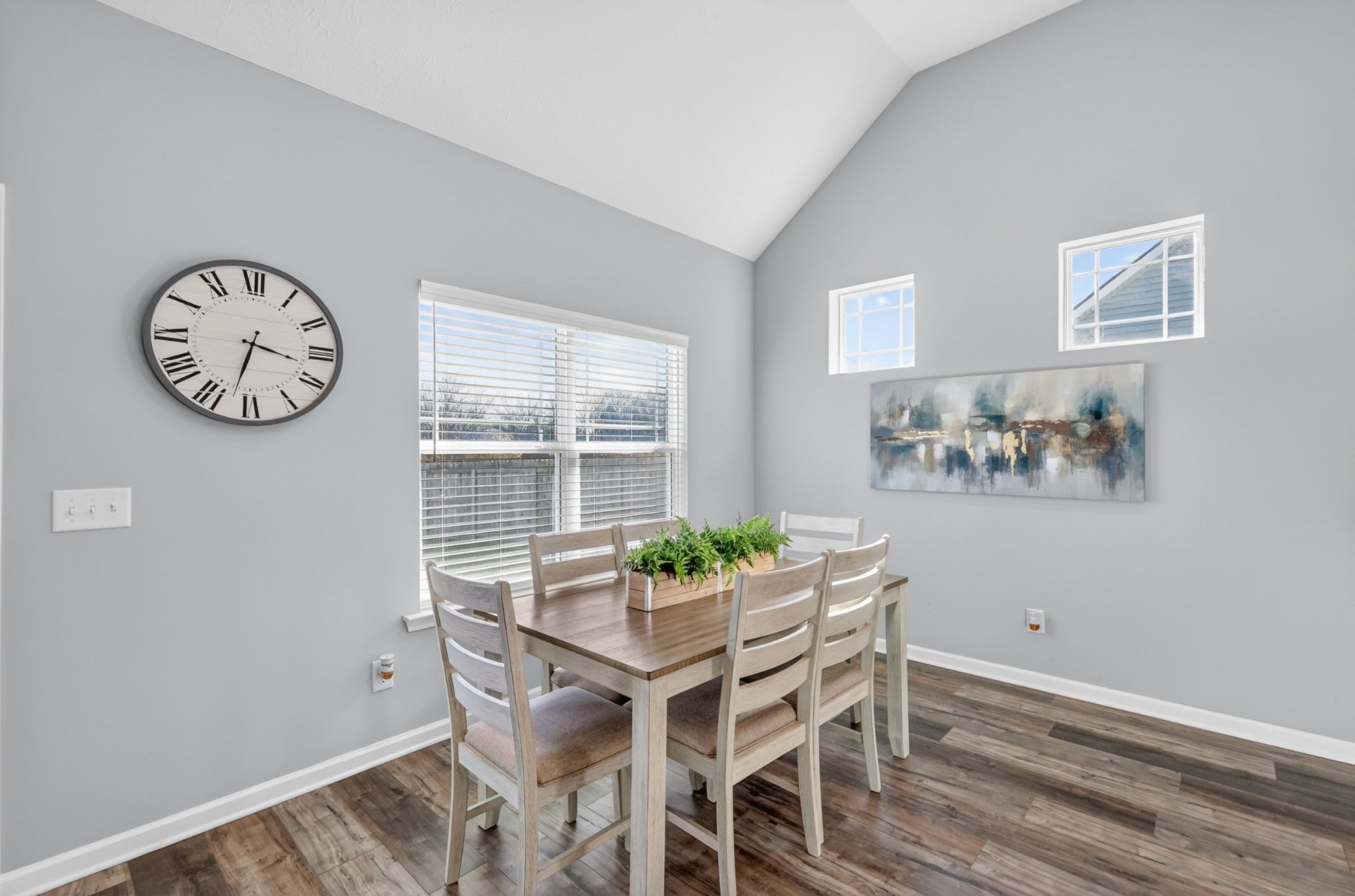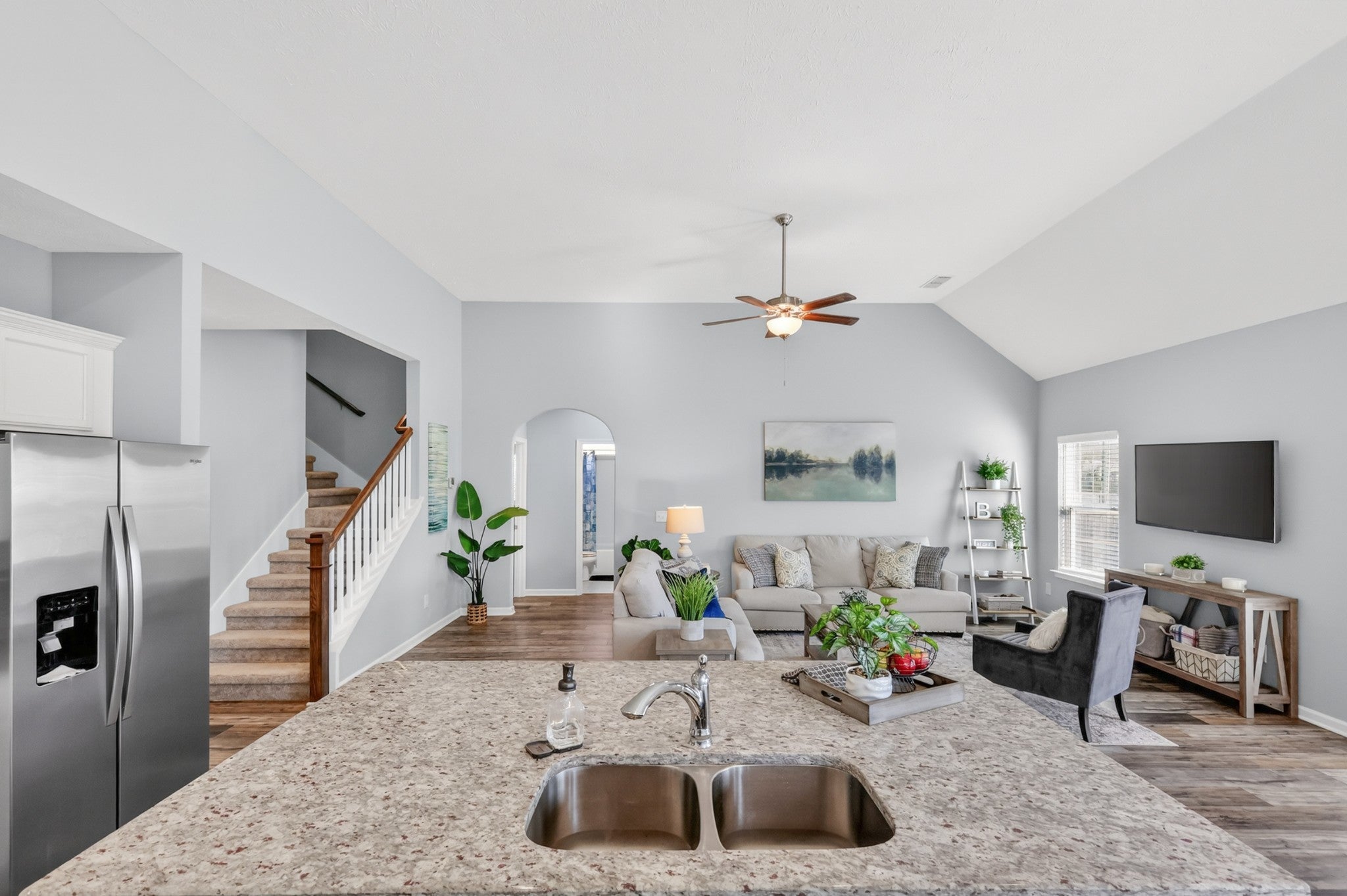 Thoughtfully designed living spaces feature laminate flooring throughout the kitchen, dining, and great room, creating a seamless and inviting flow. The kitchen is anchored by an expansive island, generous cabinetry, pantry storage, and stainless steel appliances—ideal for both everyday living and entertaining. The primary suite offers a private retreat with a spa-inspired bath showcasing extra counter space and a large walk-in shower. All bedrooms are conveniently located on the main level, including the primary suite and two additional zoned bedrooms, providing flexible living and privacy. Outdoors, a large fenced backyard enhances this desirable corner lot, offering both privacy and ample space for outdoor gatherings, pets, or play.