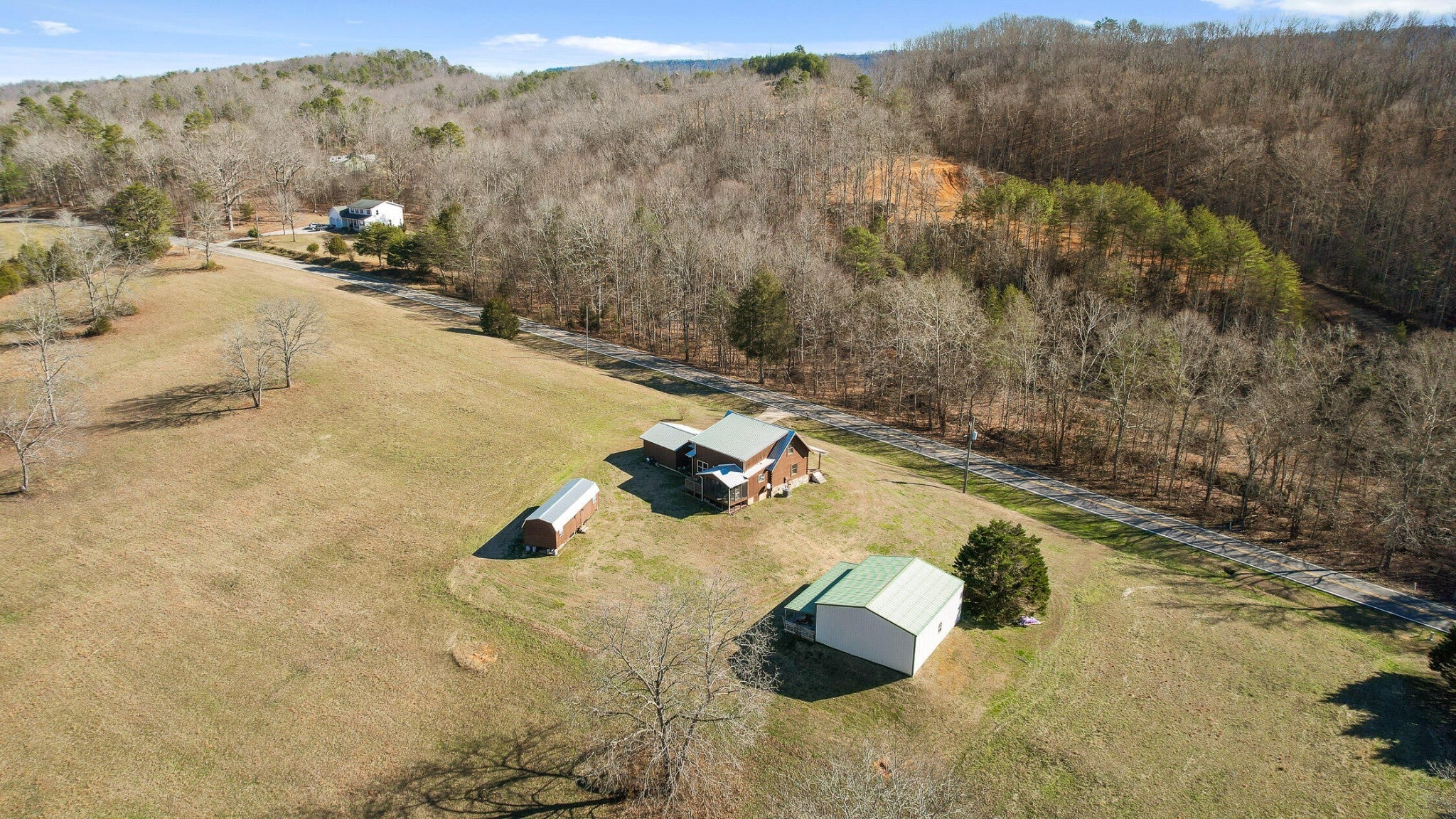 Tucked away on nearly three peaceful acres just minutes from Trenton Golf Club, this warm and welcoming cabin-style home invites you to slow down and breathe. From the moment you pull in, the rocking chair front porch feels like an open invitation to sit, stay awhile, and enjoy the quiet.Step inside to a spacious living room that immediately feels like home. The open layout flows effortlessly into the kitchen and dining area, creating a space where everyday moments and special gatherings happen naturally. From the dining room, doors lead you outside to a covered 10x14 back porch and an additional 10x14 screened porch, giving you the freedom to enjoy the outdoors in every season. Morning coffee, evening conversations, and long weekends feel right at home here. A powder room on the main level makes hosting friends and family easy and comfortable.The primary suite on the main level offers a true retreat, complete with three closets and a private ensuite bathroom. It's a space designed for rest and simplicity at the end of the day. Upstairs, two additional bedrooms offer generous storage and share a full bathroom. A walk-out storage area of approximately 300 square feet provides incredible flexibility, whether you keep it as storage or imagine finishing it into something more.Outside, the possibilities continue. A large detached building with a roll-up door and built-in shelving is perfect for hobbies, projects, or a workshop you've always wanted. A second finished building with its own mini-split system opens the door to endless options: a guest space, home gym, creative studio, or something uniquely your own.Whether you're dreaming of room to roam, space to grow, or the potential to build something new, this property offers freedom to make it your own. All of this, just minutes from Trenton and an easy 25-minute drive to Chattanooga, makes this a rare opportunity to enjoy both privacy and convenience. This is more than a home it's a place to create a life.
