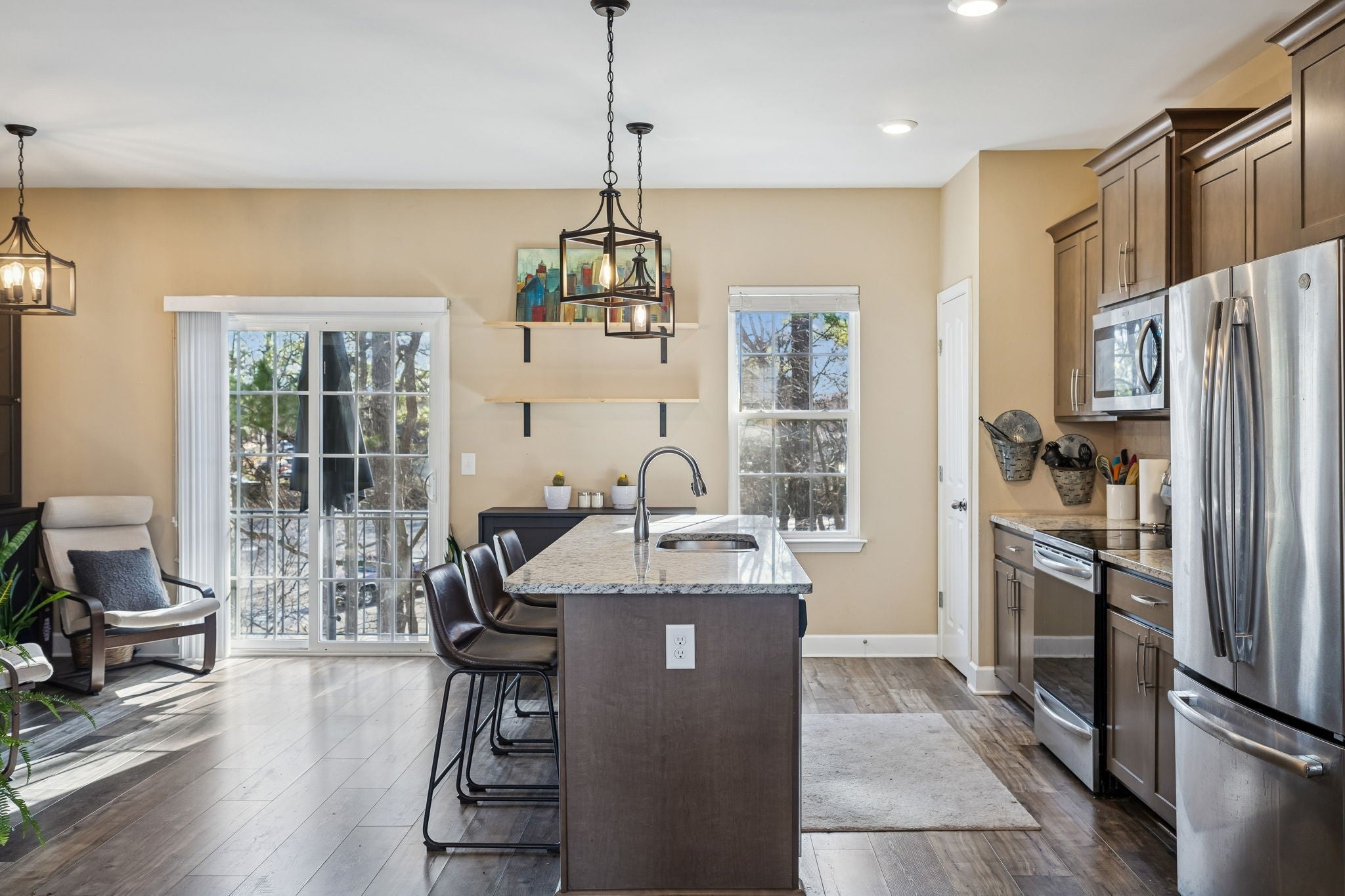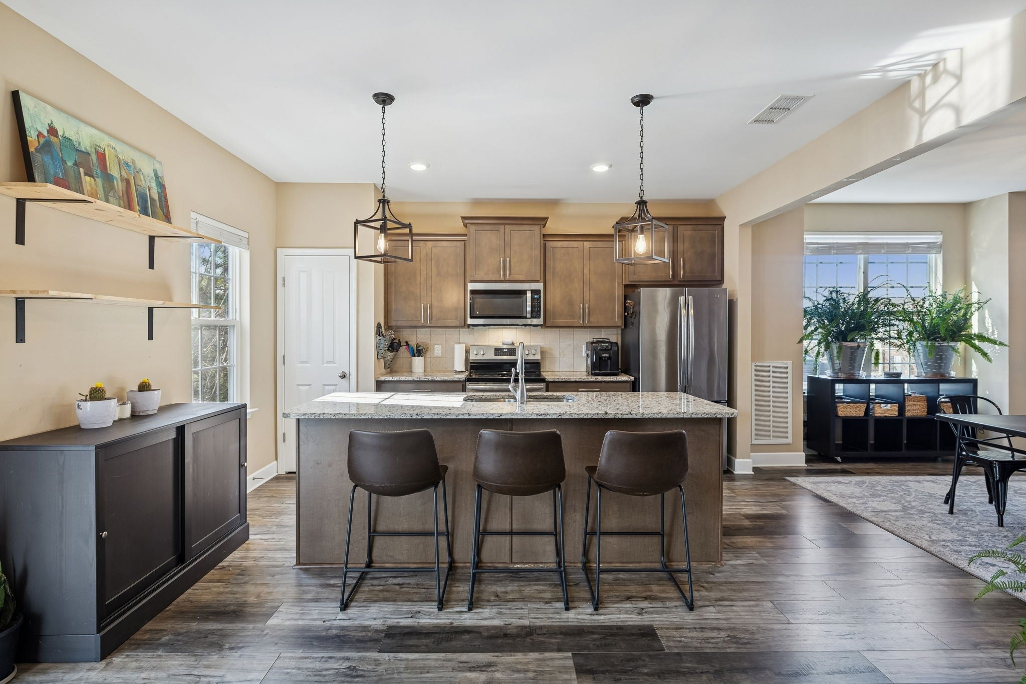 RARE LIVE/WORK TOWNHOME — thoughtfully designed to allow you to operate a business from the first floor while living comfortably on the second and third floors. This is a unique opportunity for an entrepreneur or professional to work from home, eliminate the cost of renting commercial space, and put that money toward your mortgage instead. Welcome to 1035 Avery Park Dr, a 2019 end-unit townhome in the desirable Lenox of Smyrna community. Purpose-built as a live/work residence, the first-floor flex space is ideal for a variety of office or retail uses, while the upper levels function as a spacious, modern home filled with natural light. This 3-bedroom, 2 full bath, 2 half bath townhome offers 2,148 square feet of living space with a super open layout and excellent quality construction — you won’t hear neighboring units. As an end unit, the home features tons of windows and abundant natural light throughout. The second floor showcases an open-concept kitchen, dining, and living area with LVP flooring and ceramic tile throughout (no carpet), granite countertops, and access to three large balconies — one off the kitchen/breakfast nook and two off the living room. Upstairs, the bedrooms are generously sized and well laid out. A sliding barn door separates the first-floor flex space from the main living areas, creating true work-life separation. The semi-finished garage provides bonus square footage not included in the 2,148 sq ft — perfect for additional workspace, storage, or studio space — and can easily be converted back to a traditional garage. Fresh exterior paint, a tree-lined neighborhood entrance, and a quieter interior location enhance the setting. Conveniently located just off I-24, you’re 30 minutes to Nashville or BNA, 5 minutes to the Nissan plant, and 15 minutes to Murfreesboro. With Smyrna’s continued growth, this home offers strong long-term value and an ideal setup to run a small business from home.