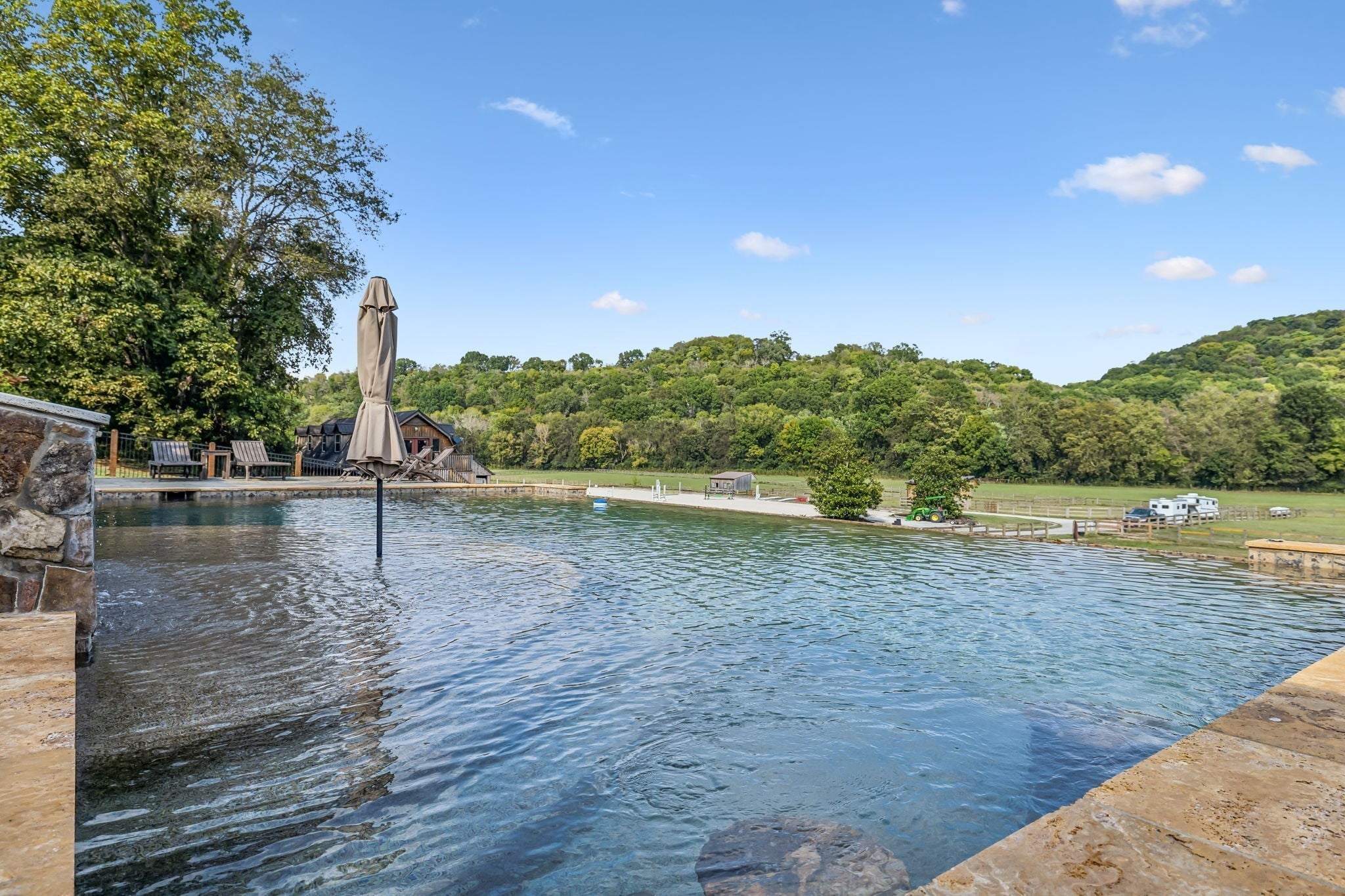 Discover the rare opportunity to own a breathtaking 16+ acre riverfront equestrian masterpiece—where timeless rustic charm meets sophisticated modern luxury, all perfectly tailored for the discerning horse enthusiast. This exquisite modern Craftsman Farmhouse welcomes you with glowing hardwood floors, a chef’s galley style kitchen featuring premium Viking stainless steel appliances, three inviting fireplaces, and two serene screened porches ideal for morning coffee or evening relaxation. Step outside to your private infinity-edge pool, where the water seamlessly blends into sweeping views of rolling pastures and the tranquil river beyond—an unparalleled setting for both serenity and celebration. For the dedicated equestrian, the property delivers world-class facilities: two cutting-edge barns offering 15 generously sized stalls complete with automatic watering systems, dedicated tack rooms, feed storage, a separate equipment barn, and comfortable on-site staff quarters. The stalls alone command $1,500+ per month in premium boarding revenue. Extensive cross-fenced paddocks provide ample turnout space, while the professional outdoor arena—featuring high-end imported footing—sets the stage for serious training and competition. This estate has already captured Hollywood's attention, recently serving as a premier filming location for an upcoming major motion picture. Properties with such film credentials frequently attract ongoing lucrative production opportunities. The expansive grounds easily accommodate multiple tour buses, making it an exceptional venue for musicians, large-scale events, weddings, or exclusive gatherings. Whether your vision includes lavish entertaining, elite equestrian pursuits, or simply embracing peaceful privacy, this rare gem delivers it all—while remaining just minutes from the charm of downtown Franklin and Leiper’s Fork, with Nashville's vibrant energy only a swift 20-minute drive away.