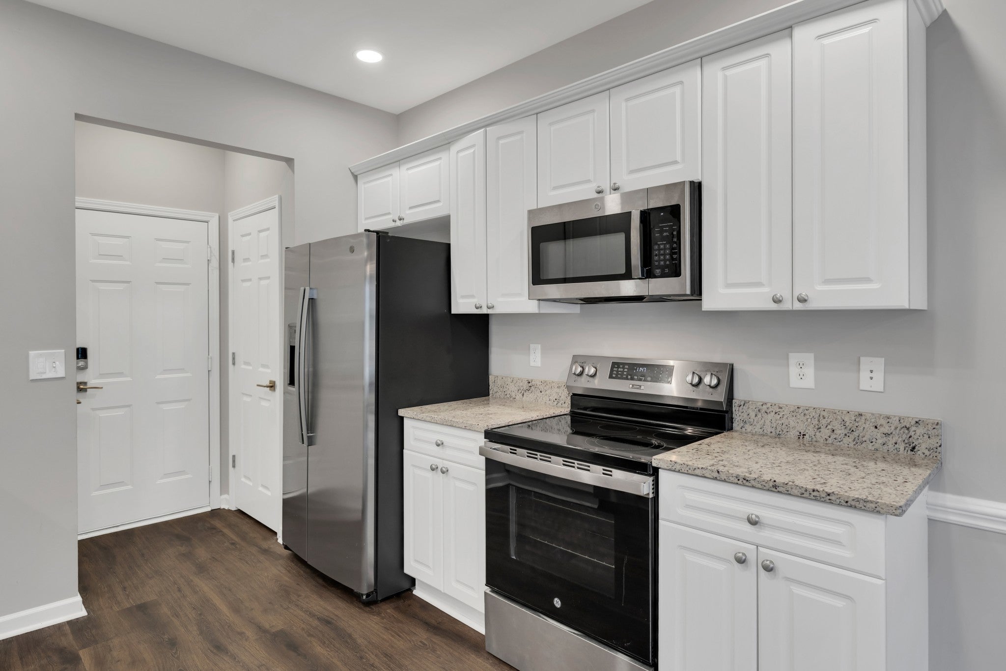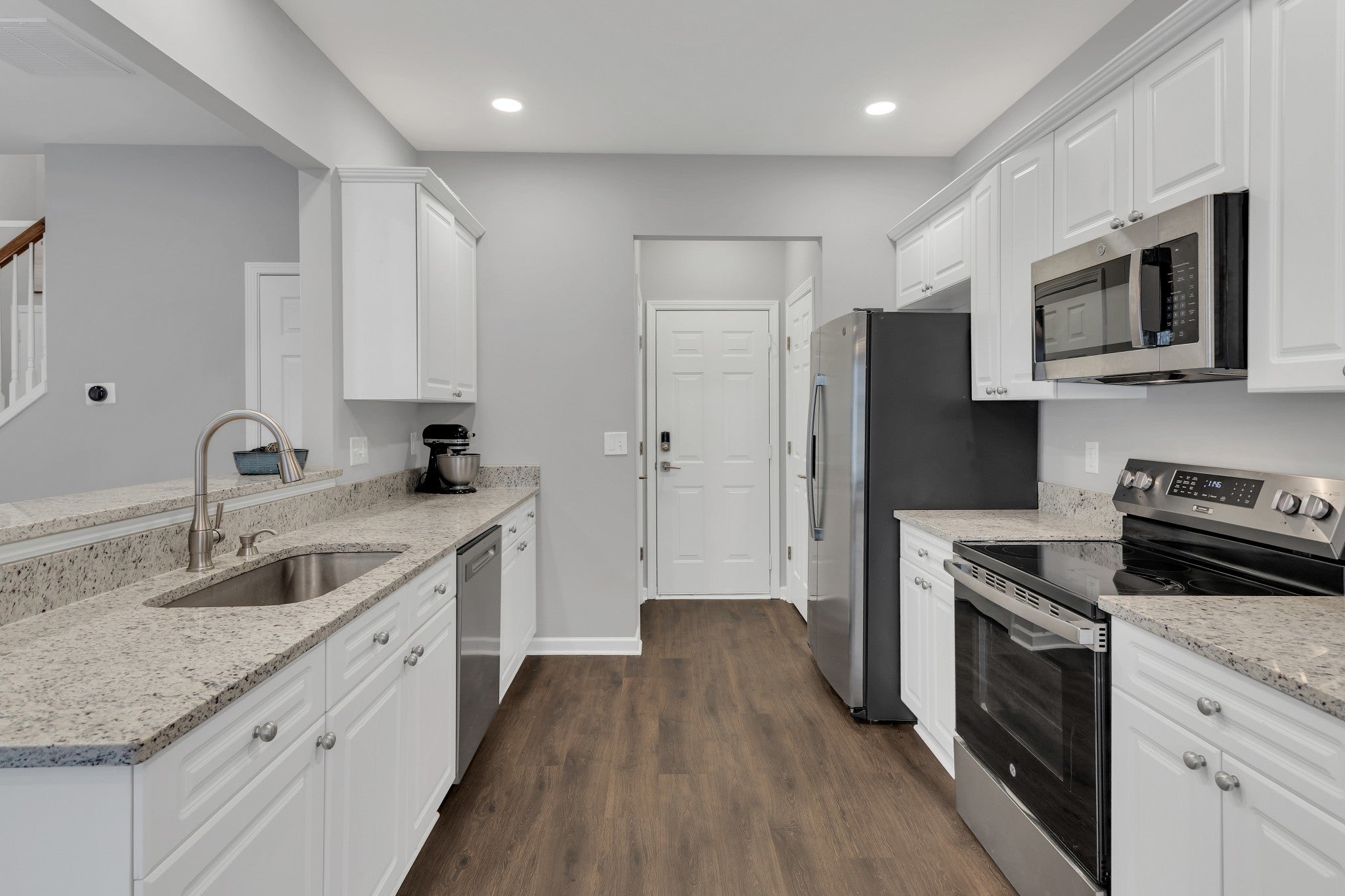 - Electric Oven, Electric Range, Dishwasher, Disposal, Microwave, Refrigerator, Stainless Steel Appliance(s), Washer