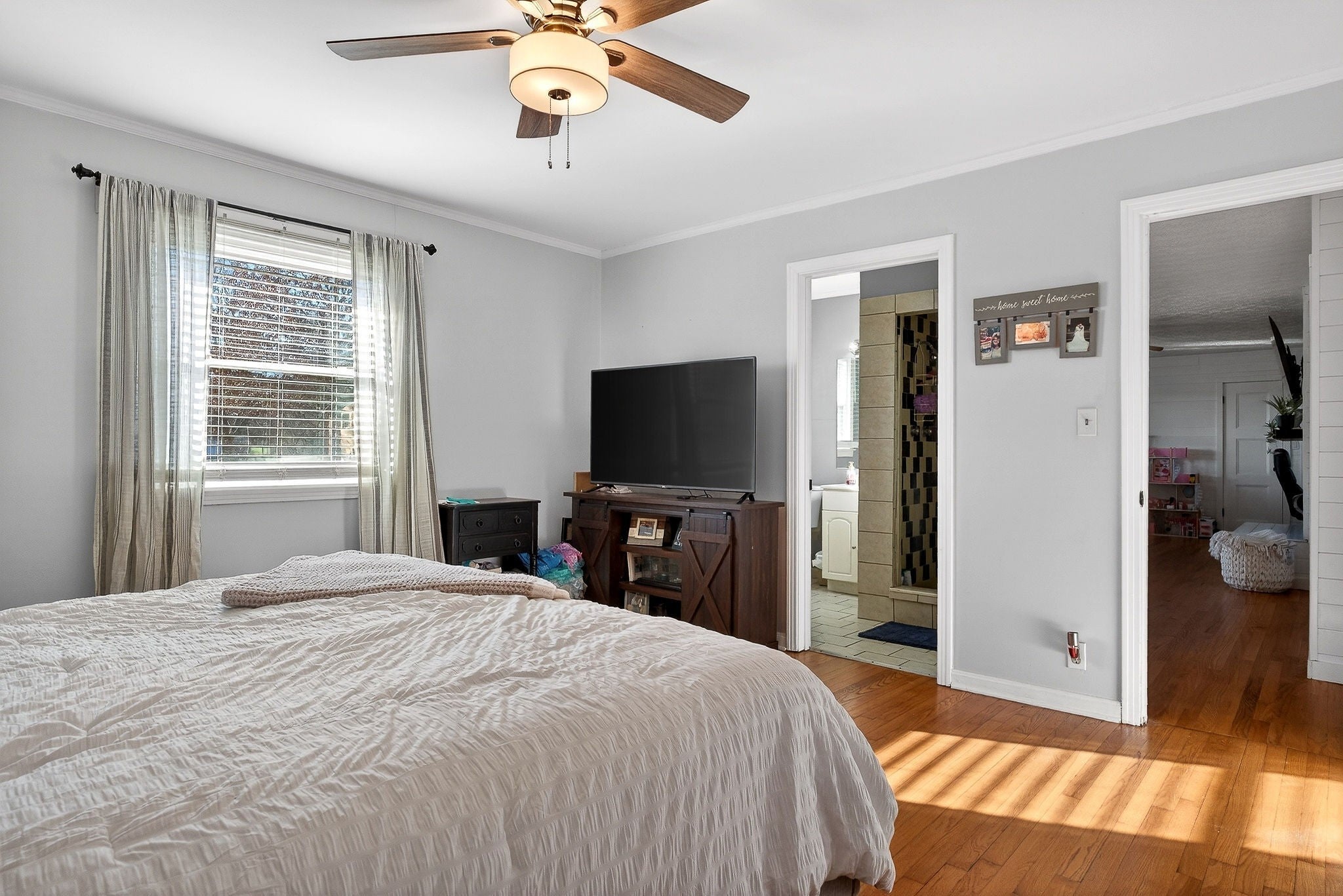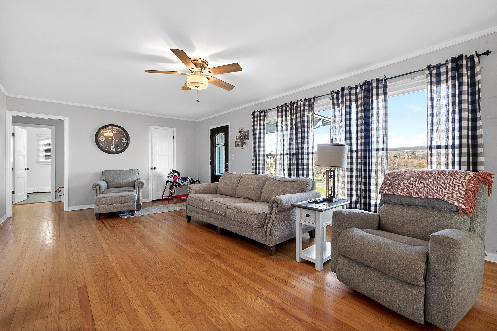 Welcome to this well-maintained and thoughtfully updated home offering comfort, space, and functionality both inside and out. From the moment you arrive, you’ll appreciate the inviting curb appeal, level yard, and covered front porch—perfect for relaxing mornings or evening gatherings.Inside, the home features hardwood floors, bright neutral finishes, and a spacious layout ideal for everyday living and entertaining. The living room is warm and welcoming, highlighted by a modern fireplace and abundant natural light. Multiple living areas provide flexibility for family space, a home office, or hobby rooms.The large eat-in kitchen offers ample cabinetry, generous counter space, and room for a full dining set—perfect for hosting holidays and family meals. Bedrooms are generously sized with plenty of storage, and the bathrooms have been tastefully updated with modern fixtures and finishes.Step outside to enjoy the covered back porch overlooking the backyard, ideal for outdoor entertai