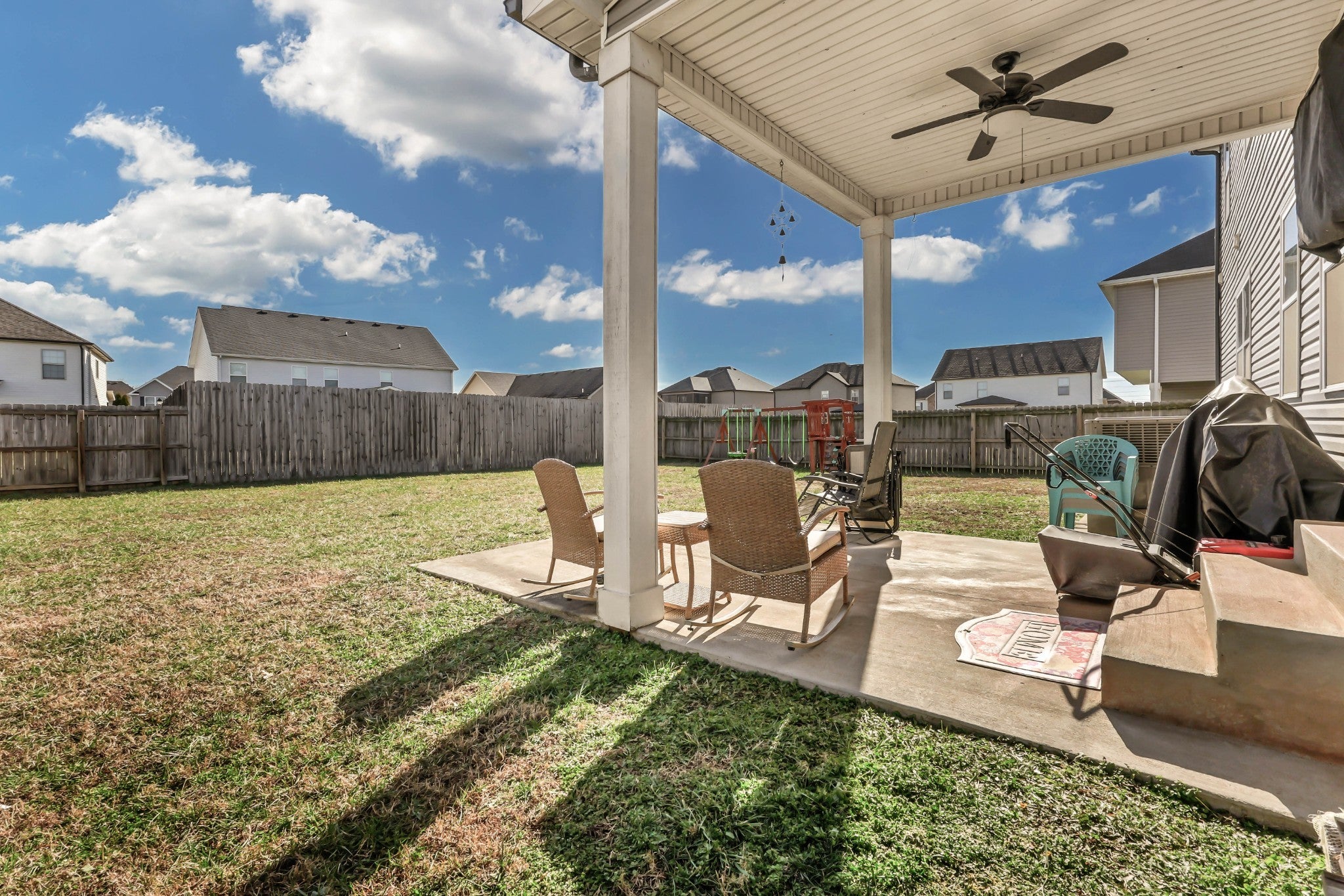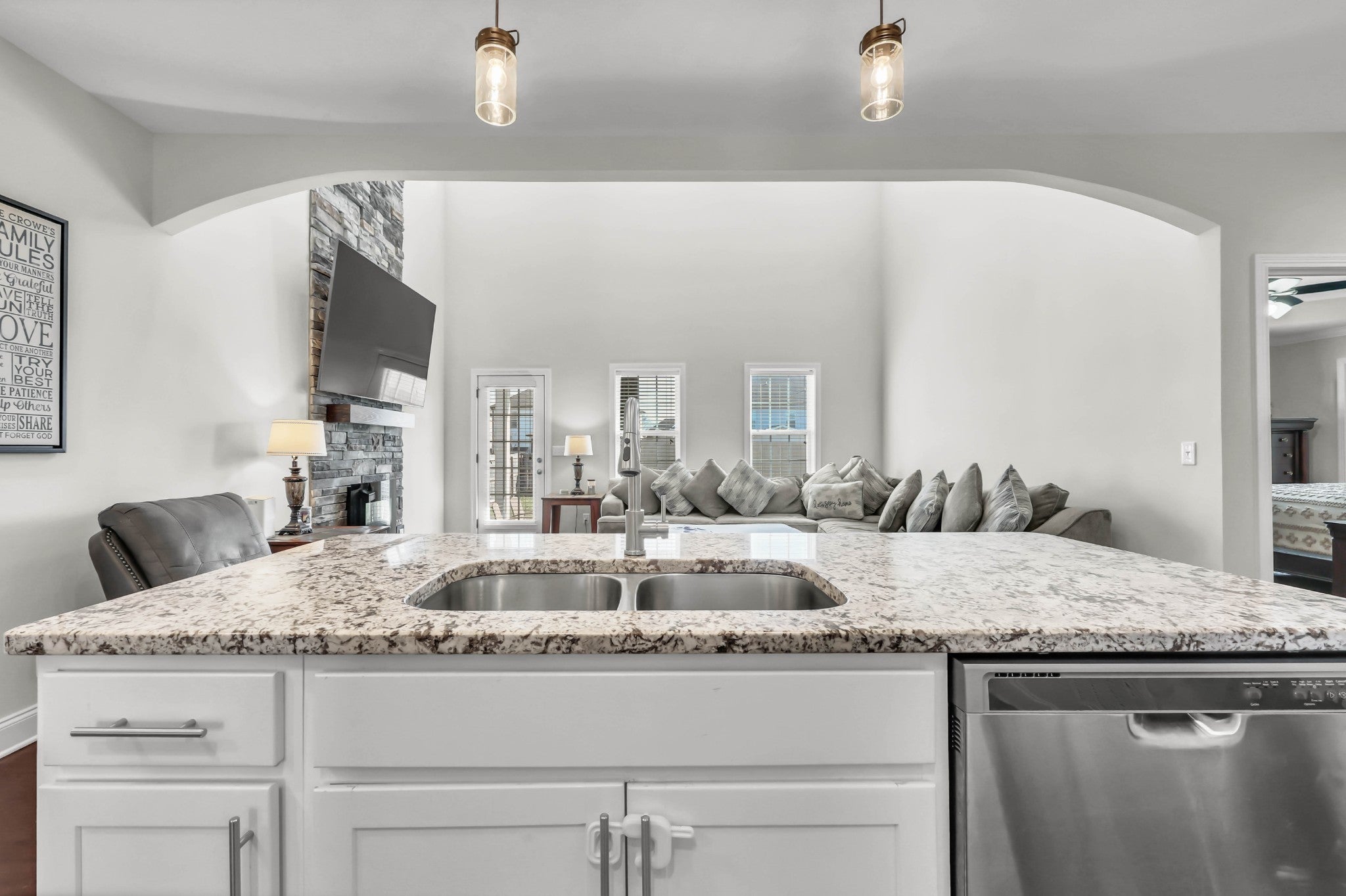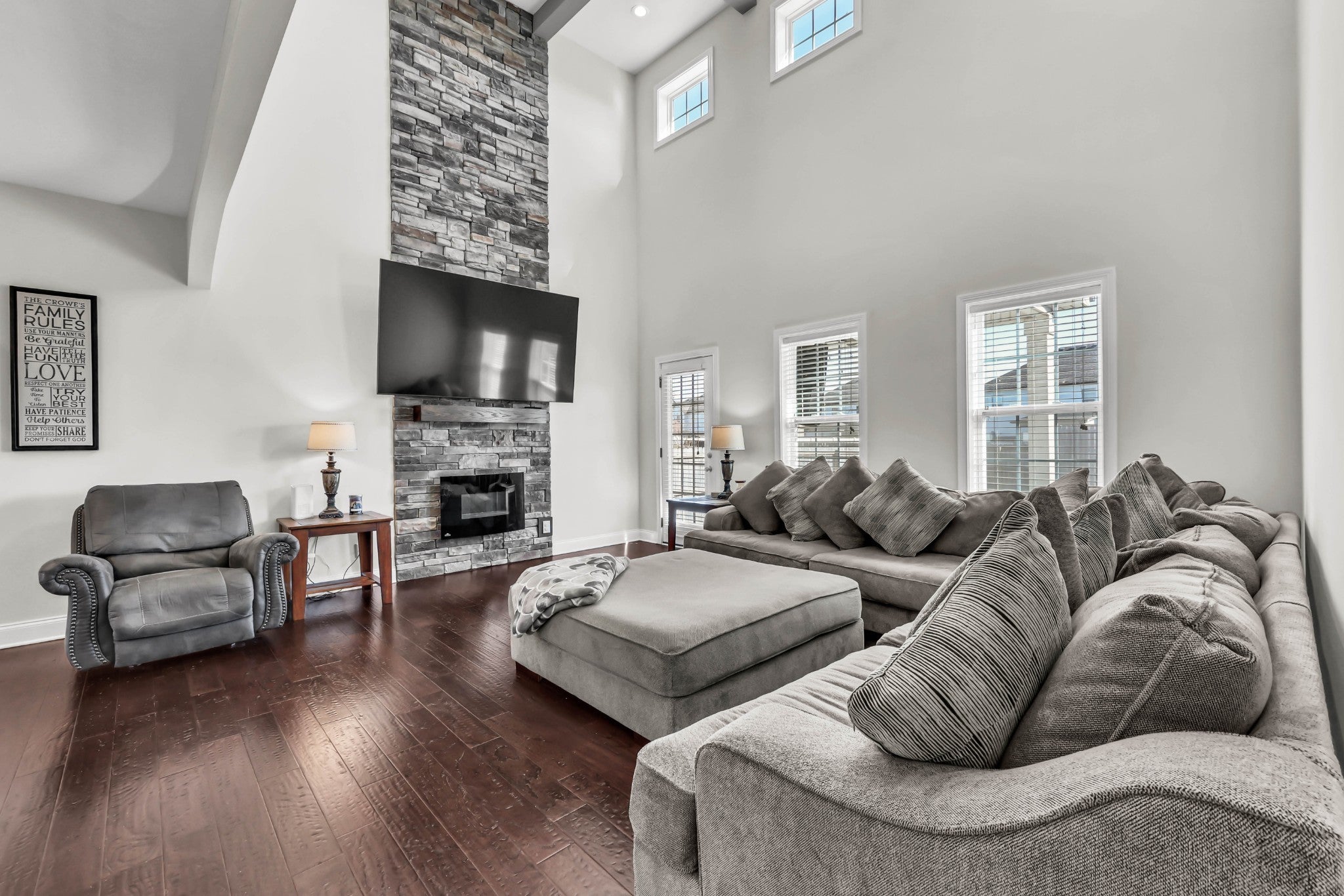 Welcome home to this beautiful 5-bedroom, 2.5-bath property in a prime location! Freshly painted and filled with natural light, this open-concept home features soaring ceilings and a stunning living area anchored by a stone fireplace. The gorgeous kitchen flows seamlessly into the living room and offers granite countertops, ample cabinetry, and an ideal layout for entertaining. The spacious primary suite is conveniently located on the main level and includes double vanities, a relaxing soaker tub, tiled shower walls, and a walk-in closet. Upstairs, enjoy a second-story landing that overlooks the living room, adding to the home’s airy feel. Additional highlights include a large laundry room with utility sink, a fenced backyard, and an unbeatable location just off the interstate in a highly sought-after school zone. This one checks all the boxes — don’t miss it!