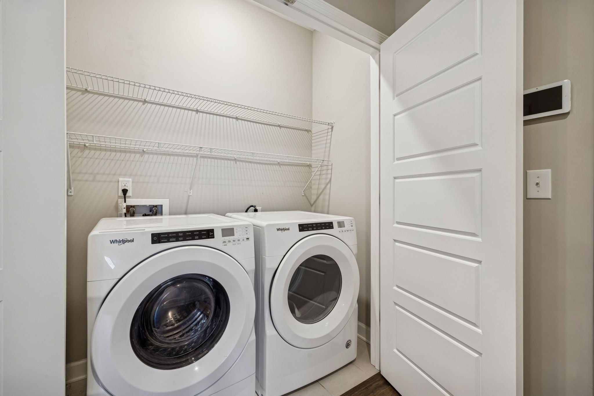 - Electric Range, Dishwasher, Disposal, Dryer, Microwave, Refrigerator, Stainless Steel Appliance(s), Washer