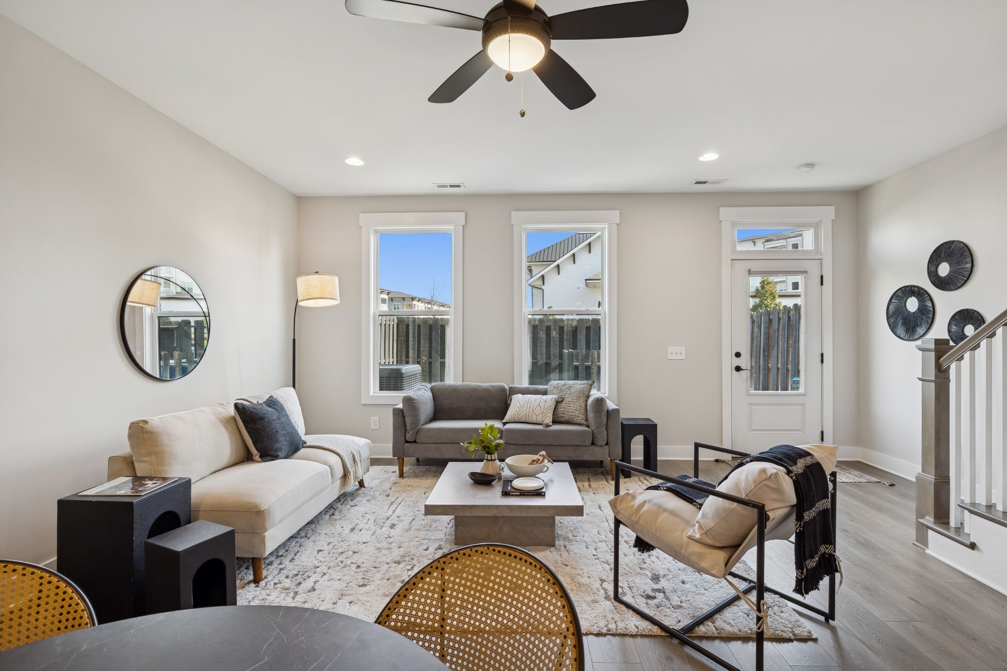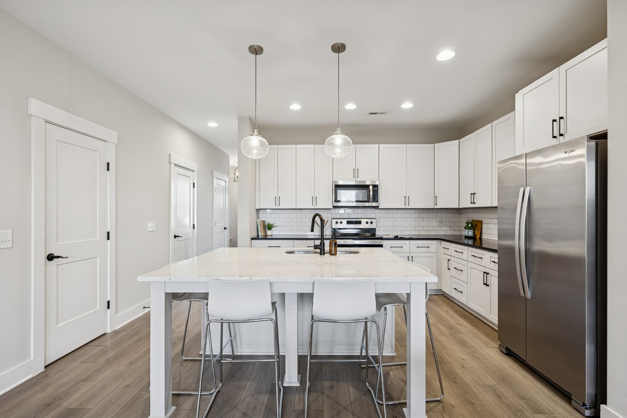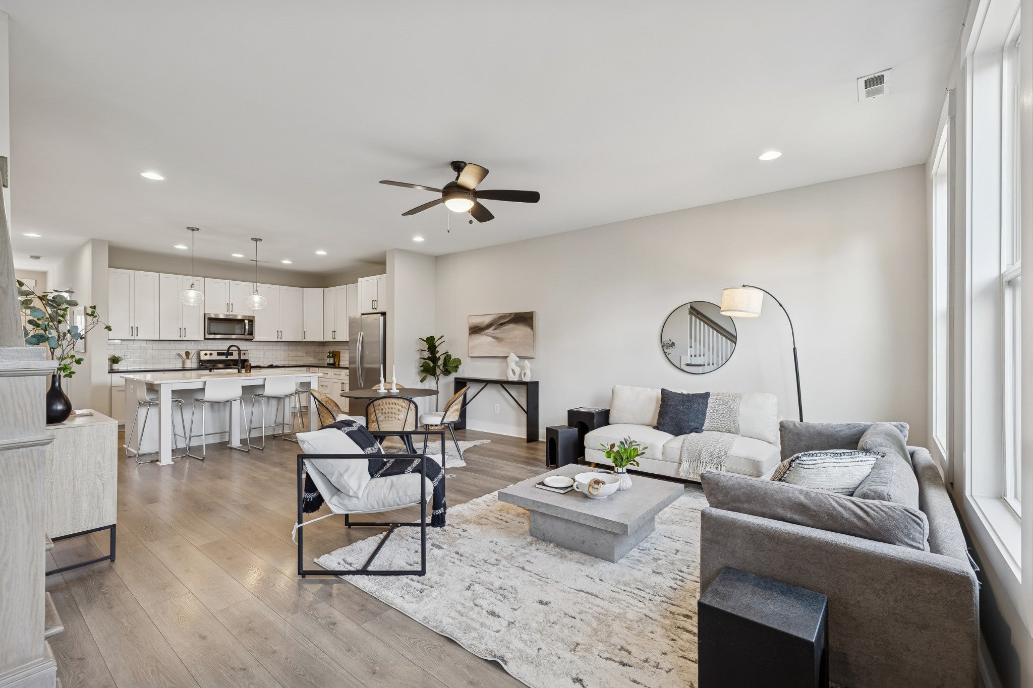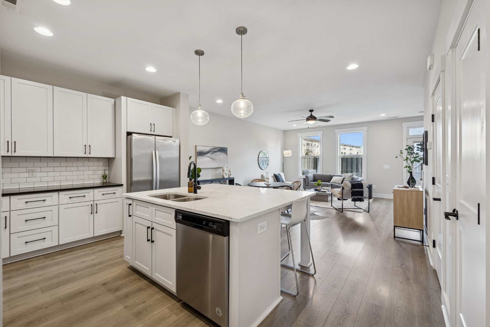 Modern, bright, and designed to actually live in, this 2020-built East Nashville townhome delivers space, style, and a layout that feels intentional from the moment you walk in. Freshly painted throughout, the home has a clean, polished feel that’s truly move-in ready. The main level is open and expansive with 9’ ceilings and a surprisingly large living area that’s flooded with natural light. The kitchen is both sharp and functional, featuring white cabinetry, quartz countertops, subway tile backsplash, a walk-in pantry, and a generous island with seating that naturally becomes the centerpiece of the space. Neutral flooring runs throughout the main floor, giving it a cohesive, modern look that’s easy to maintain. A dedicated office or flex space plus a thoughtfully designed entry drop zone add everyday practicality without sacrificing style. Upstairs, both bedrooms are true en suites with great proportions and excellent closet space. The primary suite stands out with a well-designed walk-in closet and a spa-inspired bathroom complete with a double vanity, tiled walk-in shower, and clean designer finishes. A full laundry room, linen storage, and additional attic space make the upstairs both comfortable and functional. Outdoor space is private and purposeful, with a covered front porch and a fenced rear courtyard — ideal for morning coffee, pets, or unwinding after a long day. Two assigned parking spaces are located just steps from the home. This is a well-designed, low-maintenance home that lives larger than expected and checks all the boxes for modern East Nashville living.