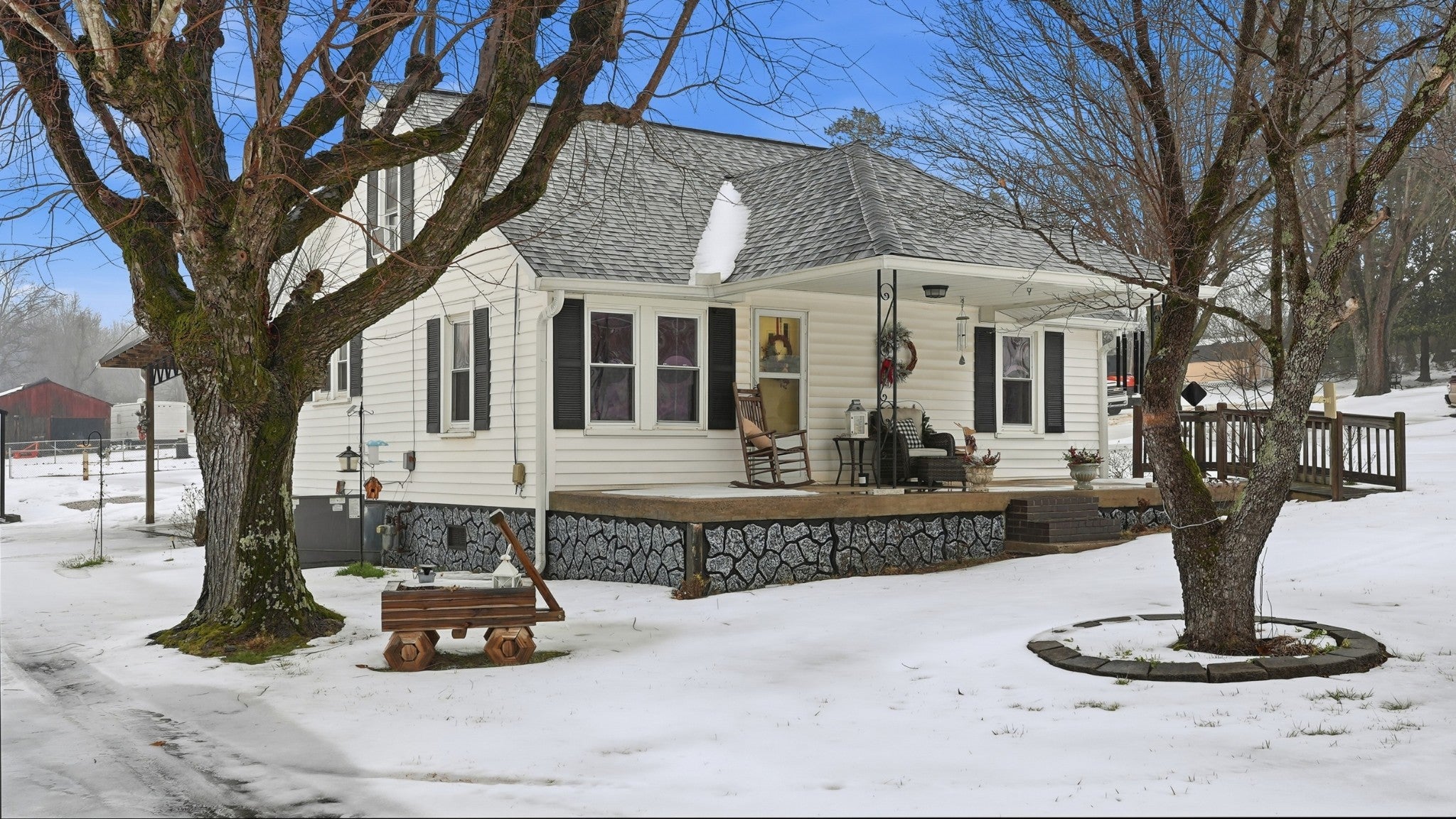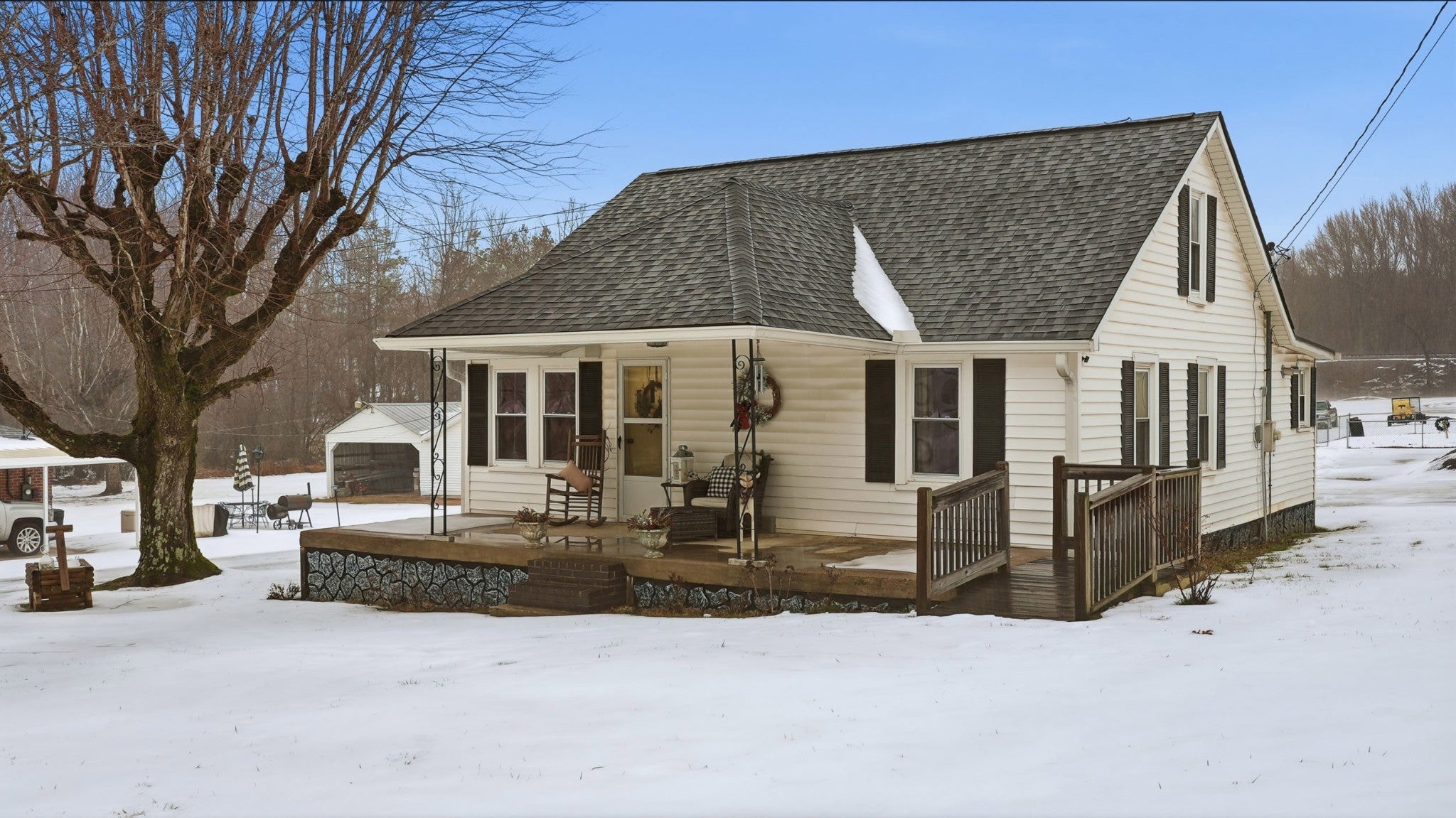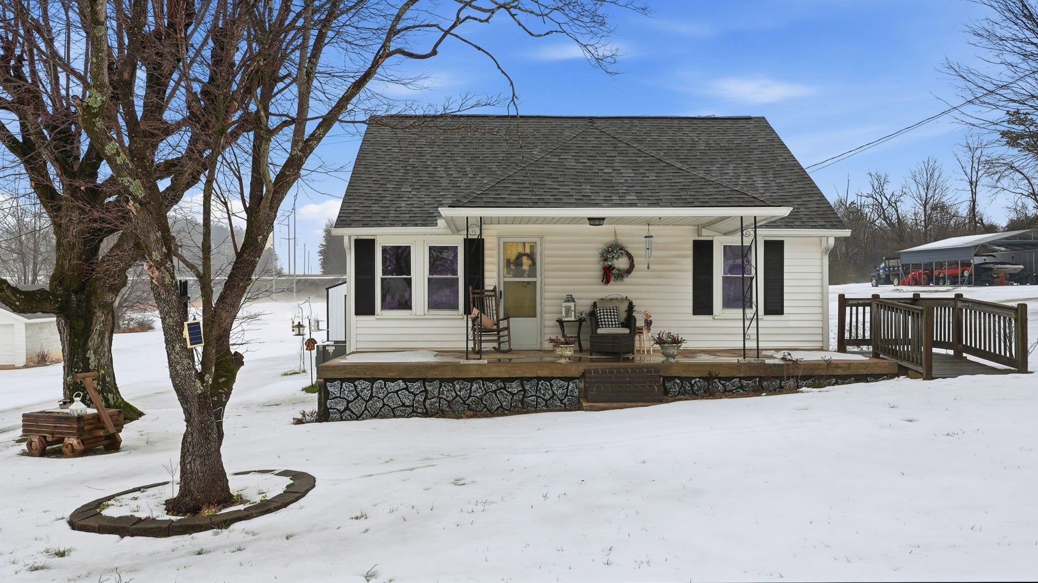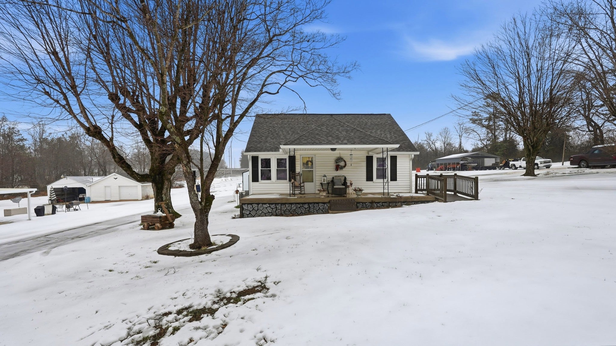 Step into a slice of pure americana with this pristine white cottage, From the moment you pull into the neatly paved driveway, the homes curb appeal and rocking chair front porch will grab you, Beyond the home you will find a 30x40 shop offering the perfect sanctuary with electricity & Insulation (with a separate entrance), Small scale living never looked so good . Pull right into the attached carport. Roof is less than 2 yrs old ,. Tankless gas water heater TFS installed steel girders under home .