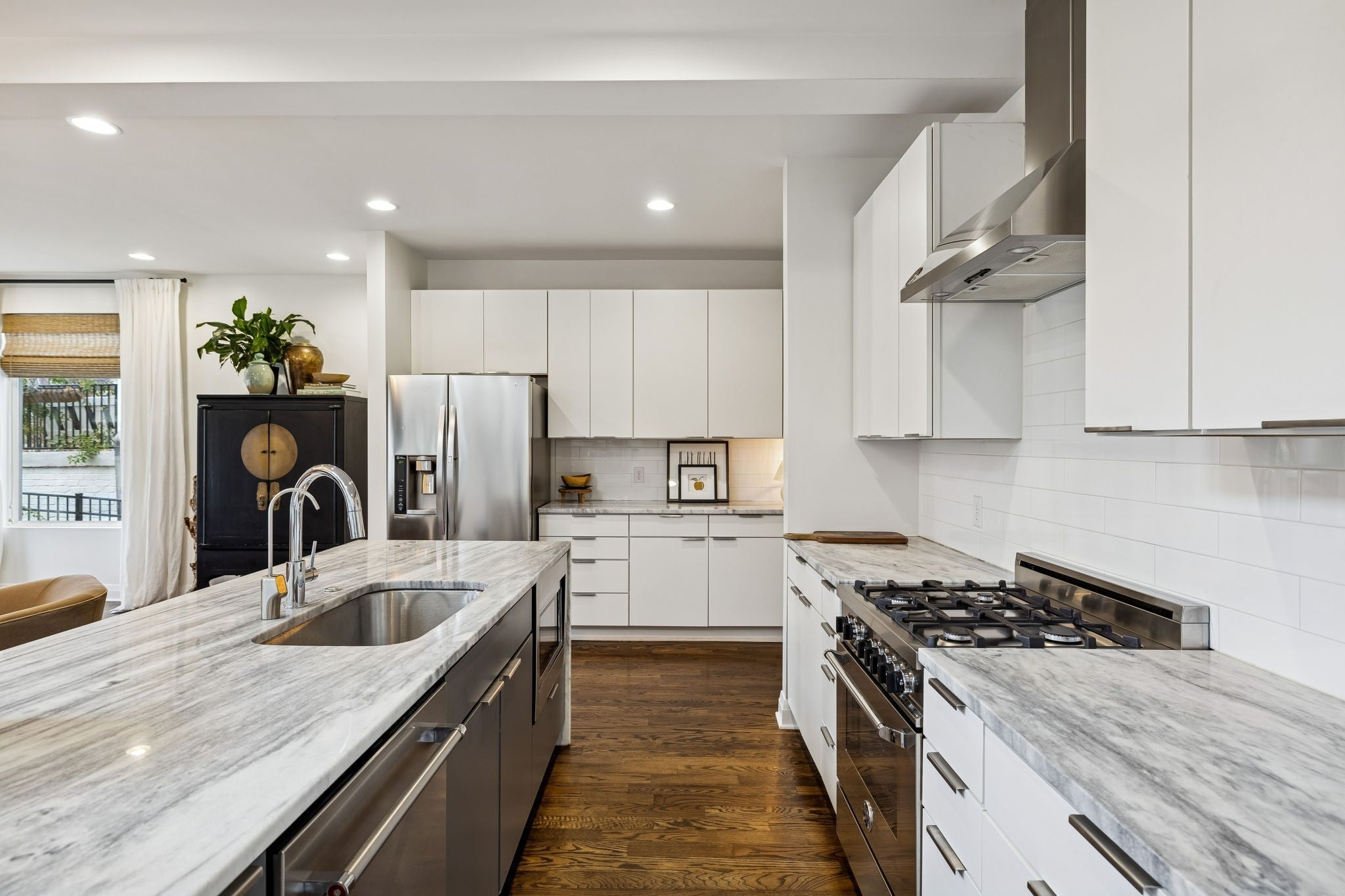 - Built-In Electric Oven, Gas Range, Dishwasher, Disposal, Microwave, Refrigerator, Stainless Steel Appliance(s)