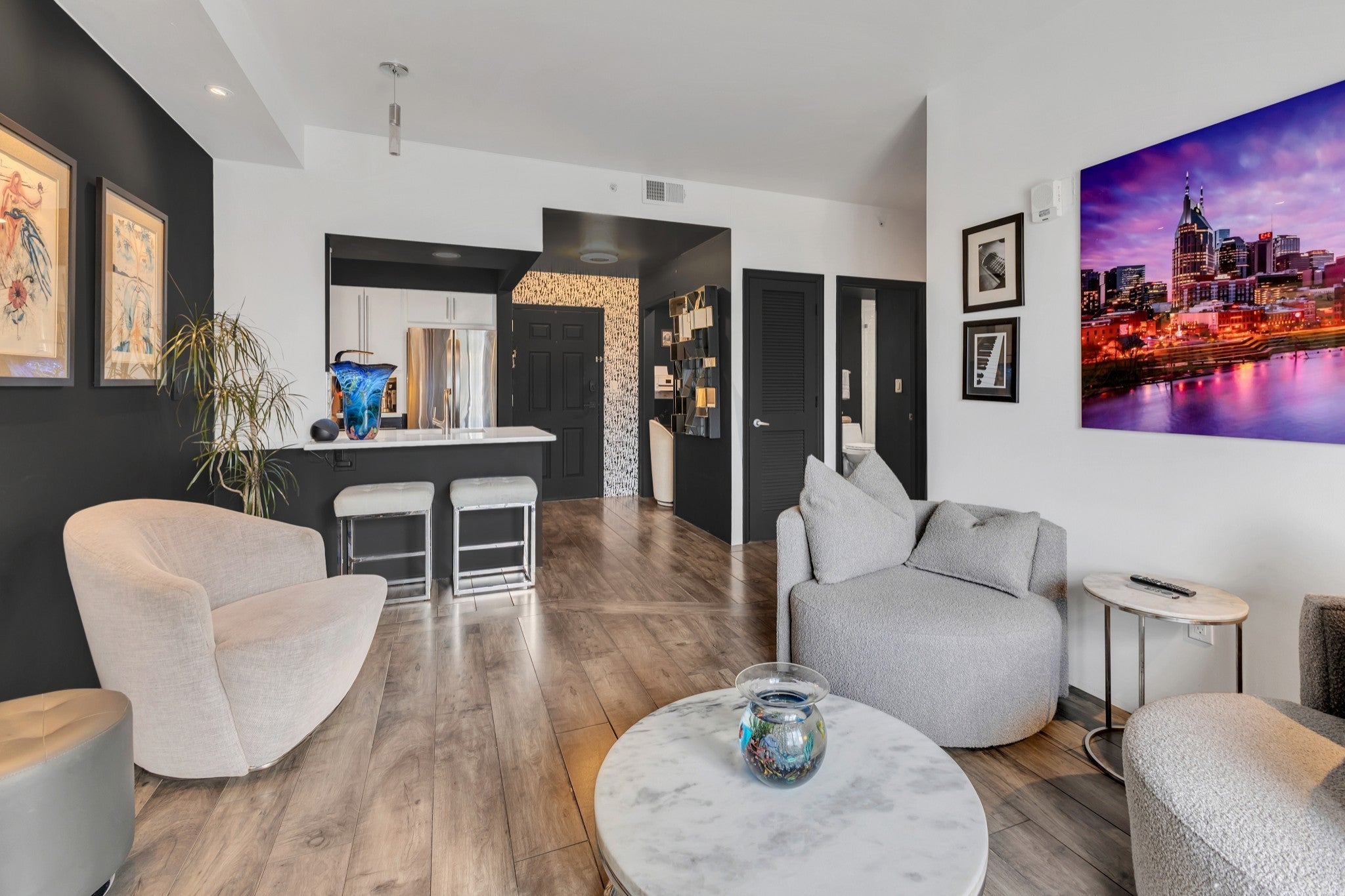 ⸻ Stunning Downtown Nashville Condo with Iconic Skyline & River Views Live in the heart of Music City with breathtaking, unobstructed views of the Nashville skyline and Cumberland River. This fully renovated residence offers a sophisticated urban lifestyle just steps from Titans and Predators games, Broadway’s legendary honky-tonks, and some of the city’s most celebrated dining. World-class landmarks—including the Country Music Hall of Fame, Bridgestone Arena, Schermerhorn Symphony Center, and the historic Ryman Auditorium—are all within a short stroll. Begin your day or unwind at sunset on your private 60 sq. ft. covered balcony, perfectly positioned to overlook the river and Nashville’s iconic “Batman Building.” Just minutes away, the highly anticipated Nashville Yards development—19 acres of premier dining, entertainment, and Class-A office space—will further elevate this already exceptional location in Spring 2026. Thoughtfully redesigned and 100% remodeled by the owner/agent/contractor, this home showcases meticulous craftsmanship and high-end finishes throughout, creating a modern, turnkey retreat in the center of downtown. Exclusive Building Amenities Include: • Music writing room with Yamaha grand piano • Outdoor patio with BBQ grills and gathering spaces • Fully equipped fitness center • Cyber café & resident lounge • Secure access throughout the building The unit includes one deeded space in a secure, covered garage, with additional parking options available. Unmatched views. Premier location. Luxury finishes. This is downtown Nashville living at its finest.