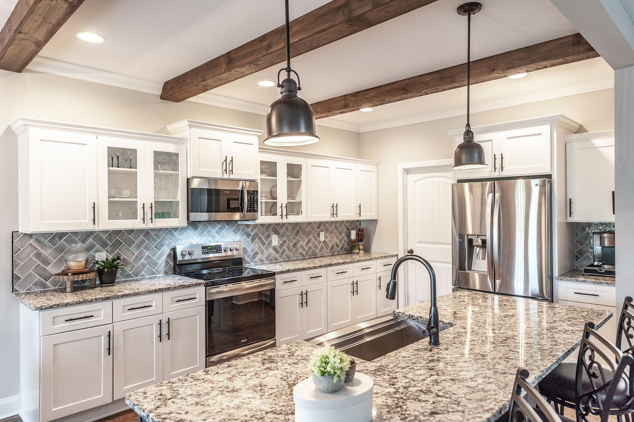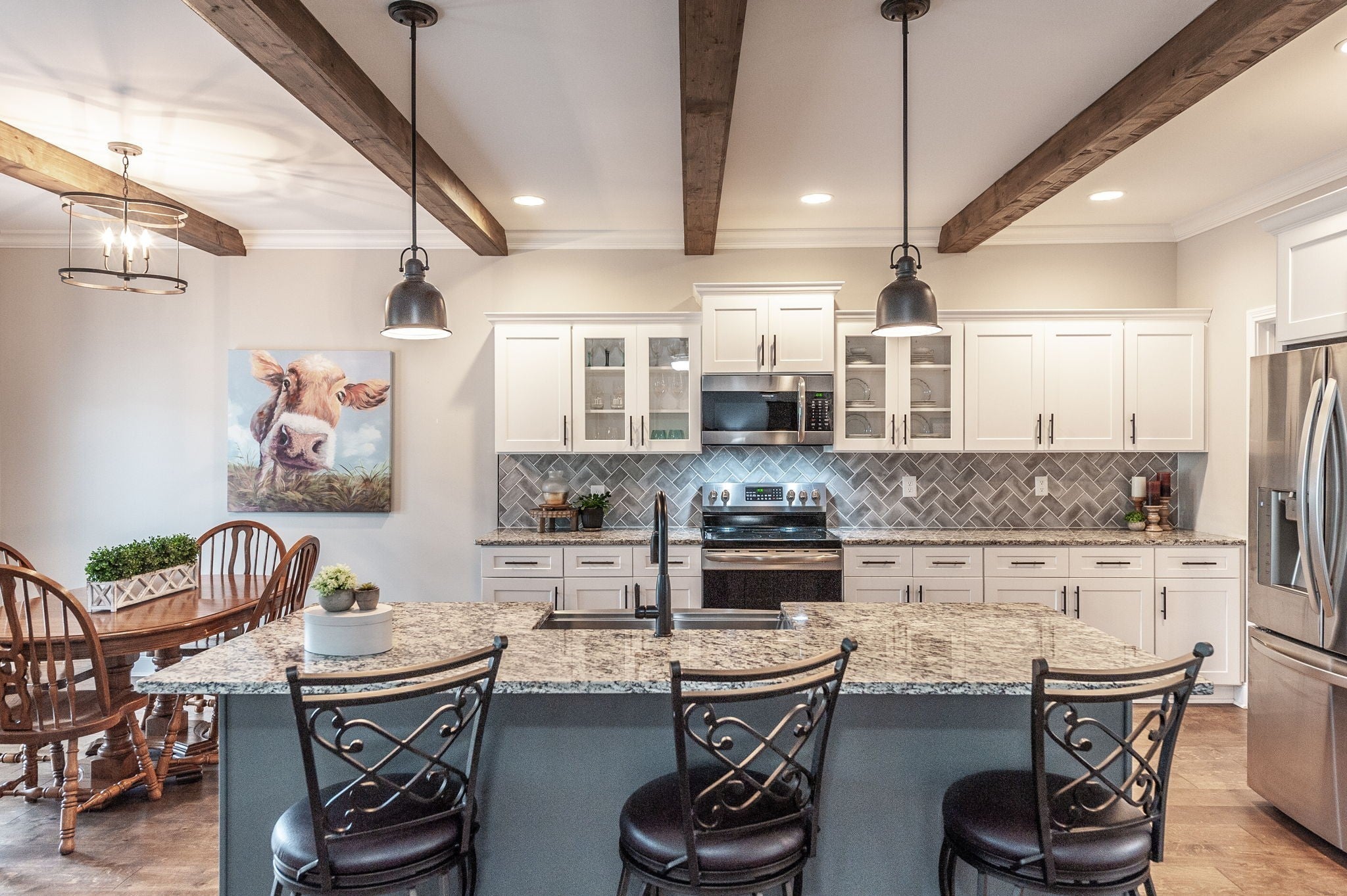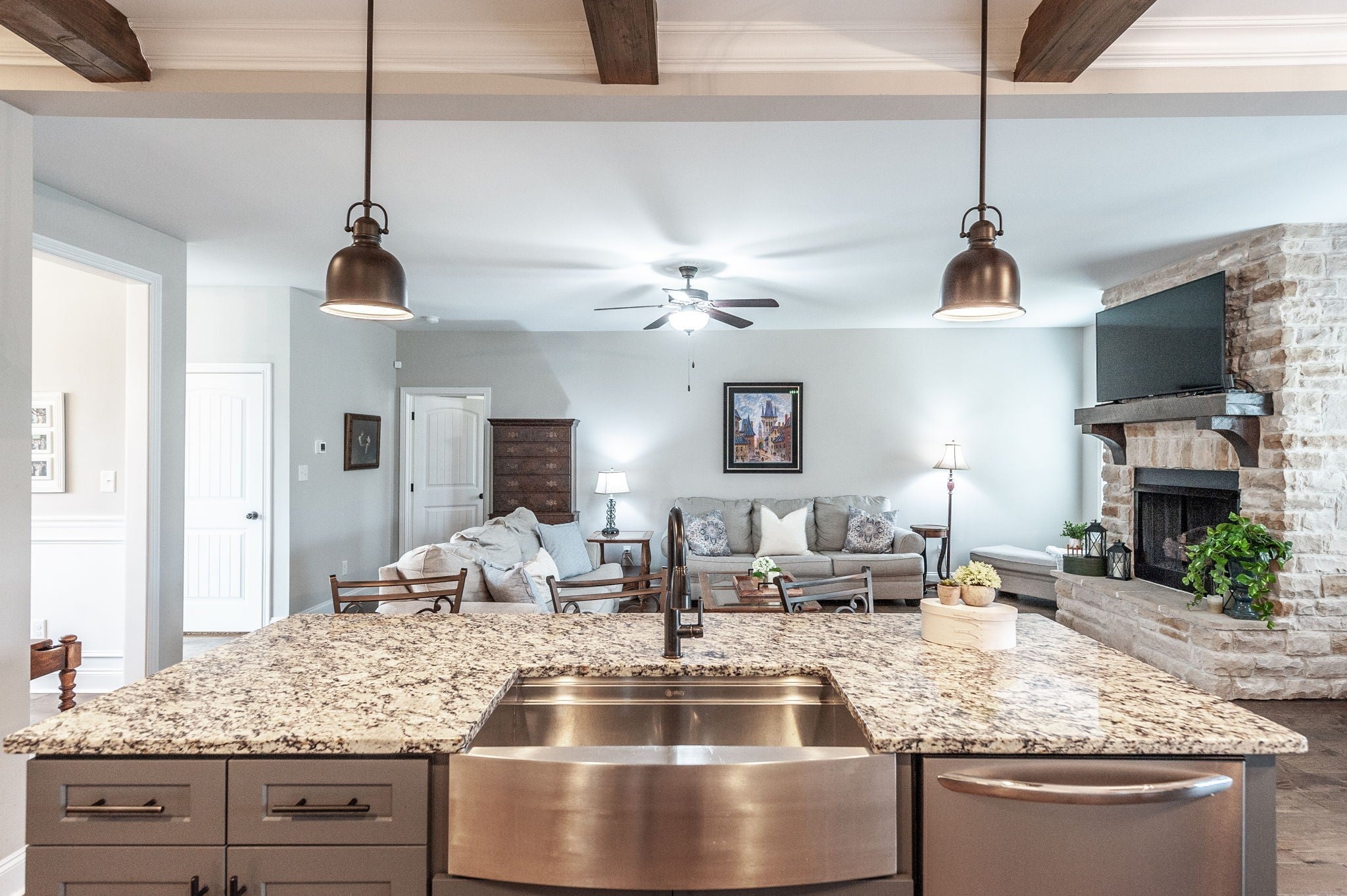 From the moment you step onto the charming covered front porch and through the double doors, this home will leave you breathless. Inside a shiplap-accented foyer and gleaming hardwood floors set the tone for style and warmth. The gourmet kitchen is a dream with white cabinetry featuring glass fronts, granite counters, a tile backsplash, rustic wood ceiling beams, and a huge island with a farmhouse sink - All Open to a Cozy Great Room with a Stunning Stone Gas Fireplace with Raised Hearth. The primary retreat is your sanctuary with a soaking tub, walk in shower, double vanities and walk in closet. Full Finished Basement with Full Bath. Garage seems like a