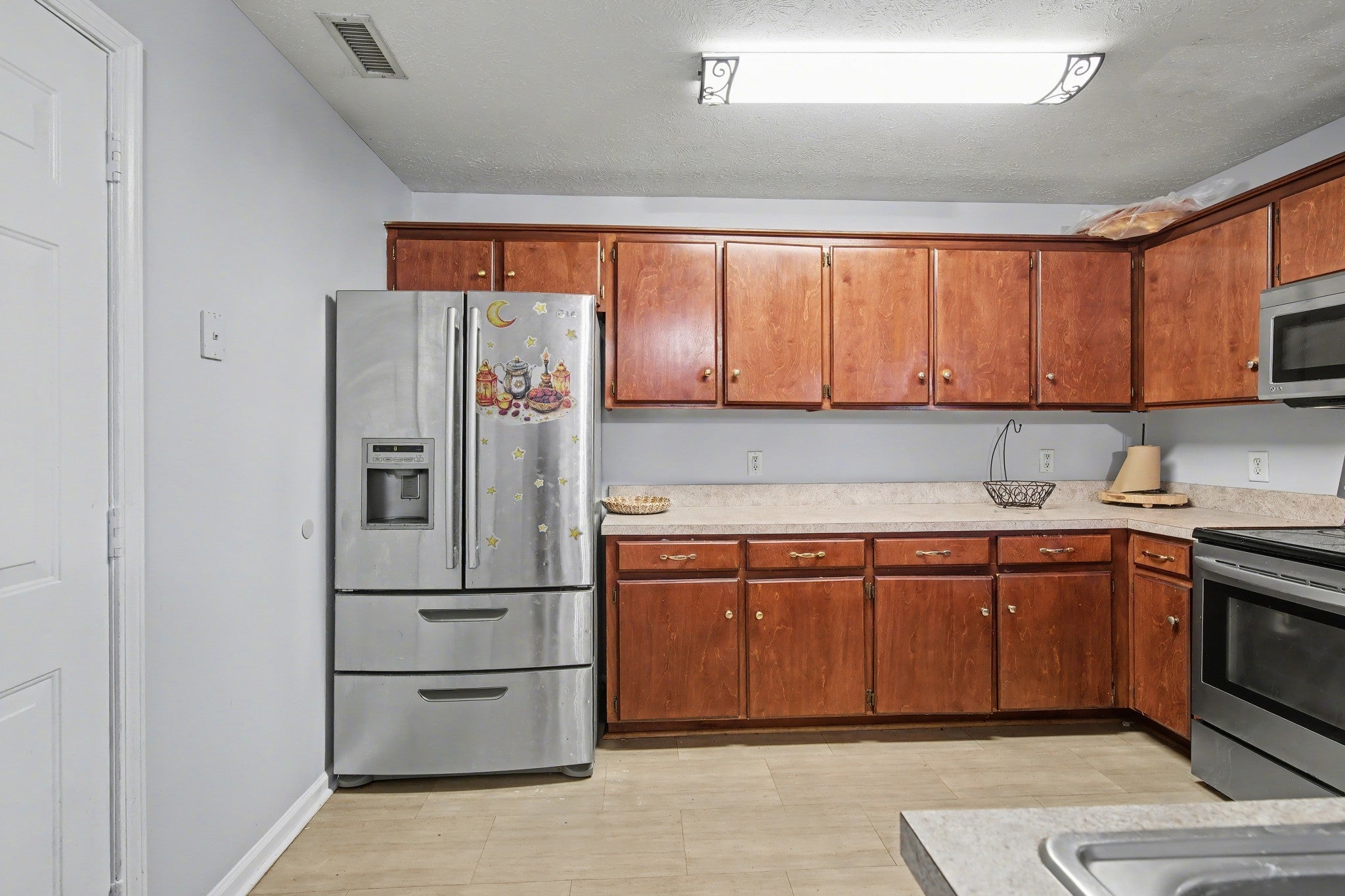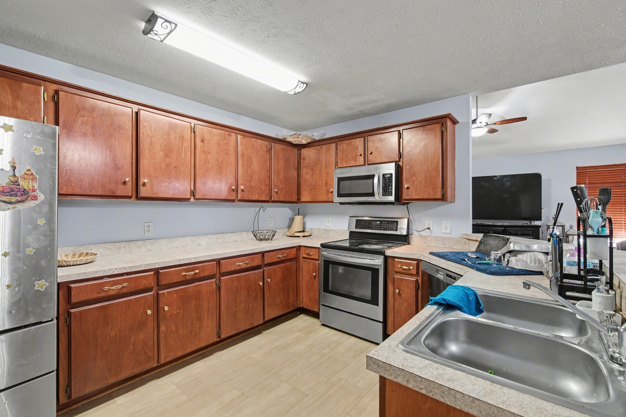 - Electric Oven, Cooktop, Dishwasher, Disposal, Microwave, Refrigerator, Stainless Steel Appliance(s)