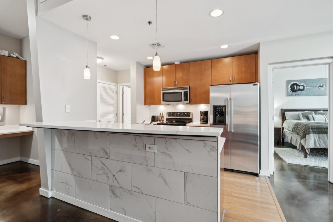 Discover Urban Luxury Living in Nashville's Heart with this meticulously maintained 1 BR/1BA condo at Encore Condominiums. New countertops in Kitchen, Bathroom, & Built in Bar, NEW large Walk-in Shower, NEW Water Heater, NEW Washer/Dryer & multiple other upgrades. Enjoy 746 sq ft of Premium Downtown space, flooded with natural light from floor-to-ceiling windows. Features a spacious Walk-in Closet with NEW glass doors and Newly resealed stained concrete floors. Resort-style amenities: 24-Hour Concierge, Fitness Center, Free WIFI, Rooftop Pool, Grills, & Fire Pit with Downtown Views. Exclusive location near popular eateries. No short-term rentals allowed. Minimum 12-month lease with a current two-year waitlist for lease permits. FREE APPRAISAL and $3000 Lender Credit when financing w/ Kevin Kenerson - Lending Hand Mortgage 615-390-7534. No parking space included, multiple public/private garages w/ monthly parking offered for $100 - $250/mo. Buyers agent & Buyers to verify all pertinent info.