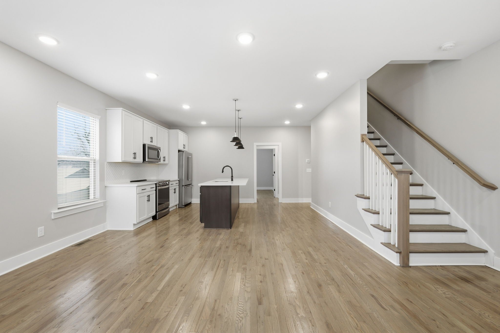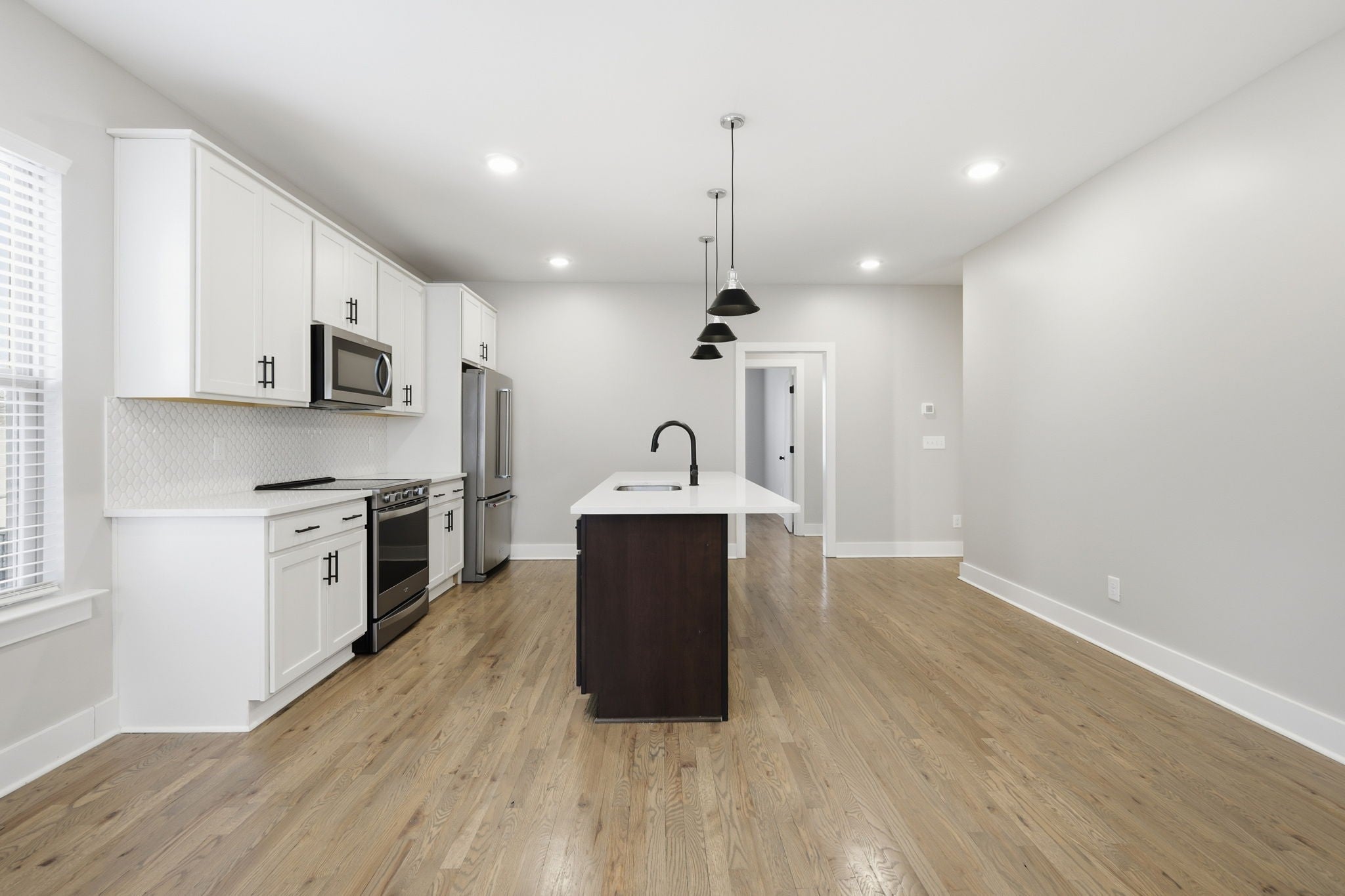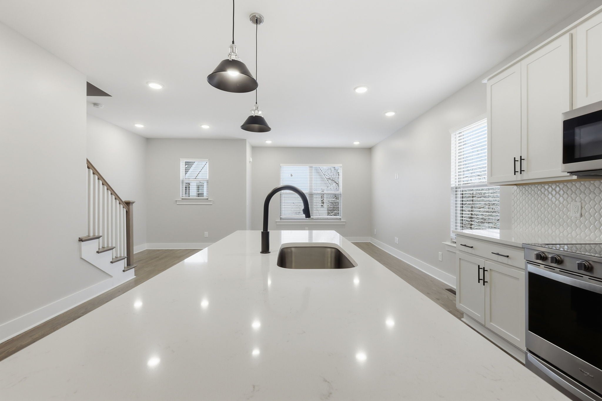 Gorgeous three-story townhouse offers 3 bedrooms and 3 bathrooms with a bright, open floor plan designed for modern living. The kitchen features an island, decorative backsplash, and accent lighting, creating a stylish and functional space. The primary suite includes a double vanity, and the attached 2-car garage adds everyday convenience. A comfortable layout and thoughtful finishes make this home a great opportunity. One or more photos have been virtually staged.