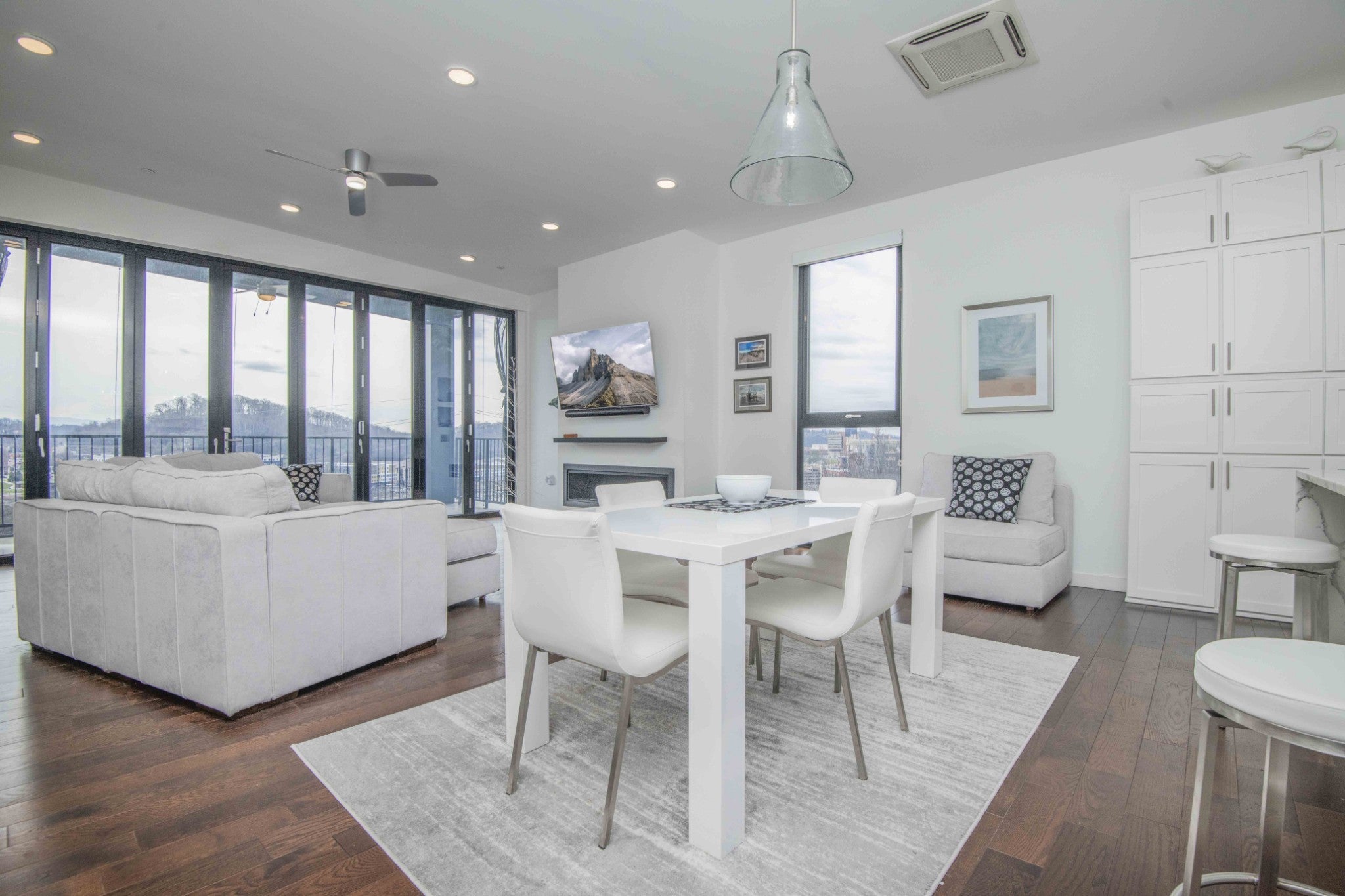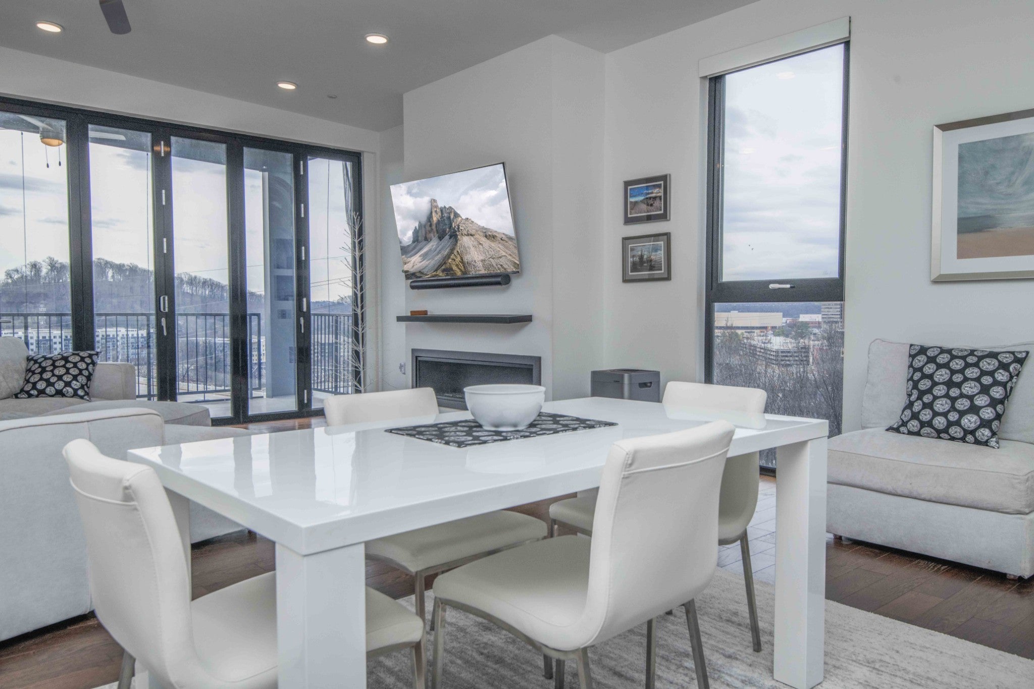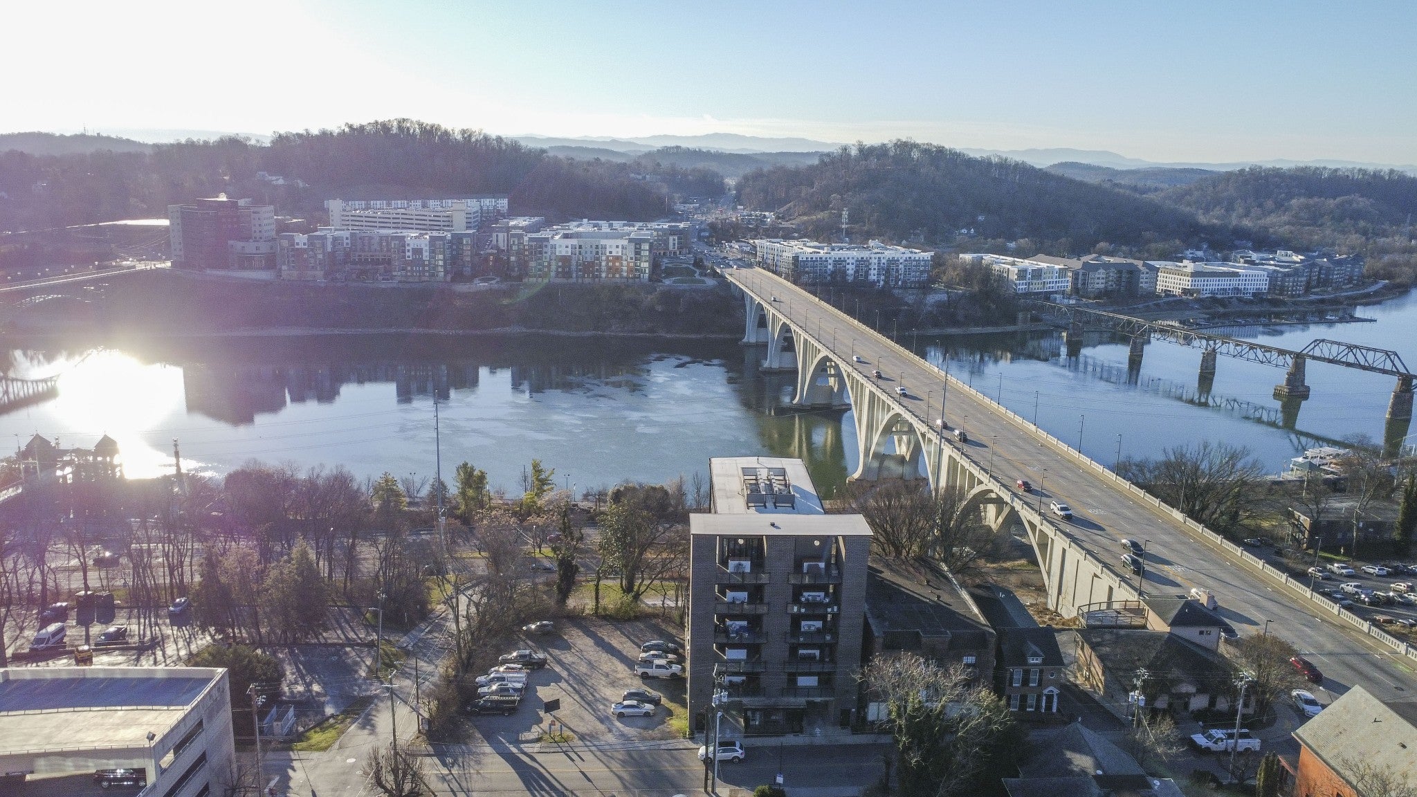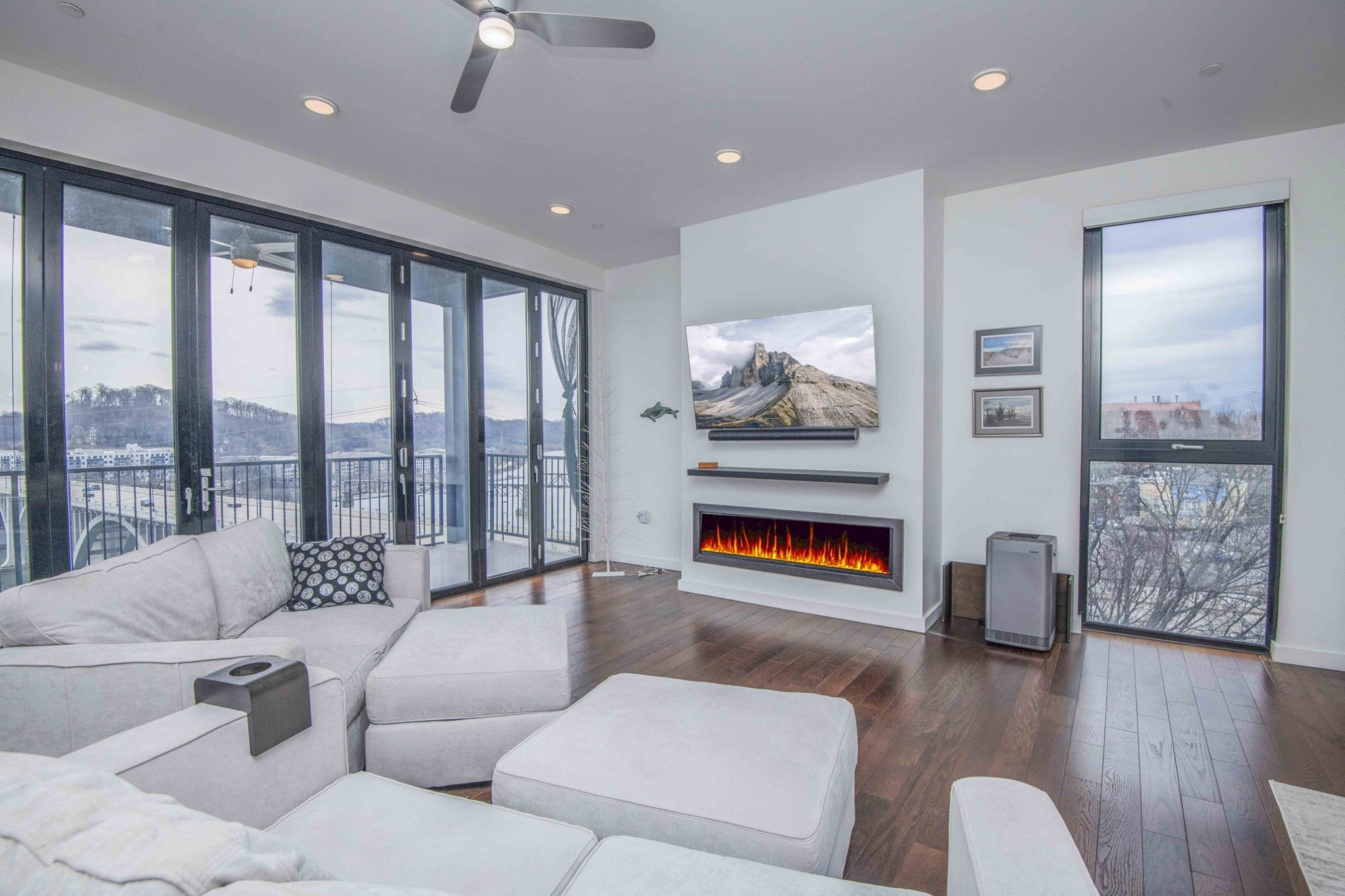 Looking for a top-floor, modern condo with million-dollar views? The unit is situated overlooking the Tennessee River and walking distance to the Food City Arena, Theater District, University of Tennessee, Volunteer Landing, downtown library, Market Square and so much more. Meticulously maintained and looks new, as this was a second home for the owners. Enjoy the on-site parking and elevator that lands on your private front porch that overlooks the downtown areas, plus mountain views! It has upgrades such as the accordion retractable glass wall doors and additional cabinetry. Open the balcony up to increase living and entertaining space overlooking Henley Street bridge and the Tennessee River, as well as the southern skyline. High ceilings throughout and large windows! The spacious open kitchen with sleek lines includes a large island, gas range, and wall counter fridge. No carpet can be found here, with hardwood floors and tile. Enjoy the cool nights with the beautiful modern gas fireplace while still enjoying the mountain views. With a primary bedroom with a private ensuite spa-like tub bath, you will truly be amazed at the well-thought-out touches and space. Two additional bedrooms and another full bath, plus a laundry area completes the unit. Approximate square footage is 2100, which includes approximately 1700 sq feet of living space, and two separate covered porches combined are approximately 400 sq feet. Space for rocking on the front porch overlooking Hill Street has a storage area, too! The elevator is a private access to your unit, with only one other unit being able to access the 6th floor! With covered parking, electronic entry, electronic access to the elevator, and electronic 6th floor private access, you will feel very secure. Make your appointment today to see this lovely home! Drone photography has been utilized. Buyer or buyer's representative to verify all information contained herein.