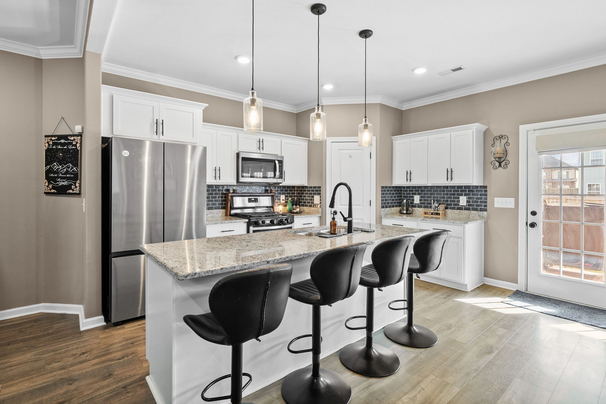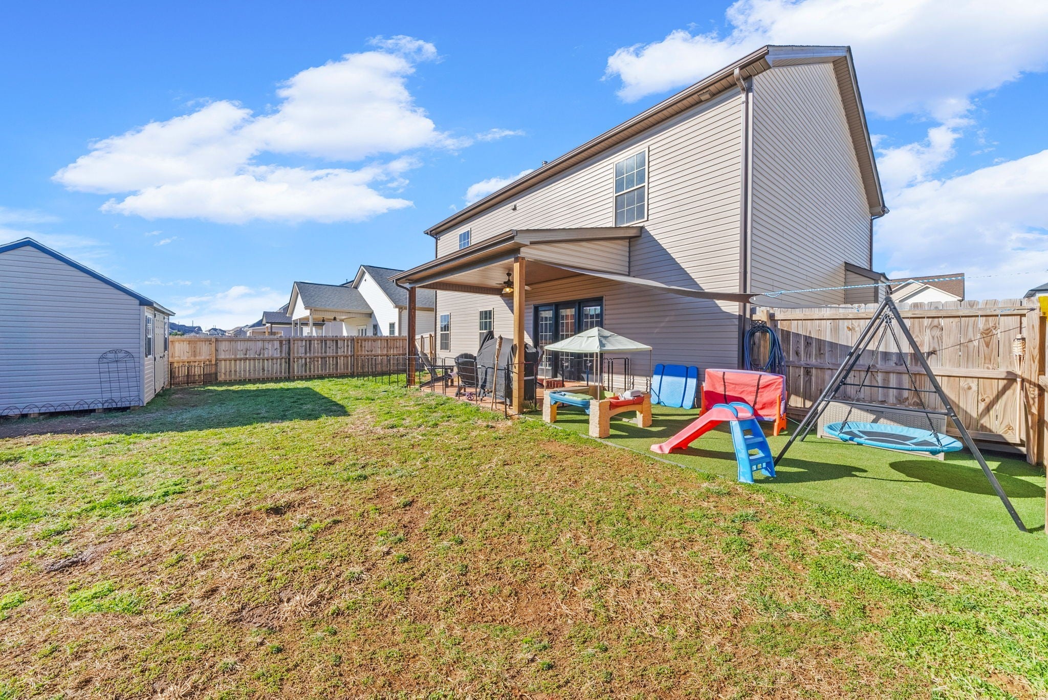 Better than new and truly move-in ready, this beautifully designed 4-bedroom home with a bonus room offers over 2,700 +/- square feet of open-concept living perfect for both everyday life and entertaining. The kitchen shines with a large island, large pantry, soft-close white cabinetry, and a mix of granite and quartz countertops throughout. The main-level primary suite is a true retreat, featuring a soaking tub, tiled shower, and two walk-in closets. Upstairs, you’ll find three massive bedrooms with huge closets, and a vaulted bonus room that provides incredible flexibility for a media room, playroom, home office, or all three. A large shed with electric adds extra storage or workspace, while the heated and cooled garage offers year-round comfort. Cozy up by the gas fireplace or enjoy quiet mornings on the covered porch and evenings on the covered patio overlooking the fenced backyard. This home truly checks all the boxes space, style, and functionality all in one. What are you waiting for? Come see the rest for yourself today.