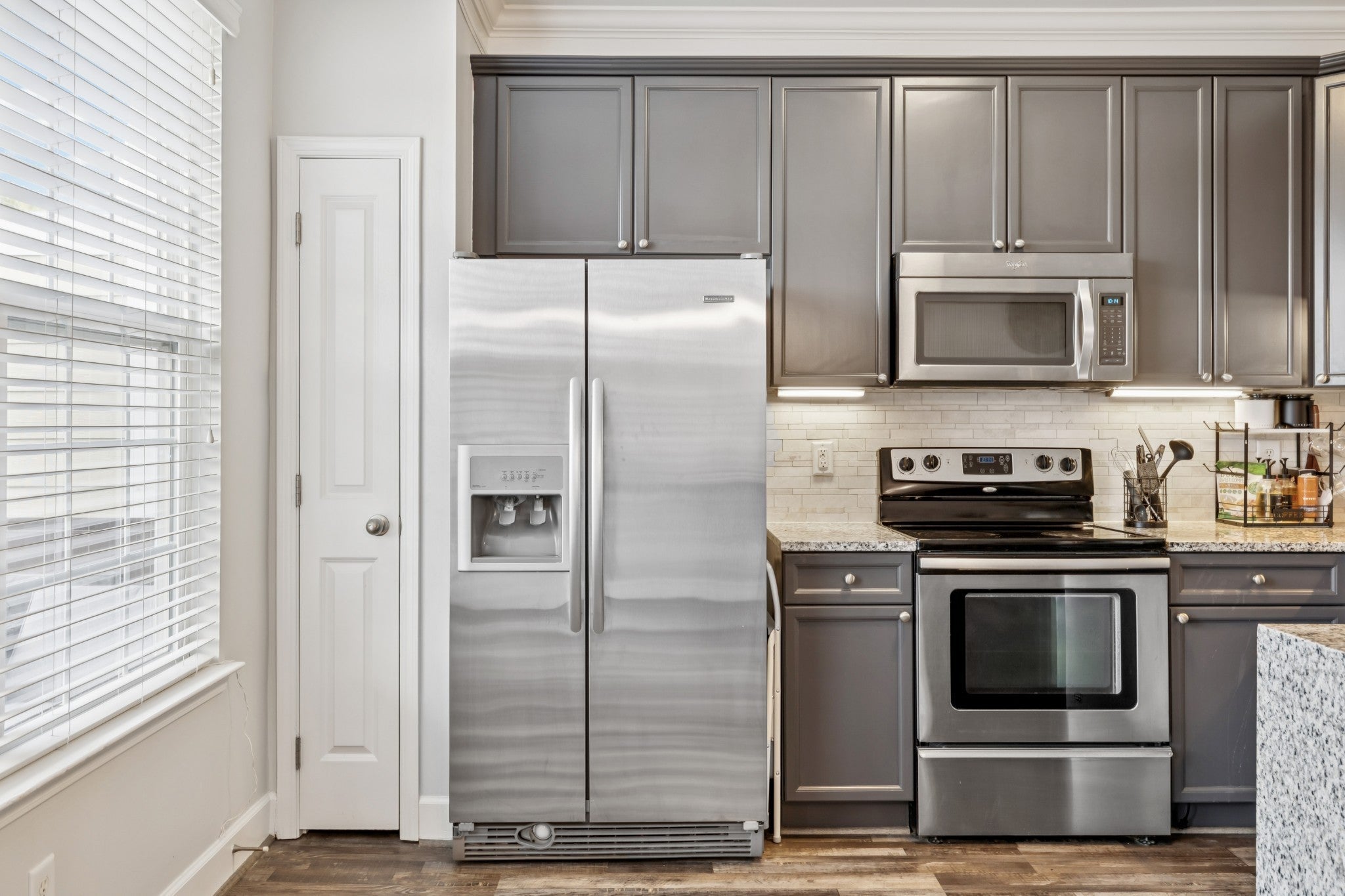- Built-In Electric Oven, Built-In Electric Range, Dishwasher, Disposal, Microwave, Refrigerator, Stainless Steel Appliance(s)