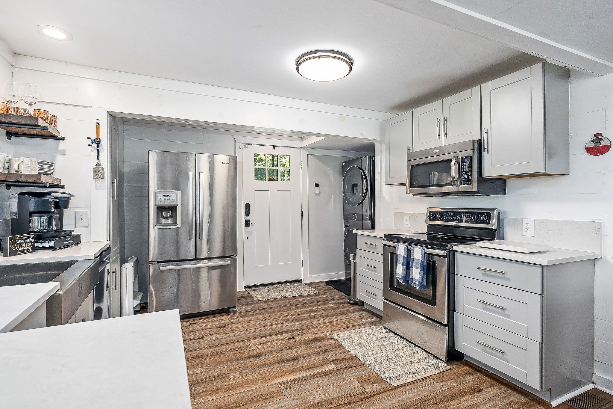 - Electric Oven, Range, Dishwasher, Dryer, Microwave, Refrigerator, Stainless Steel Appliance(s), Washer