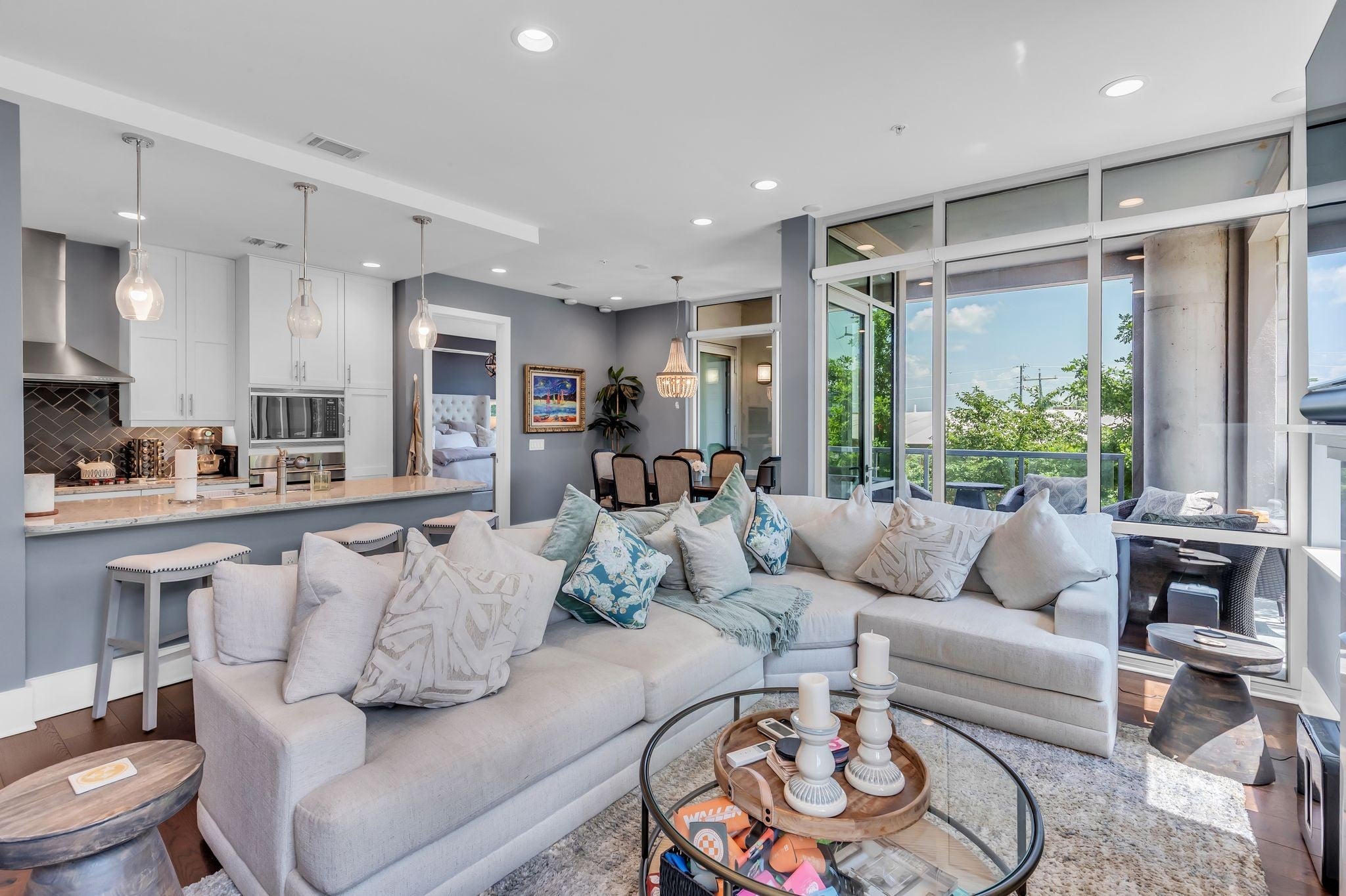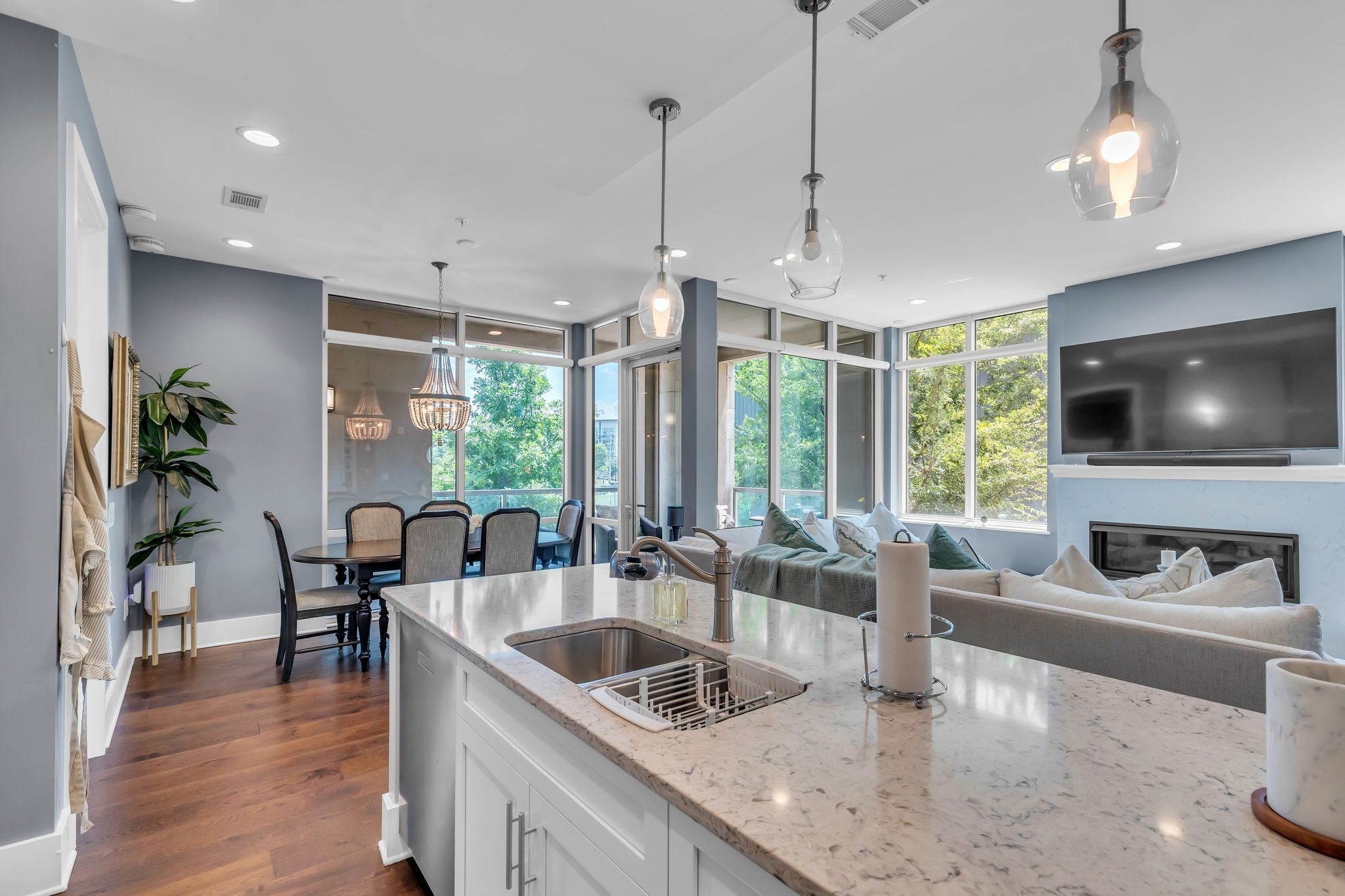 Rare opportunity to lease a true 3-bedroom residence in the heart of downtown Nashville. Unit 109 at CityLights is a tastefully updated, immaculately maintained home offering approximately 1,687 square feet of refined living space in one of the city’s most desirable boutique buildings. This beautifully finished unit features floor-to-ceiling windows, rich hardwood floors, and a gas fireplace that anchors the open-concept living area. The kitchen includes granite countertops, under-cabinet lighting, and a full suite of designer stainless steel appliances, flowing seamlessly into the dining and living spaces—perfect for entertaining or everyday living. The primary suite offers a serene retreat with a custom walk-in closet system and a spacious en-suite bath featuring double vanities, a soaking tub, and a separate walk-in shower. Two additional bedrooms, each with their own walk-in closets, provide flexible space for guests or a home office. A conveniently located powder room features modern fixtures and a stylish vanity. Just off the living area, a private outdoor patio serves as a secluded oasis—something truly special in the heart of the city. The secure building features RFID access and a staffed concierge desk for added convenience and peace of mind. This unit includes two assigned garage parking spaces. CityLights residents enjoy exceptional amenities, including a rooftop terrace with panoramic skyline views, resort-style pool, fitness center, dog park, residents’ lounge, and multiple indoor and outdoor gathering spaces. Walkable to Ascend Amphitheater, Bridgestone Arena, the Cumberland River Greenway, Pinewood Social, and more—this location truly puts the best of Nashville at your doorstep. Lease-purchase option available.