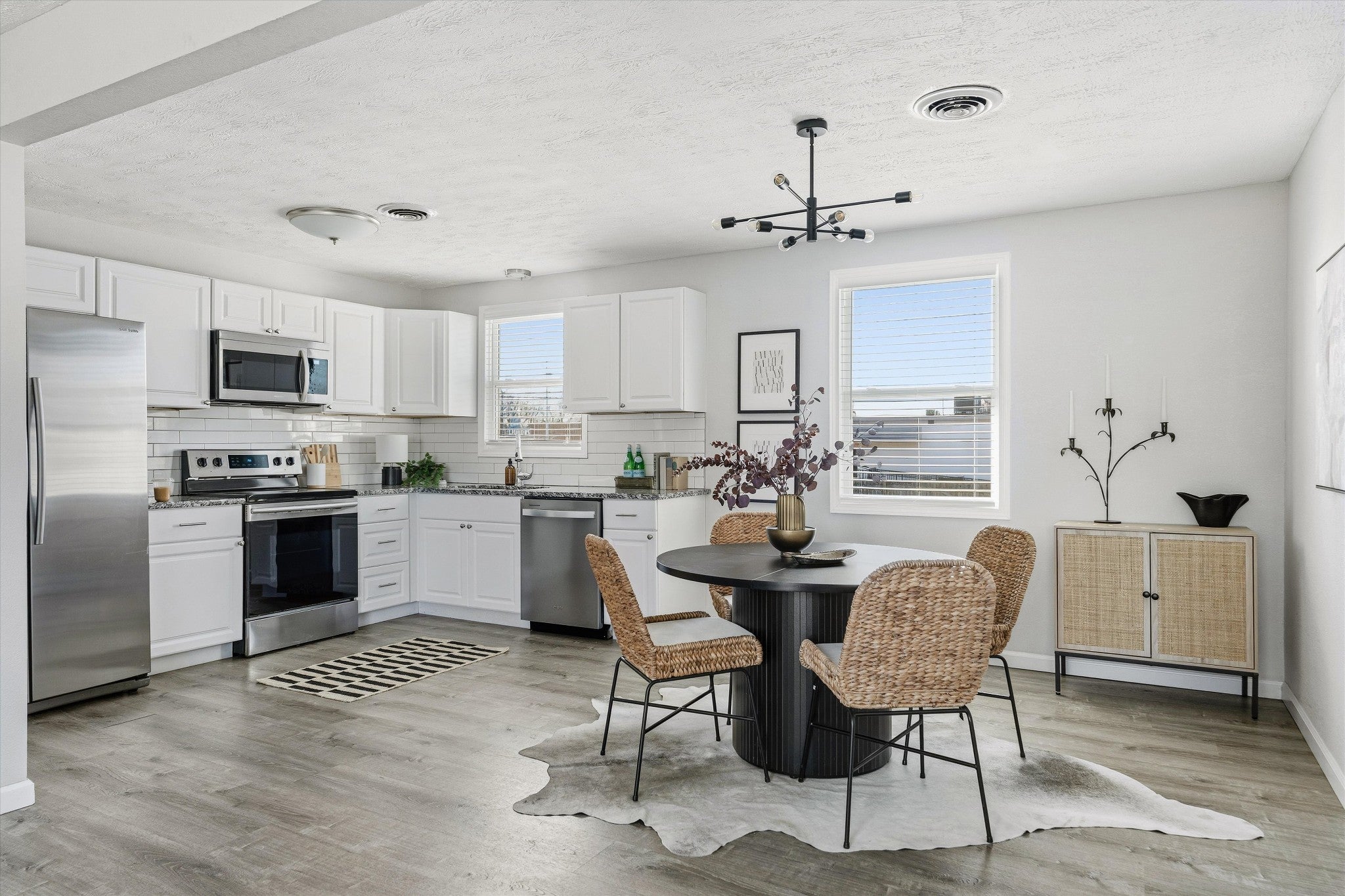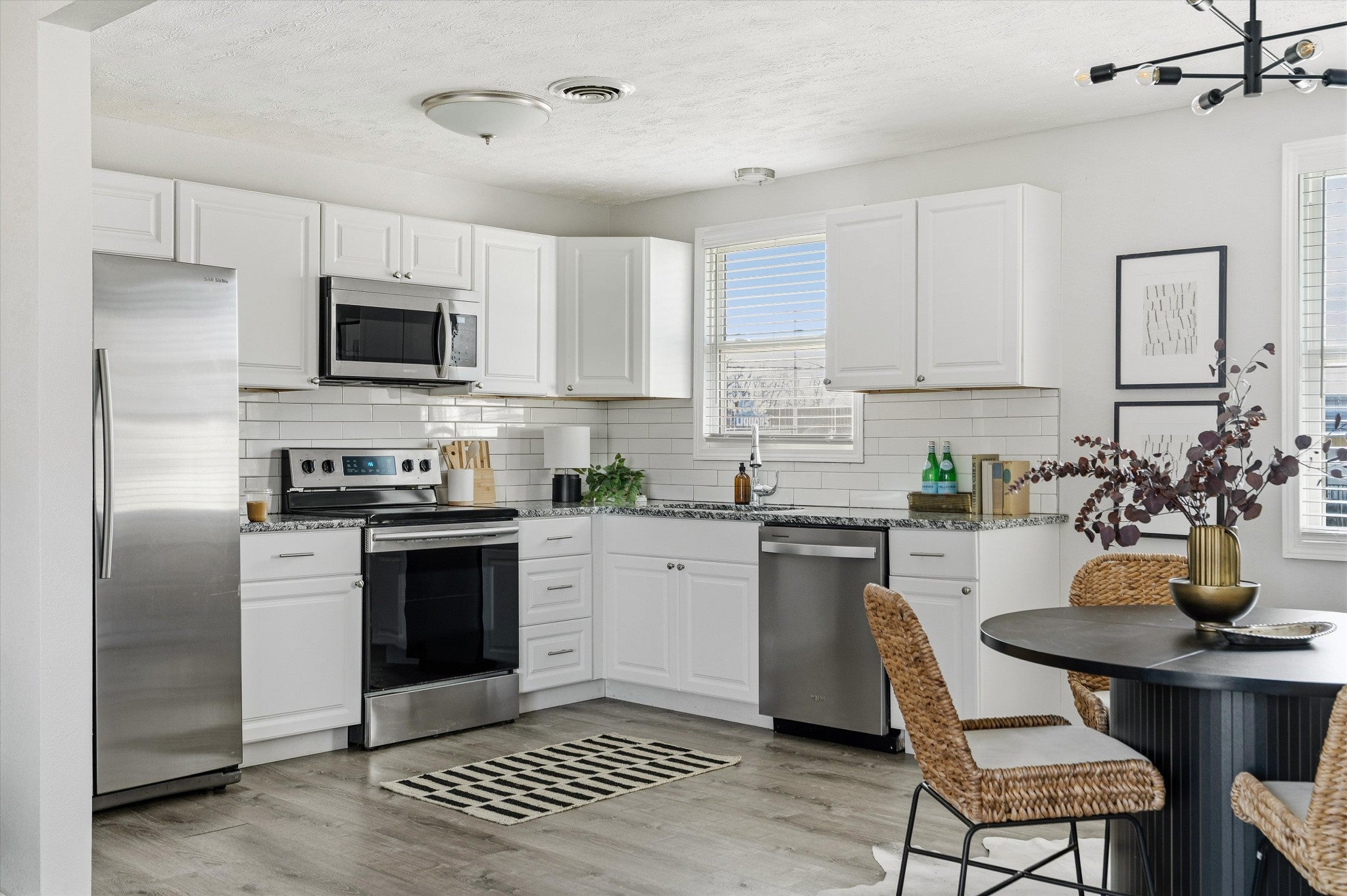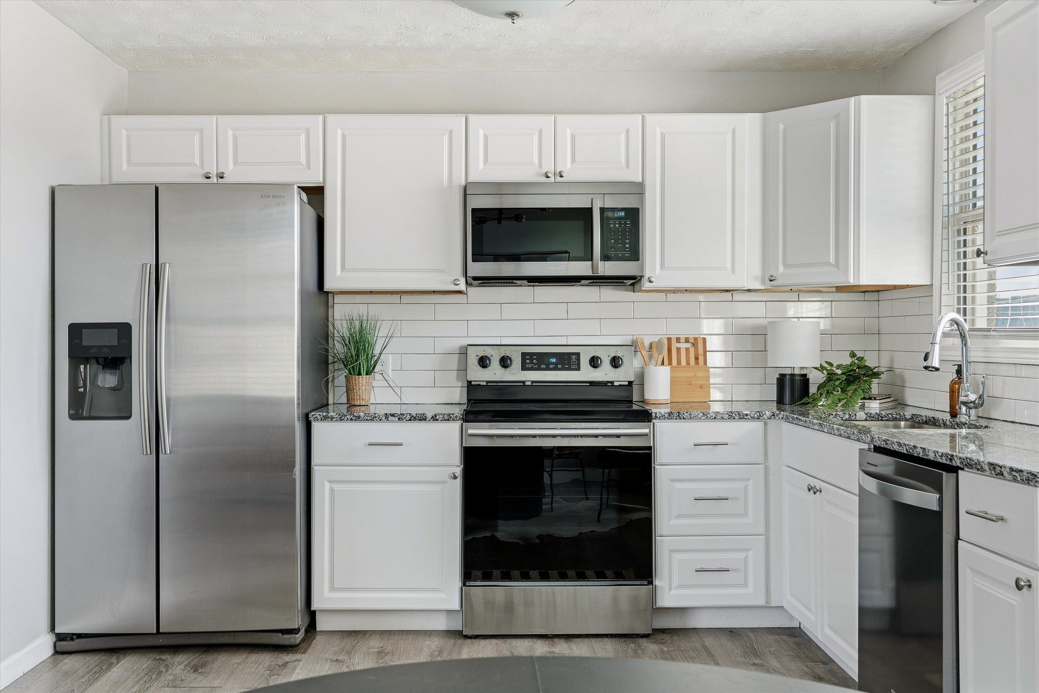 - Electric Range, Dishwasher, Disposal, Microwave, Refrigerator, Stainless Steel Appliance(s)