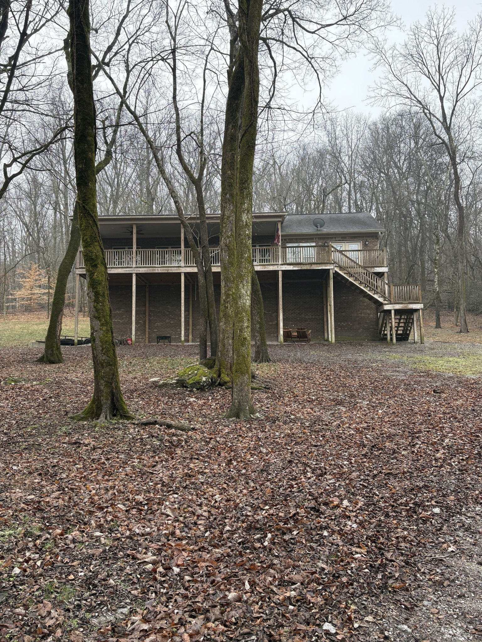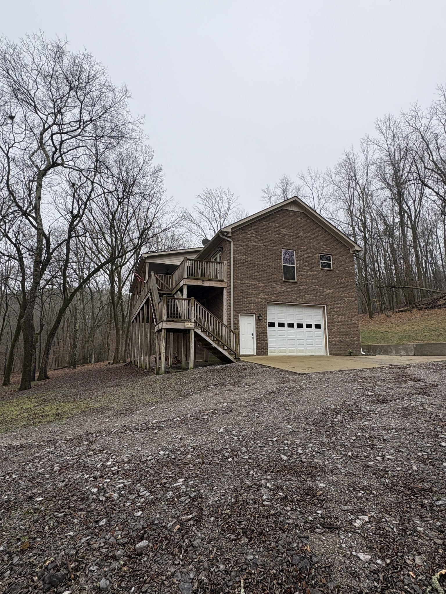 Gorgeous All Brick Home on Private & Secluded 6.2 Wooded Acres; Dead End Road; Large 2 Bedroom, 2 Bath Home with 1800 Square Feet in Basement that is Heated/Cooled with Mini Split Unit; Basement has 2 Garage Doors, One on each end of Garage w/Garage Door Openers and Room to Park AT LEAST 4 Cars; Basement also Plumbed for 1/2 Bath; Huge Great Room w/Living Area, Kitchen & Dining Area all Combined; Kitchen has Lots of Cabinetry, Granite Counters, Kitchen Island & Stainless Appliances to Remain; 2 Tiled Showers; Huge Covered Deck & Lots of Windows in Front of Home overlooking the Beautiful Private Acreage; Large Utility Rm with Closet and Access to a Private Deck; Large Primary Suite w/Huge 11x7 Walk-in Closet and Full Bath; Primary Bedroom also has Door with Access to Deck/Covered Deck Area; Primary Bath has Large Tiled Shower, Tile Floors, Double Vanities with Granite Counters, & 2 Pocket Doors. Do not miss out on this Unique Property!