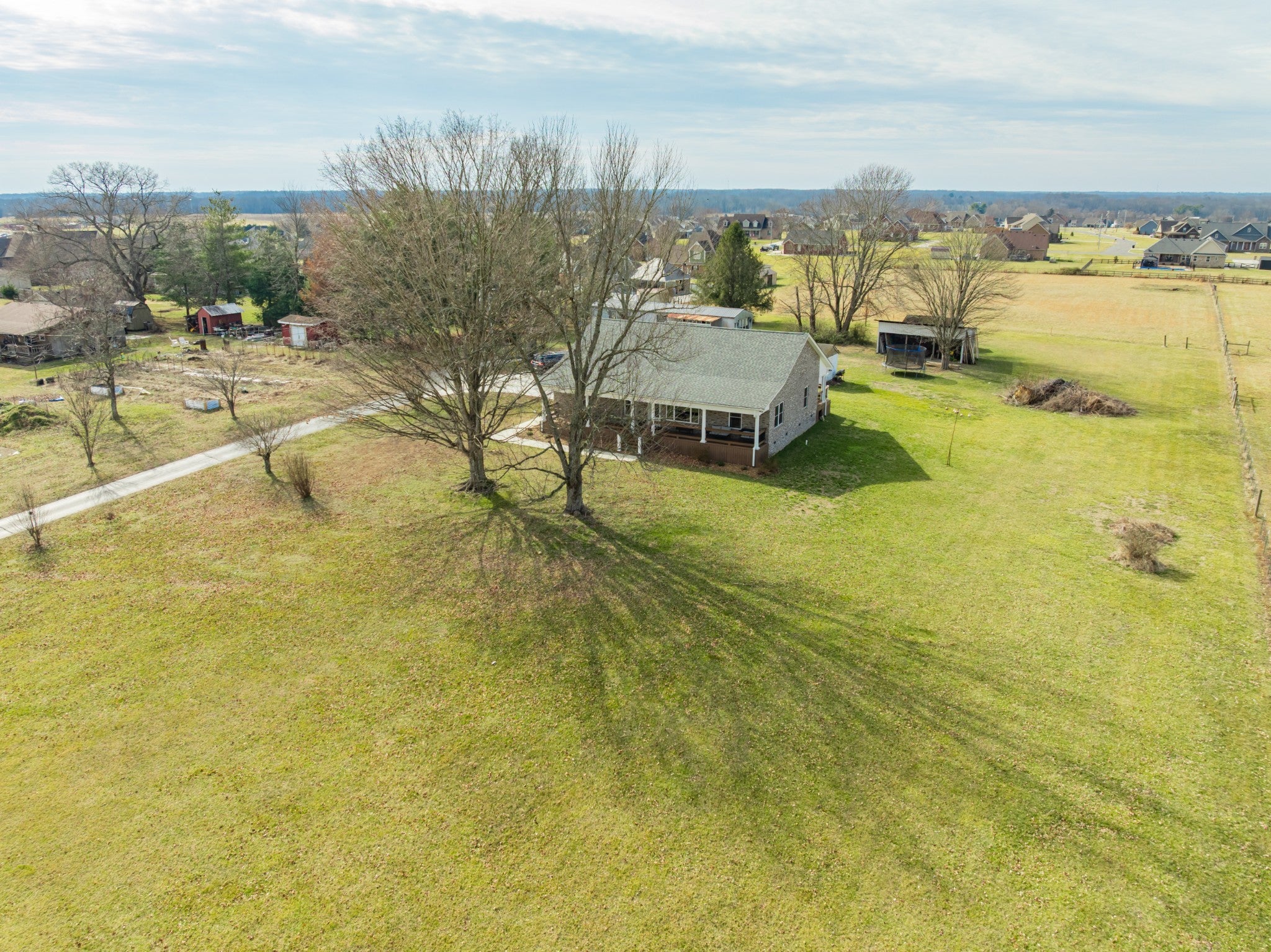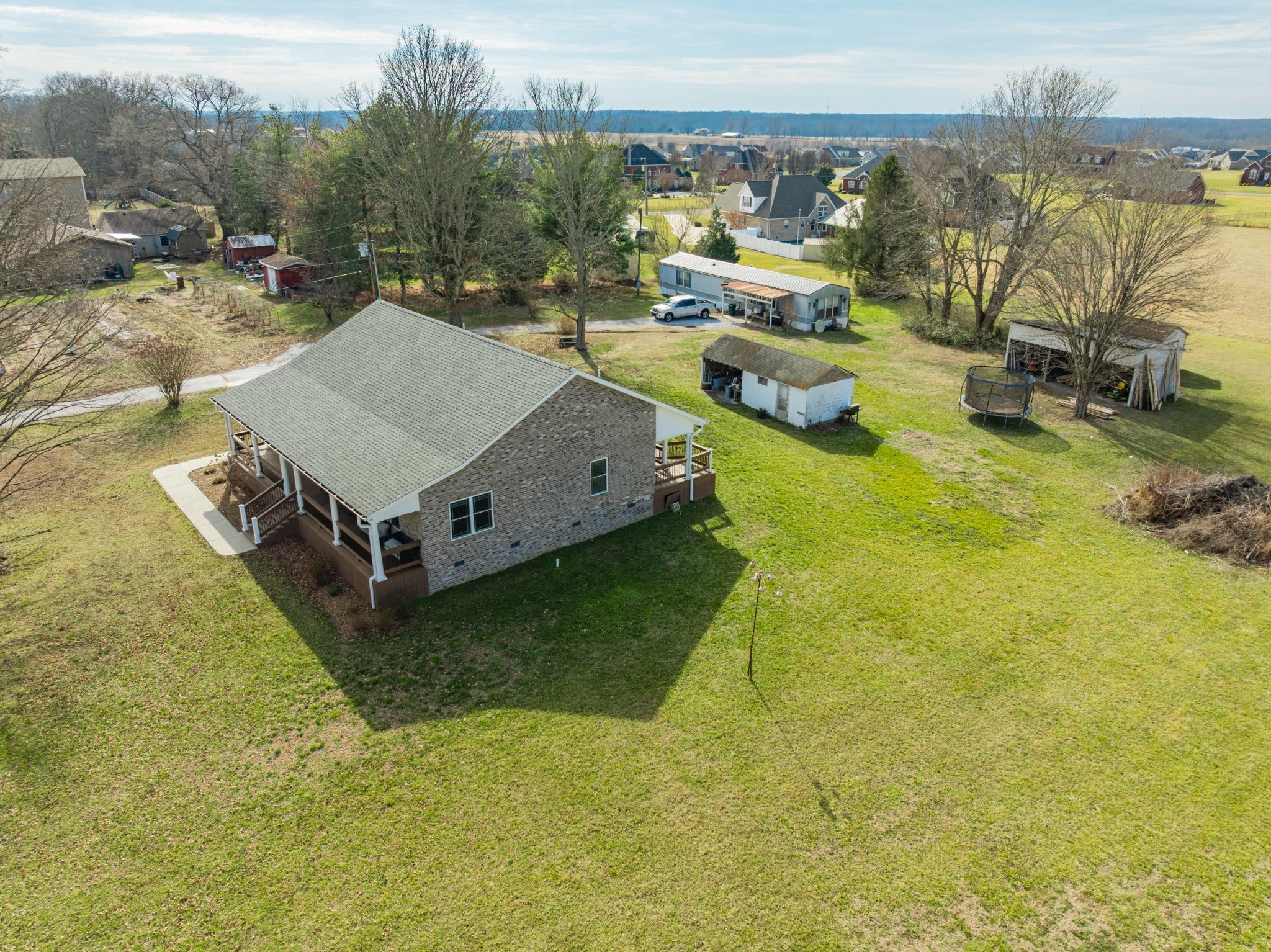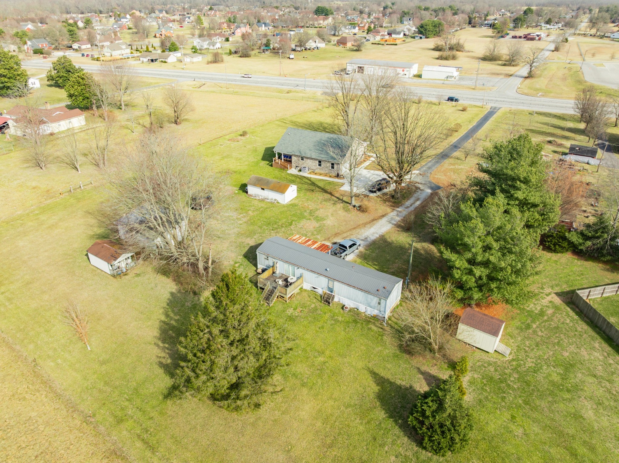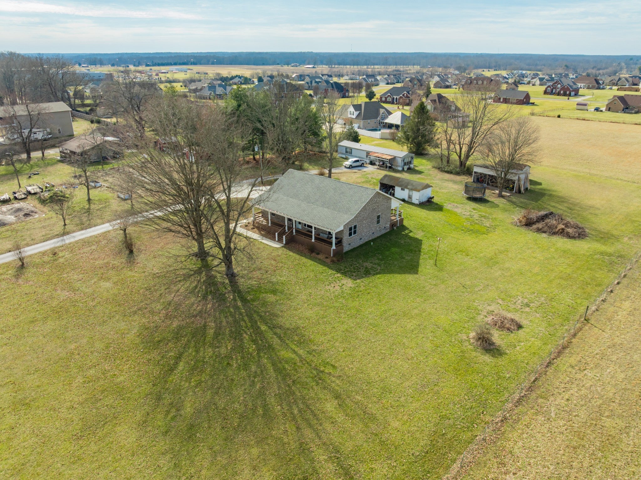 Two living spaces. Nearly five acres. One incredible opportunity. LOCATION LOCATION LOCATION! Nestled in the highly desirable New Union area, this beautiful property offers the perfect mix of peaceful country living with everyday convenience to schools, grocery shopping, the fire hall, emergency medical service, and a tight knit community you will love being part of. This newer 2023 home features over 2,100 sq ft of one level living with a popular split bedroom design, 3 spacious bedrooms, and 2 full baths. The open layout is ideal for gatherings, the separate laundry room adds extra convenience, and the circulating hot water system provides instant hot water at every interior faucet. Step onto the covered front porch for morning coffee and enjoy evenings on the back deck overlooking 4.82 acres of gorgeous pasture land. With low county only taxes, a paved driveway, concrete parking areas, and both front and back sidewalks, this property checks all the boxes. You will appreciate the oversized attached garage, floored attic storage, concrete building with concrete floor, three bay pole barn, and storage building with porch for all your equipment and hobbies. The home is on city water with a well on the property not currently in use, plus a Totten Pest Control termite contract for added peace of mind. And the cherry on top… an additional 1,152 sq ft mobile home provides a second living space for guests, extended family, rental income, or multigenerational living.