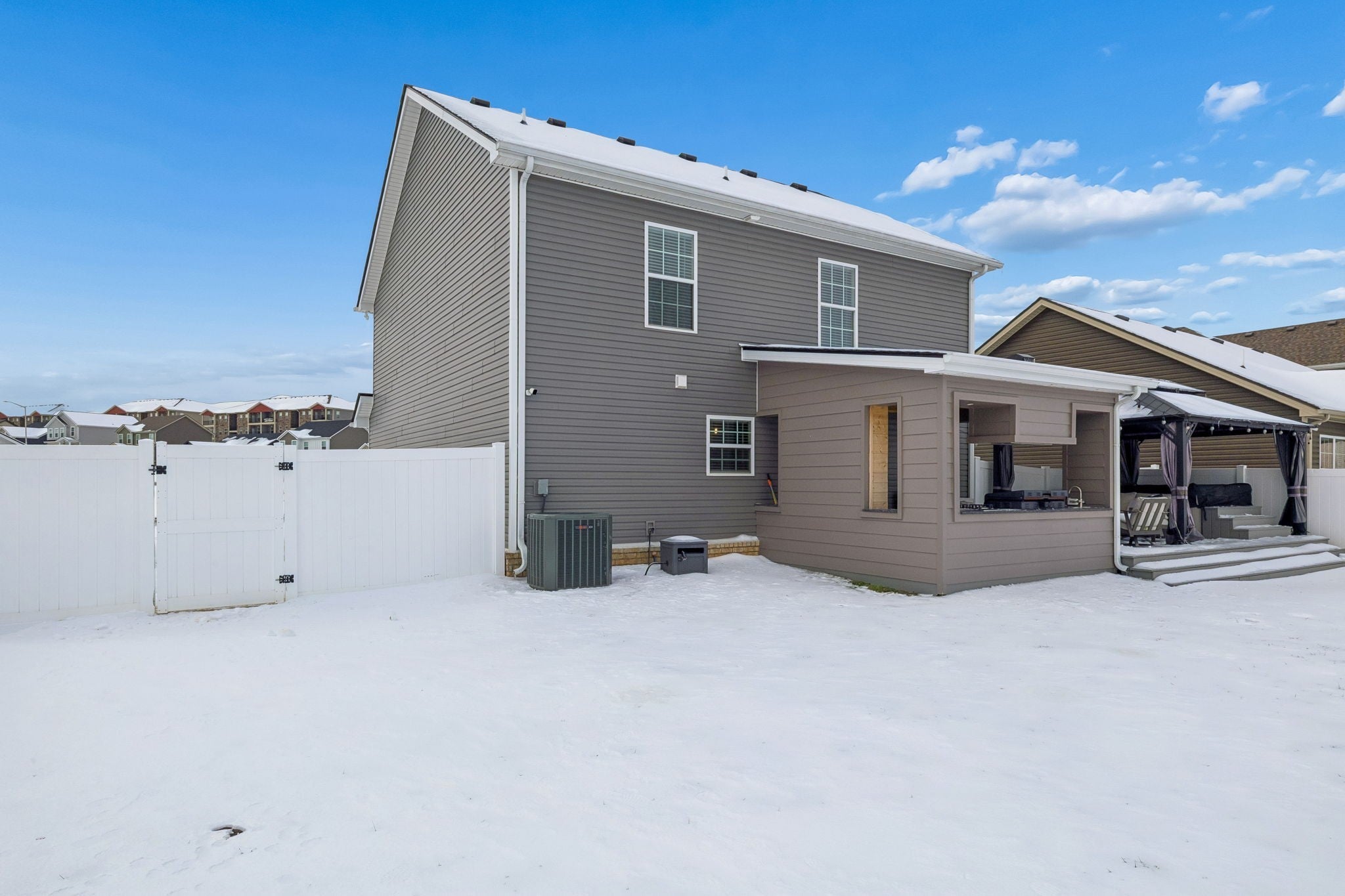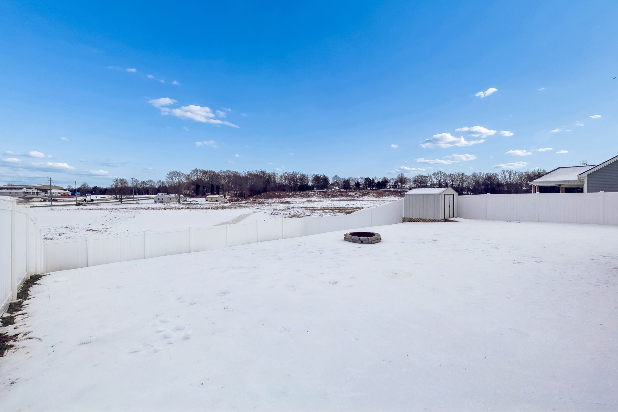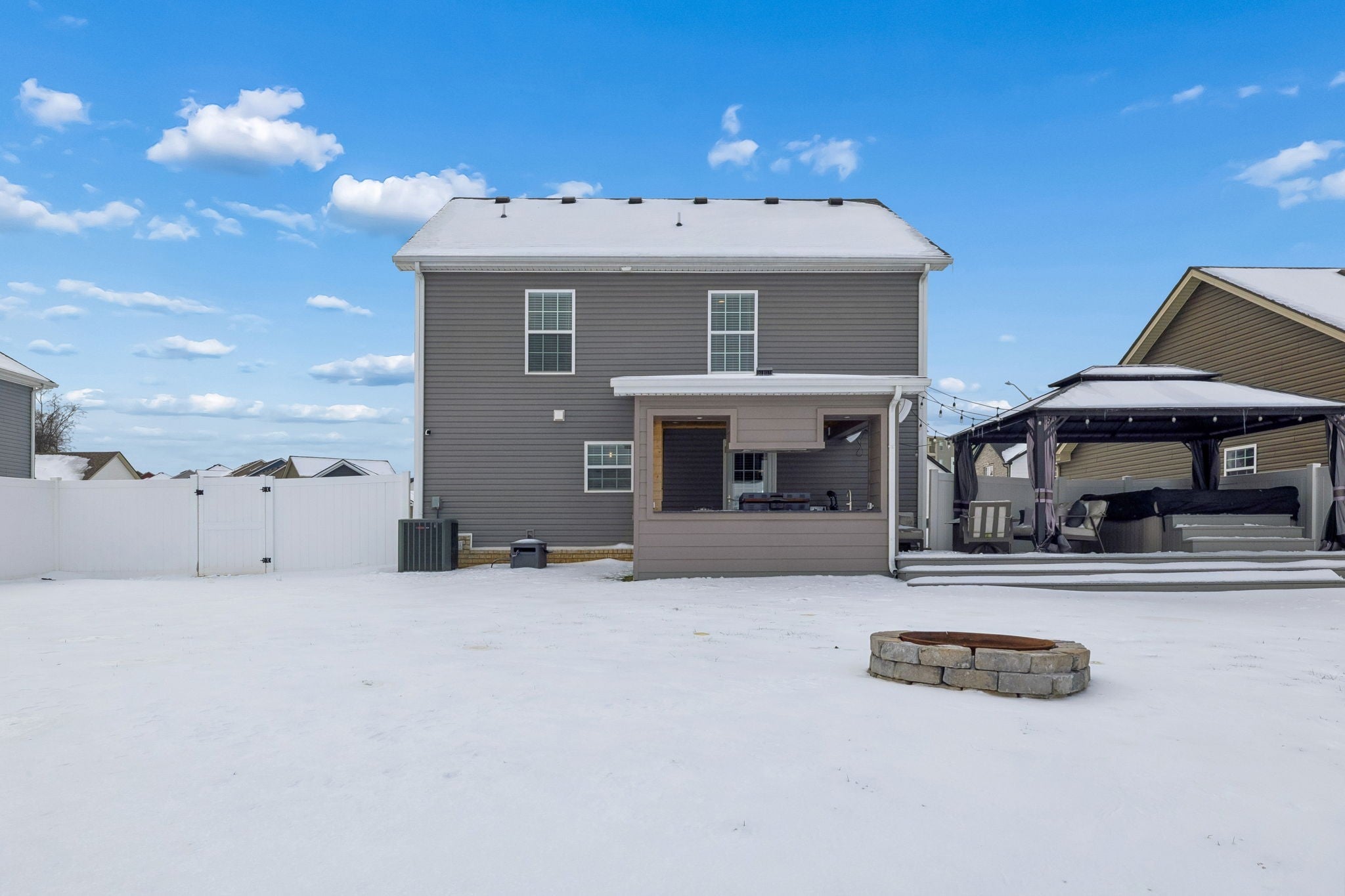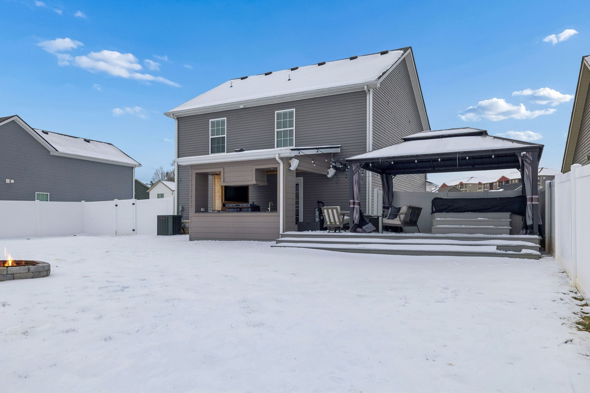 Better than new Clarksville home built in 2022 and thoughtfully customized by the current owner. Featuring a DREAM backyard! This popular Baker Plan offers 3 bedrooms, 2.5 baths of thoughtfully designed living space with stylish updates throughout. The open-concept kitchen, dining, and living areas create an inviting flow ideal for both everyday living and entertaining. Updated fixtures and finishes elevate the home's custom touch. The spacious primary suite features a custom accent wall and an elegant tray ceiling, creating a relaxing retreat. The primary bath includes a spacious tile and glass walk-in shower for added comfort and functionality. Step outside and prepare to be impressed. The fully fenced backyard is an entertainer’s paradise with an outdoor fireplace, TV, hot tub, outdoor kitchen, fire pit, and storage building—your own private oasis ready for year-round enjoyment. An extended driveway offers ample space for trailers, RVs, or additional parking, a rare and valuable upgrade. Additional highlights include an epoxy-coated garage floor for a clean, durable finish. With newer construction, thoughtful upgrades, and outdoor amenities that are hard to find, this home truly stands out. Move-in ready and designed for lifestyle living—this one is a must-see.