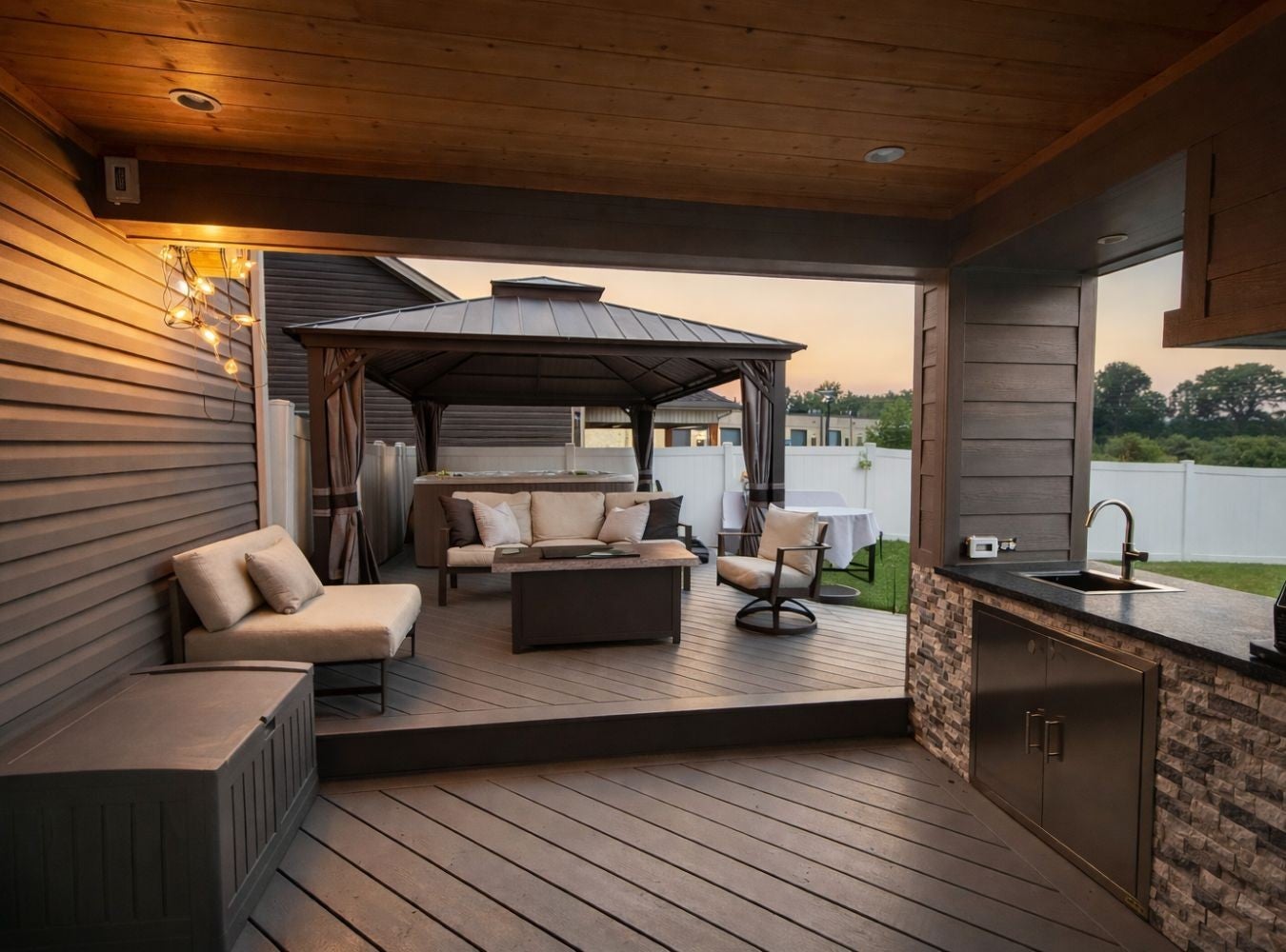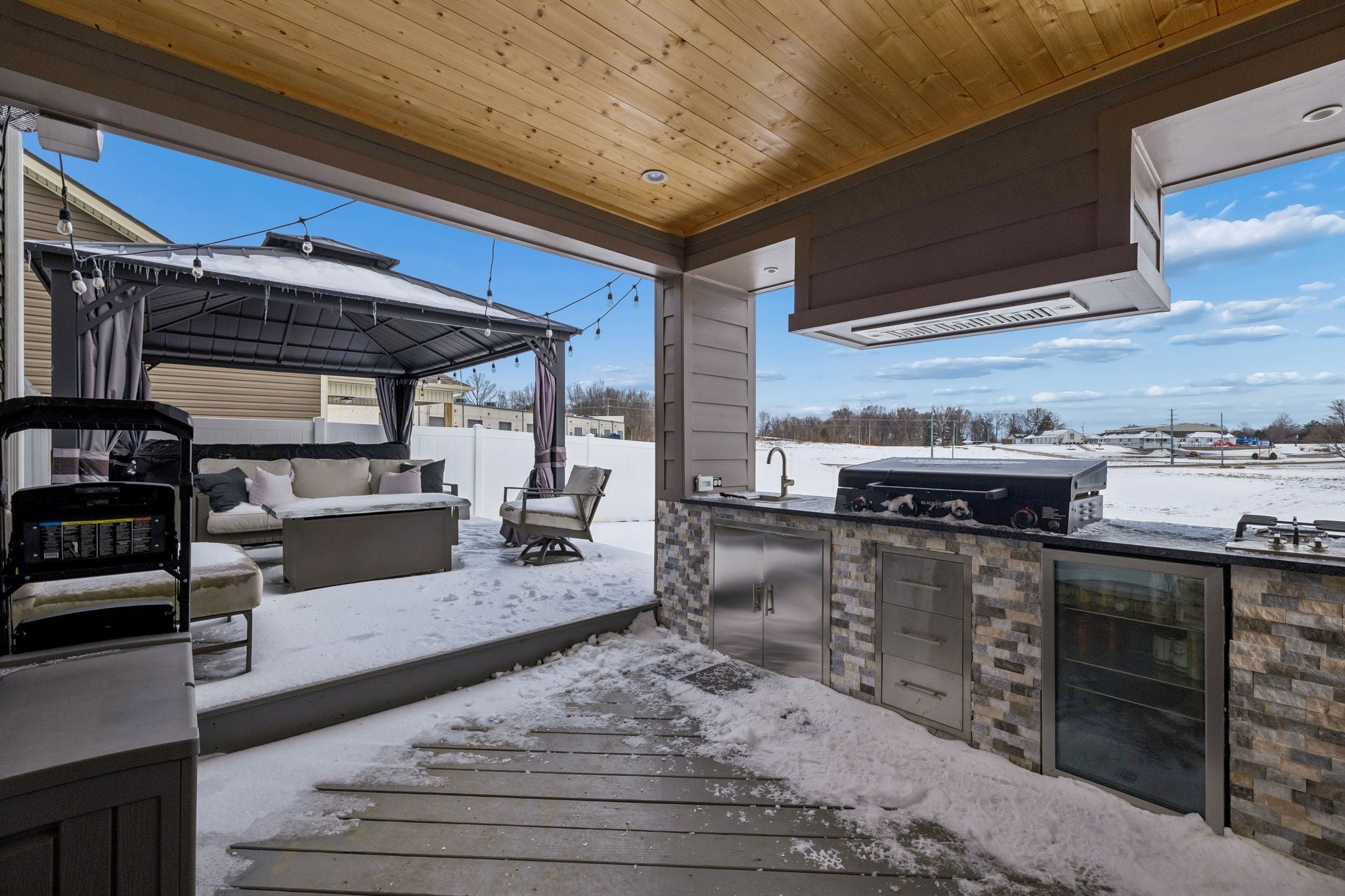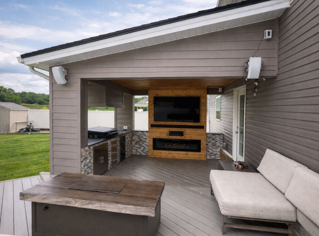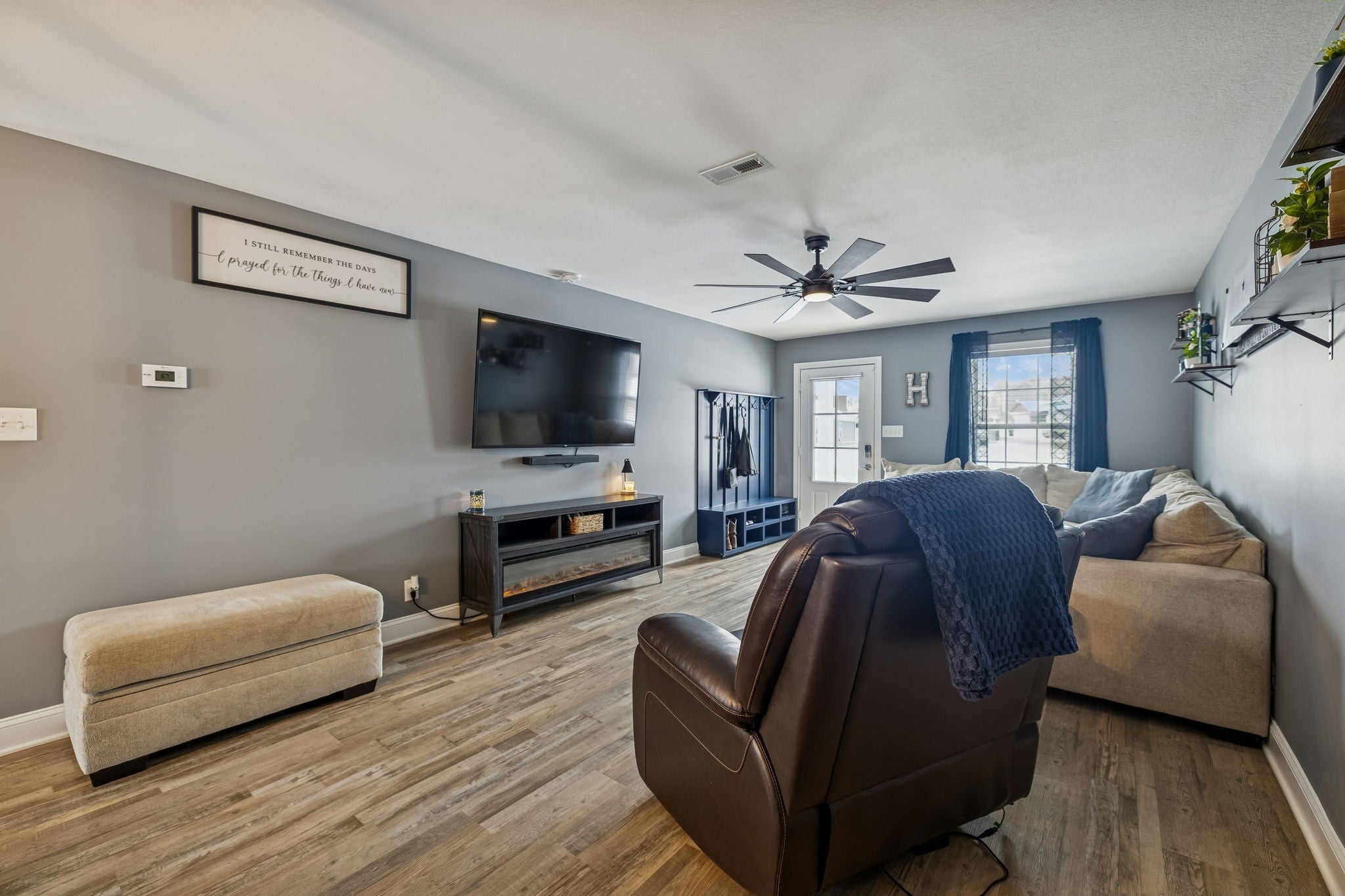 Better than new Clarksville home built in 2022 and thoughtfully customized by the current owner. Featuring a DREAM backyard! This popular Baker Plan offers 3 bedrooms, 2.5 baths of thoughtfully designed living space with stylish updates throughout. The open-concept kitchen, dining, and living areas create an inviting flow ideal for both everyday living and entertaining. Updated fixtures and finishes elevate the home's custom touch. The spacious primary suite features a custom accent wall and an elegant tray ceiling, creating a relaxing retreat. The primary bath includes a spacious tile and glass walk-in shower for added comfort and functionality. Step outside and prepare to be impressed. The fully fenced backyard is an entertainer’s paradise with an outdoor fireplace, TV, hot tub, outdoor kitchen, fire pit, and storage building—your own private oasis ready for year-round enjoyment. An extended driveway offers ample space for trailers, RVs, or additional parking, a rare and valuable upgrade. Additional highlights include an epoxy-coated garage floor for a clean, durable finish. With newer construction, thoughtful upgrades, and outdoor amenities that are hard to find, this home truly stands out. Move-in ready and designed for lifestyle living—this one is a must-see.