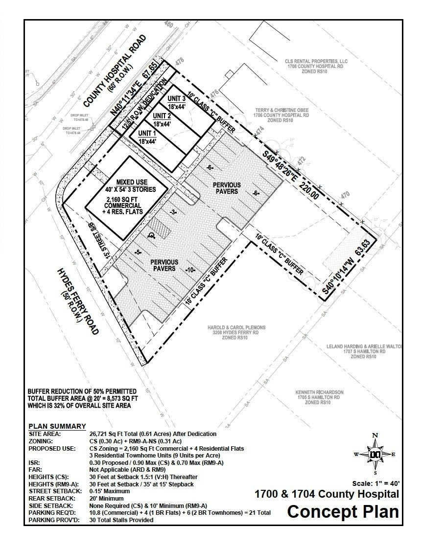 Unique 3 lot development opportunity on a highly visible corner location. Two CS-zoned lots are ideal for a mixed-use project, allowing commercial space on the ground level with residential units above. The adjacent RM9-zoned lot offers the potential for three townhomes and can be accessed via either County Hospital Road or Hydes Ferry Road. Luxury short-term rentals are located on the opposite corner, highlighting the area’s strong demand. Lots may be purchased together or separately. Site plans and surveys are available.