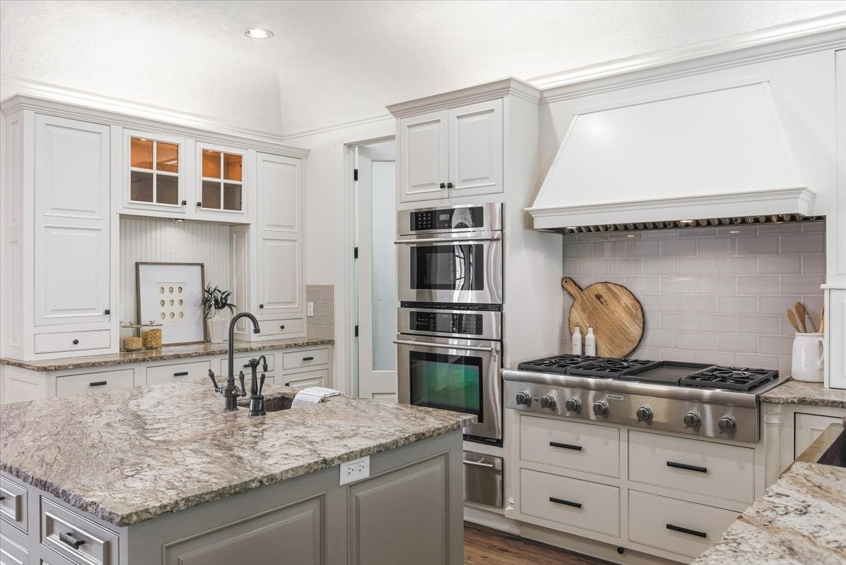- Electric Oven, Built-In Gas Range, Dishwasher, Disposal, Microwave, Refrigerator, Stainless Steel Appliance(s)