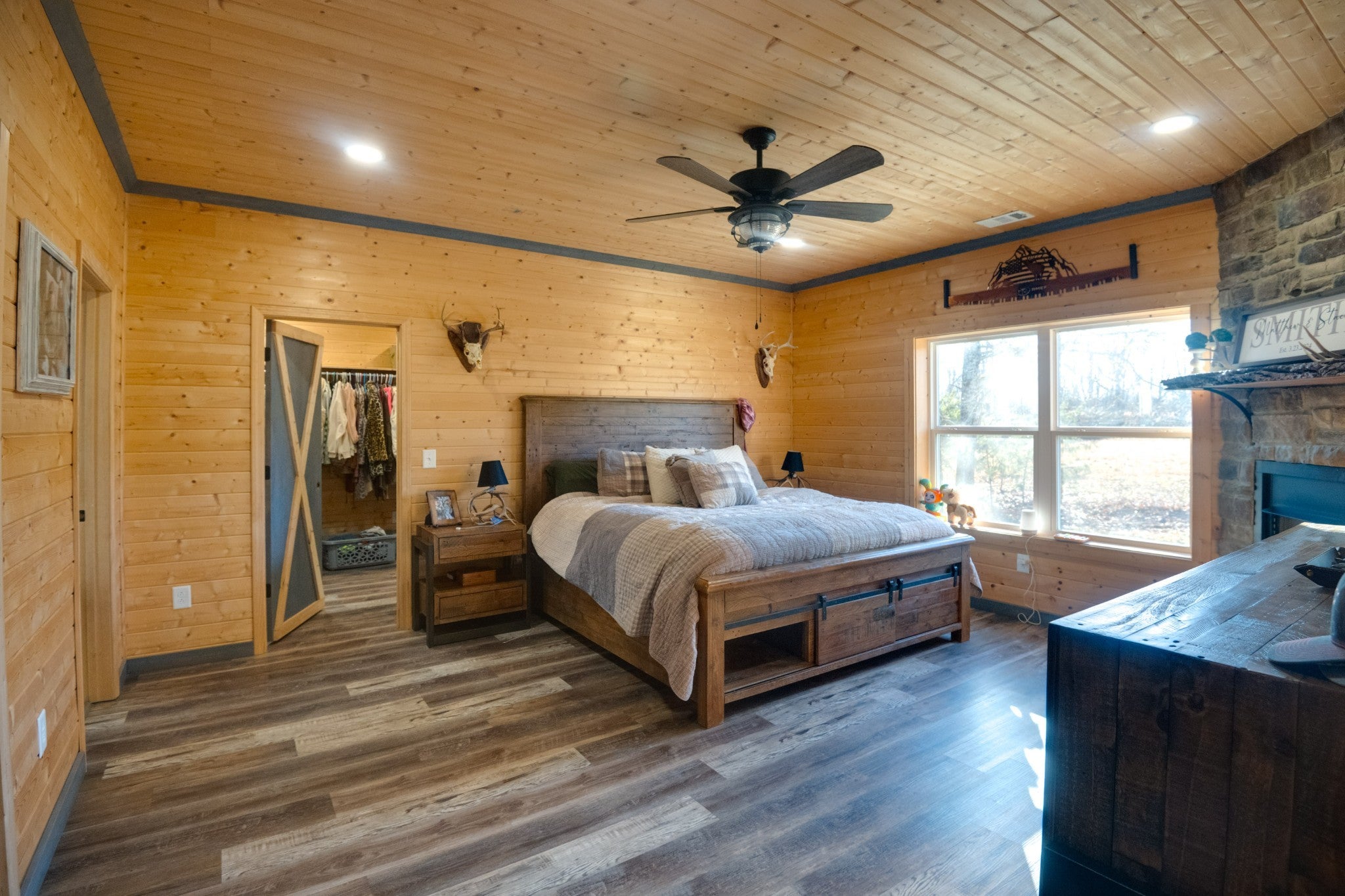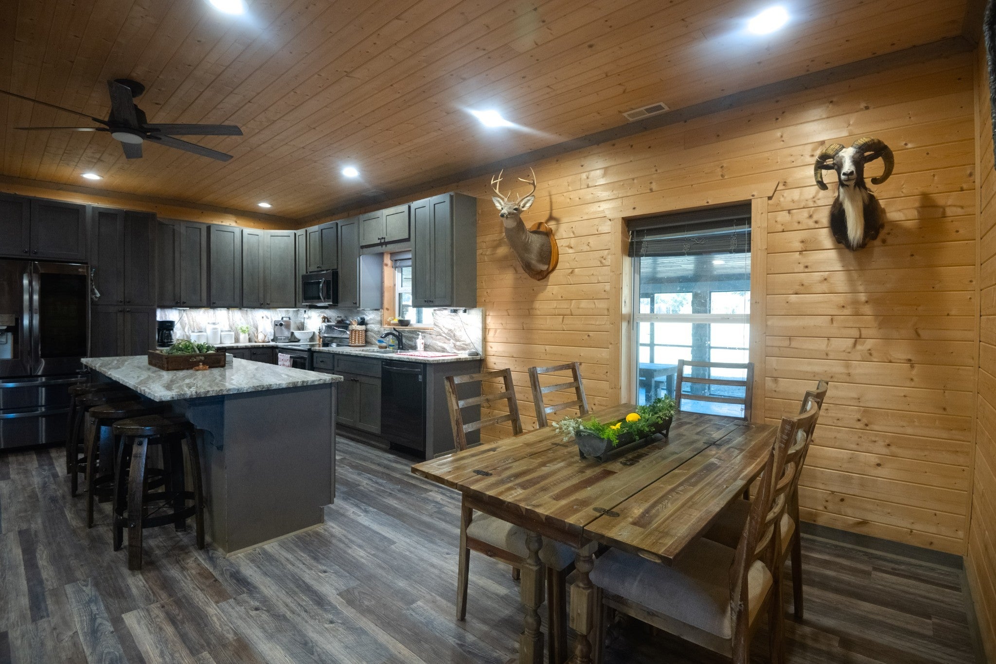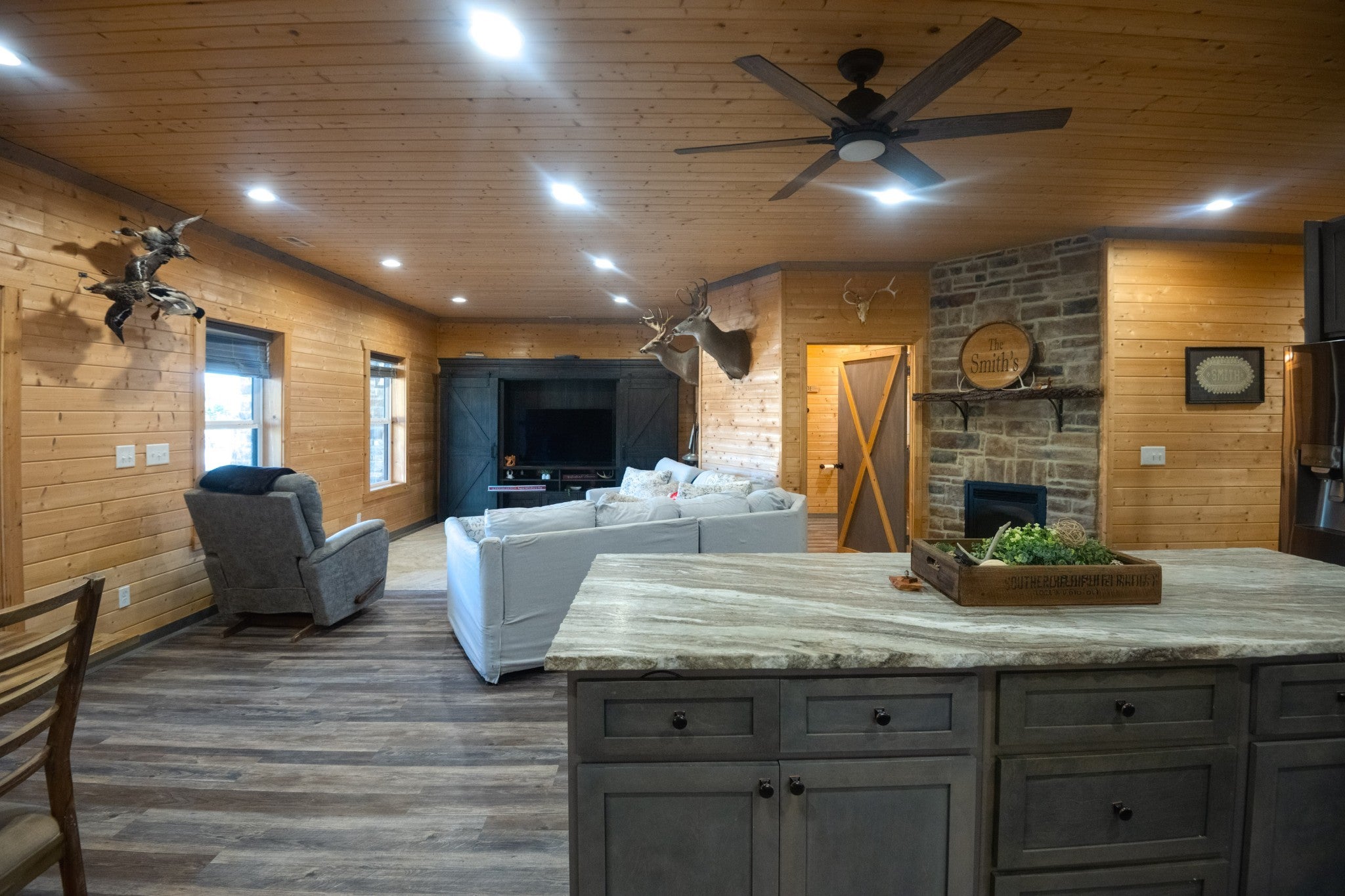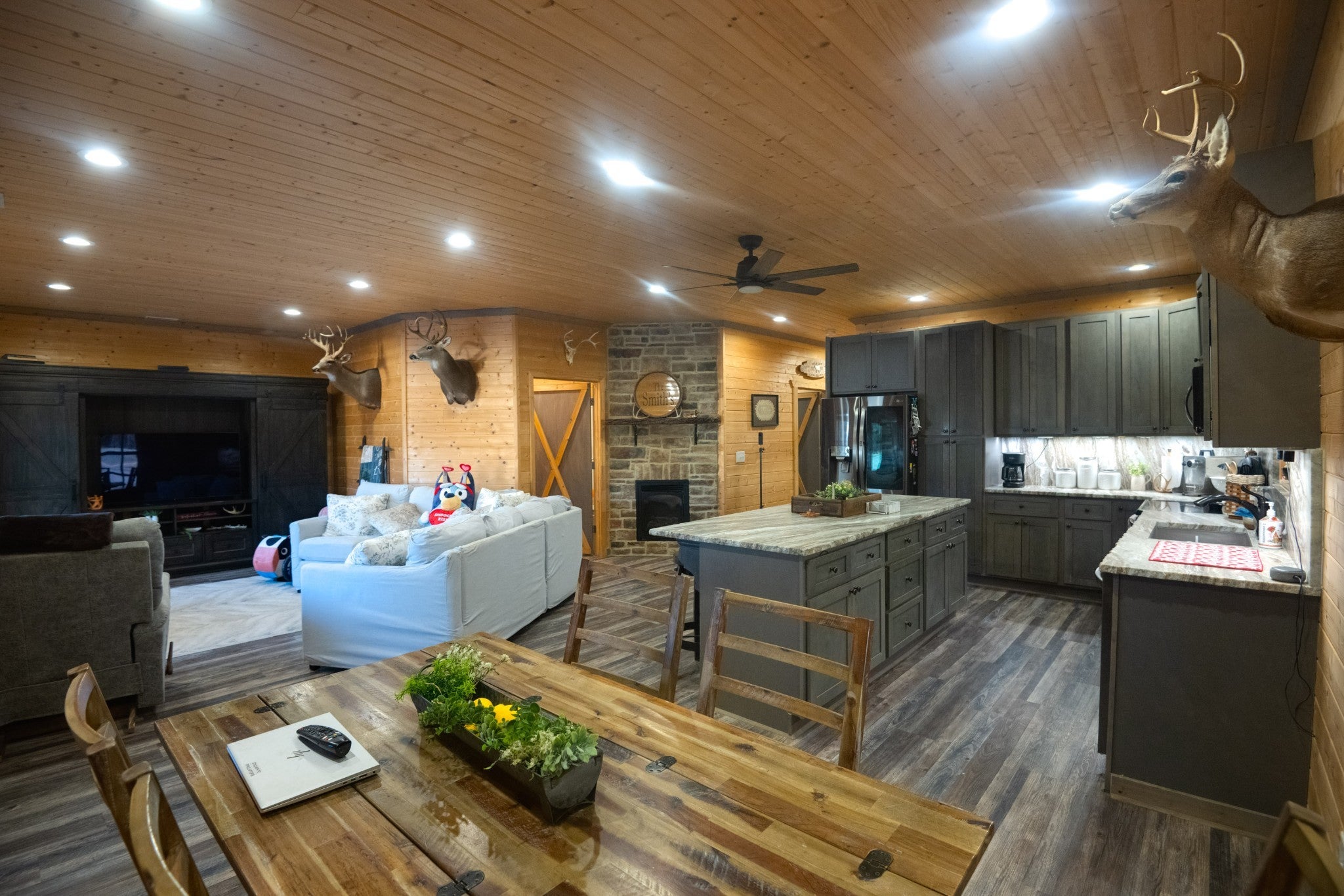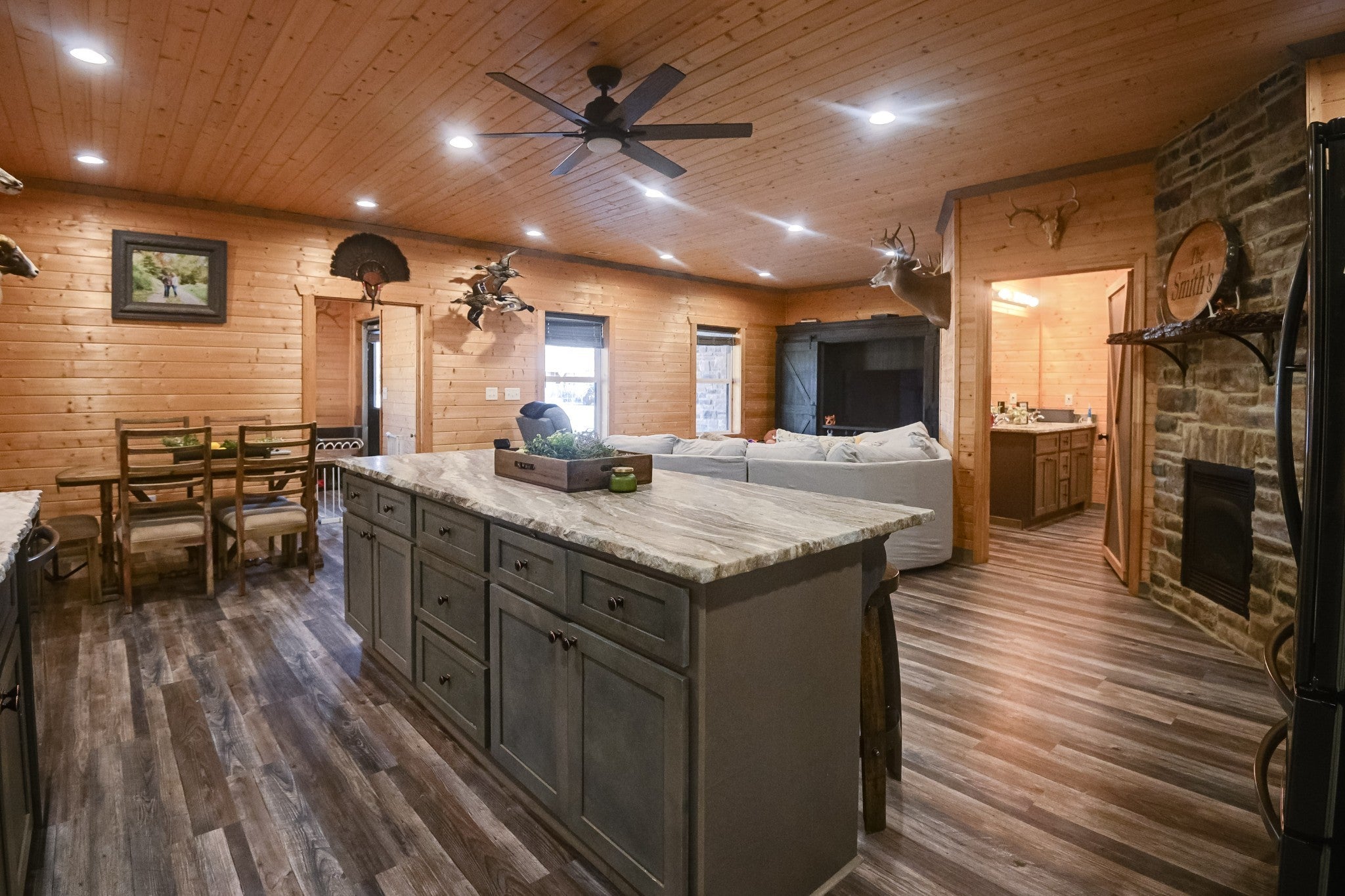 This stunning barndominium blends rustic charm with modern luxury on 2.35 private acres, offering over 2,800 sq ft of thoughtfully designed living space. The 5-bedroom home features tongue-and-groove walls and ceilings, a chef’s kitchen with leathered granite countertops, walk-in pantry, mud room, and tankless water heater. Enjoy three fireplaces, including a wood-burning fireplace on the screened-in porch/garage, plus a dedicated home office for work or creative space. The primary suite includes a safe room and spa-style tiled shower with dual shower heads, while a second master suite is perfect for guests or multi-generational living. The showstopper is the nearly 4,000 sq ft heated and cooled shop, fully spray-foam insulated with a loft, full bathroom, and expansive space ideal for vehicles, hobbies, or a home-based business. A rare property that delivers space, comfort, and versatility—this barndominium is more than a home, it’s a lifestyle.