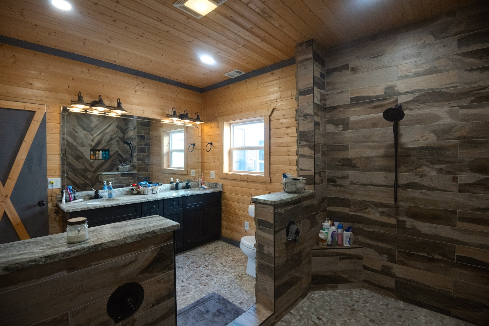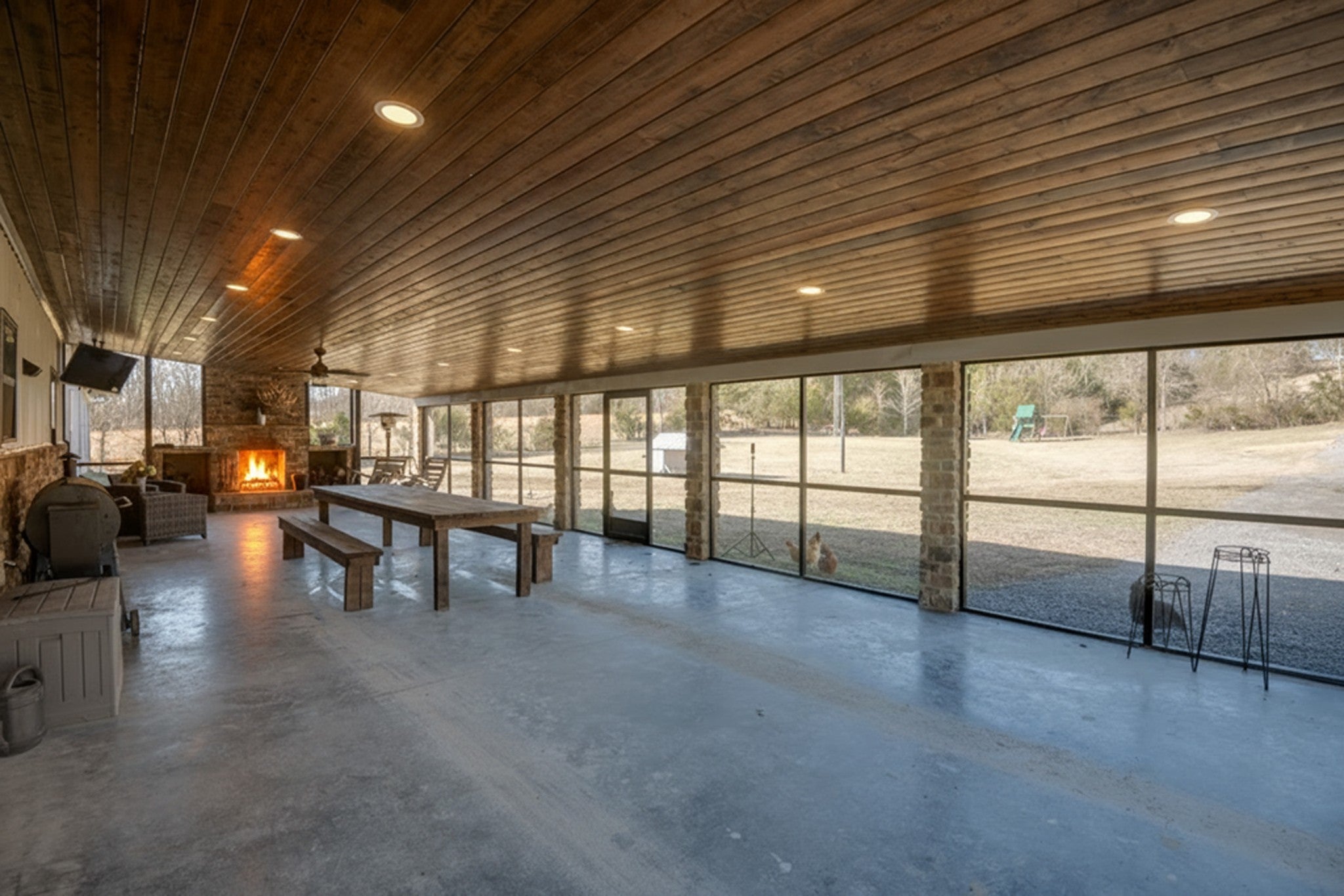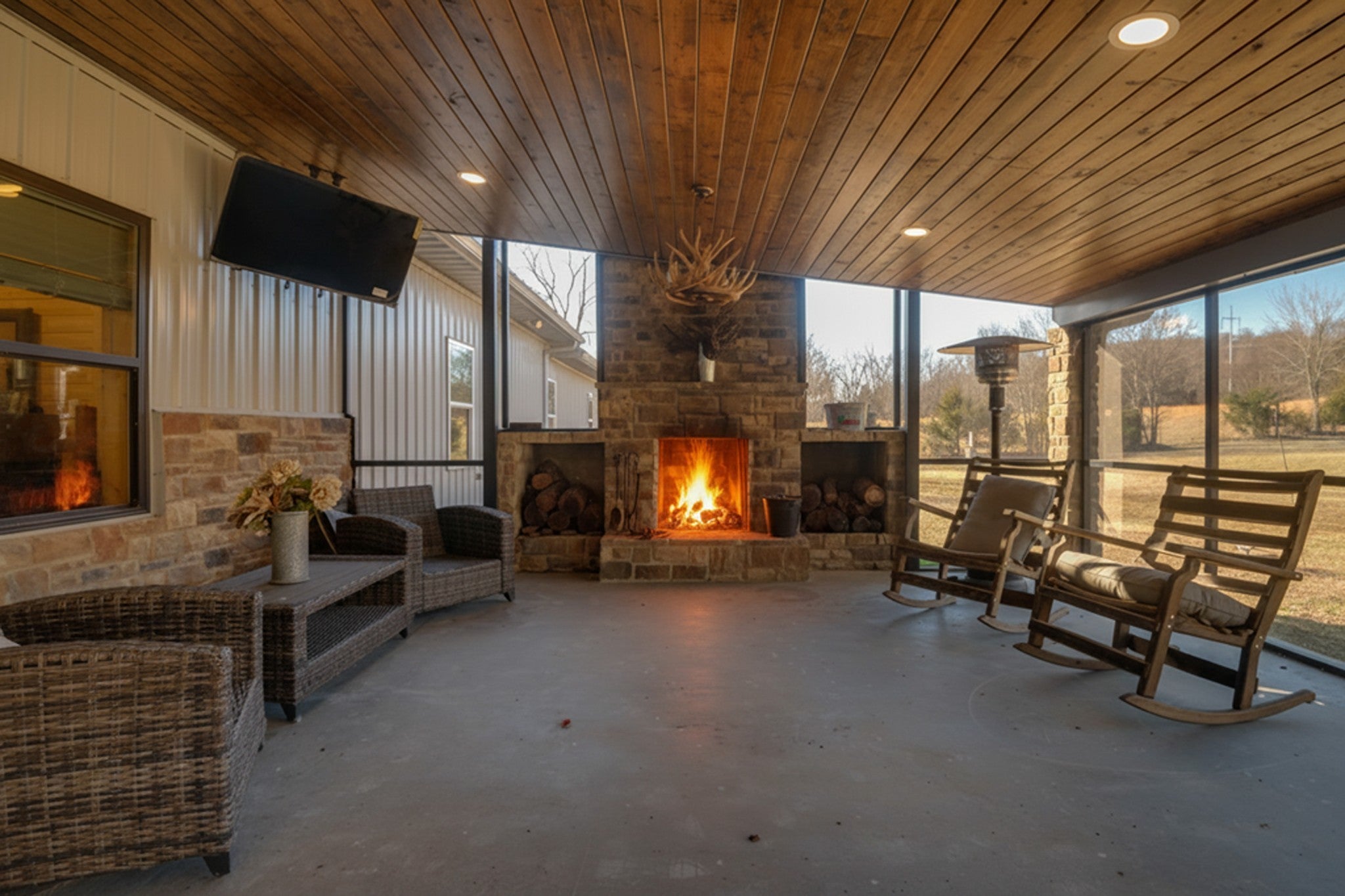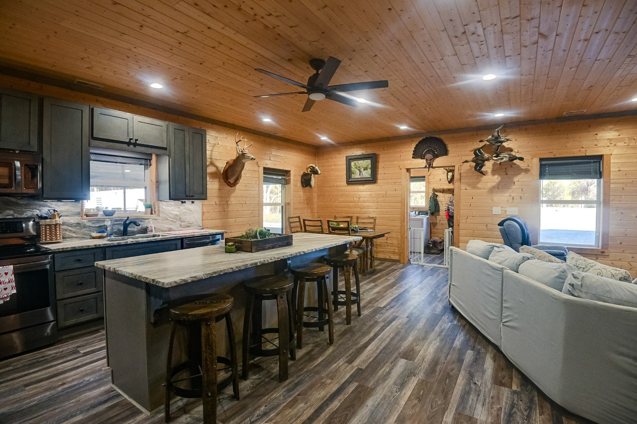 This stunning barndominium blends rustic charm with modern luxury on 2.35 private acres, offering over 2,800 sq ft of thoughtfully designed living space. The 5-bedroom home features tongue-and-groove walls and ceilings, a chef’s kitchen with leathered granite countertops, walk-in pantry, mud room, and tankless water heater. Enjoy three fireplaces, including a wood-burning fireplace on the screened-in porch/garage, plus a dedicated home office for work or creative space. The primary suite includes a safe room and spa-style tiled shower with dual shower heads, while a second master suite is perfect for guests or multi-generational living. The showstopper is the nearly 4,000 sq ft heated and cooled shop, fully spray-foam insulated with a loft, full bathroom, and expansive space ideal for vehicles, hobbies, or a home-based business. A rare property that delivers space, comfort, and versatility—this barndominium is more than a home, it’s a lifestyle.