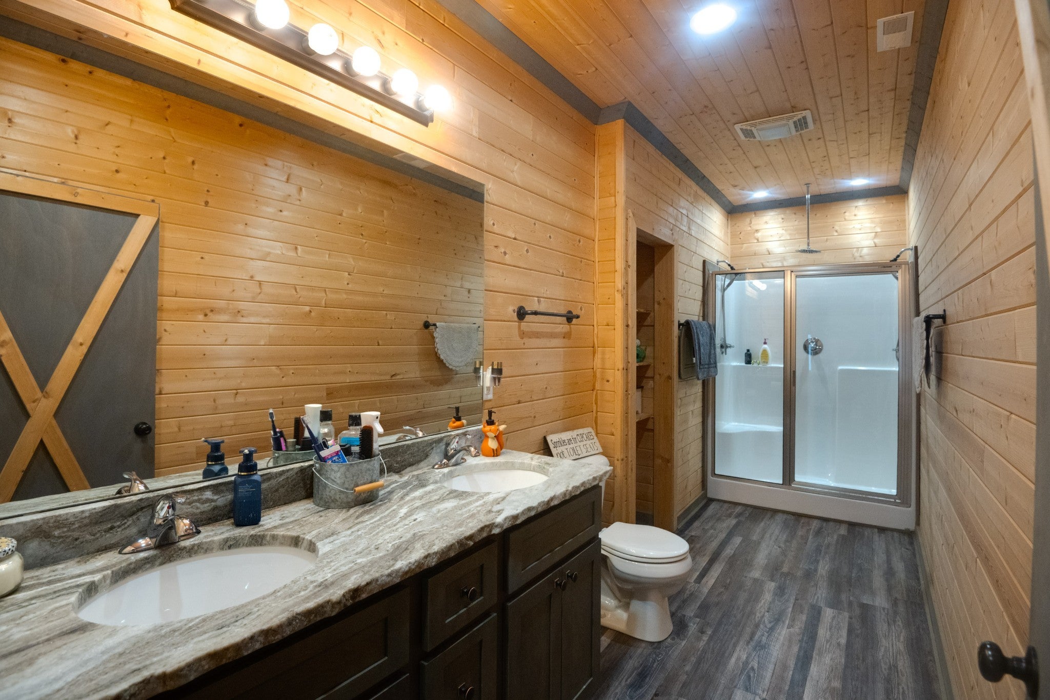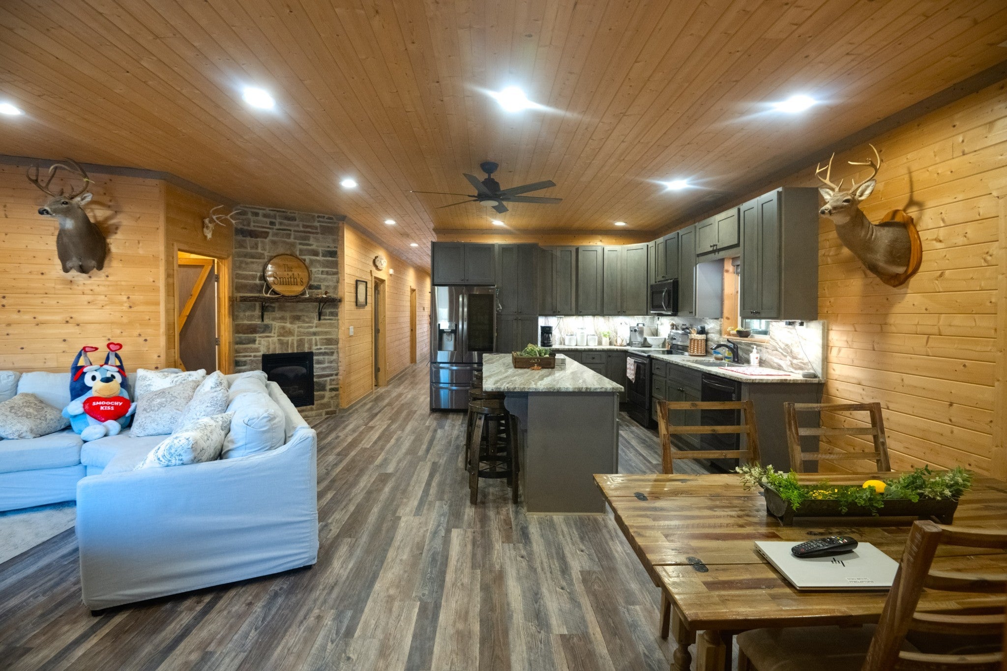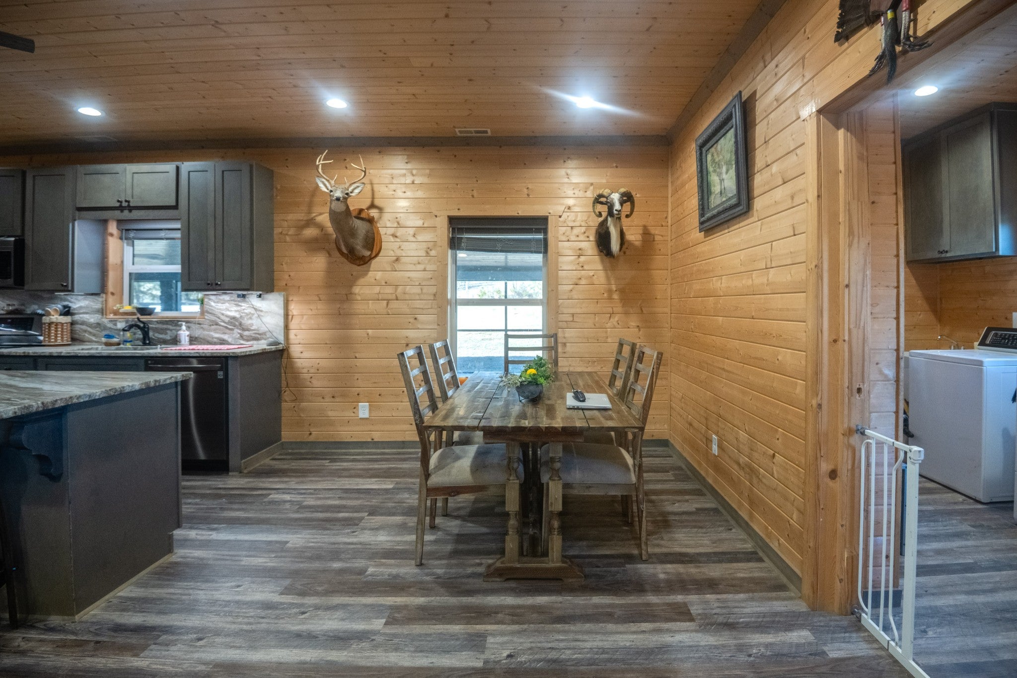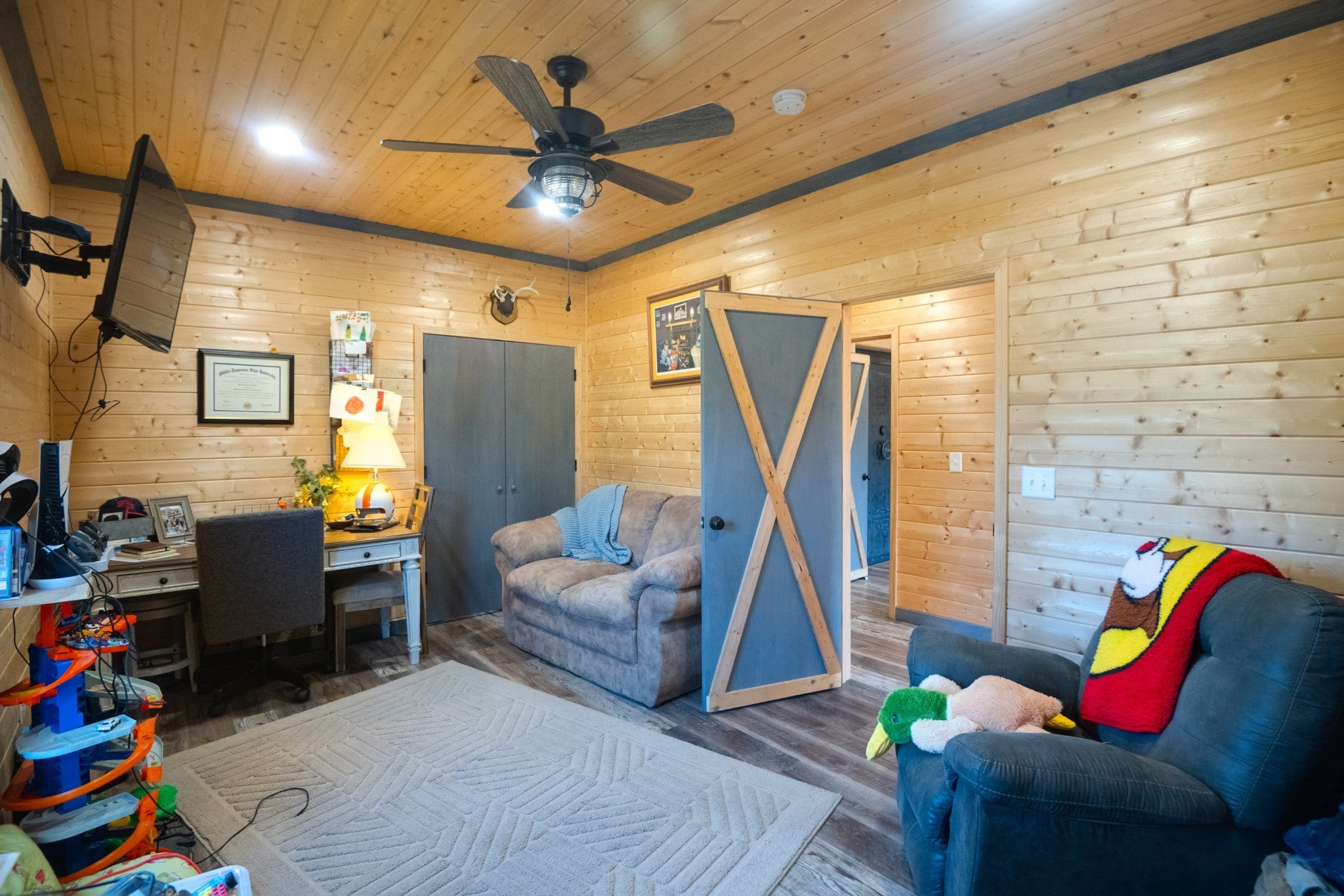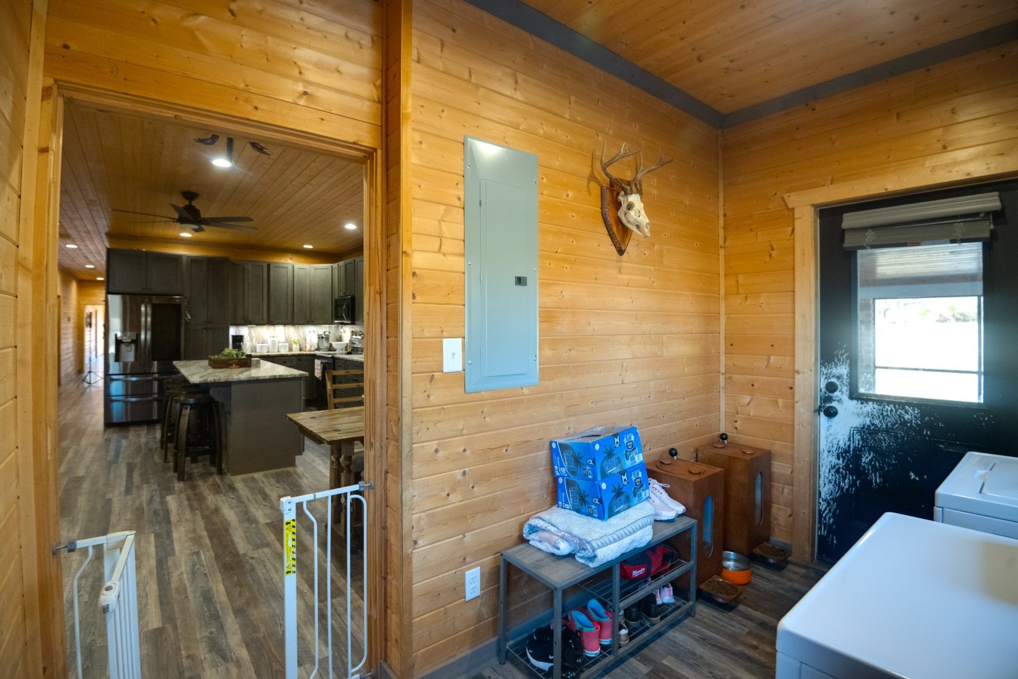 This stunning barndominium blends rustic charm with modern luxury on 2.35 private acres, offering over 2,800 sq ft of thoughtfully designed living space. The 5-bedroom home features tongue-and-groove walls and ceilings, a chef’s kitchen with leathered granite countertops, walk-in pantry, mud room, and tankless water heater. Enjoy three fireplaces, including a wood-burning fireplace on the screened-in porch/garage, plus a dedicated home office for work or creative space. The primary suite includes a safe room and spa-style tiled shower with dual shower heads, while a second master suite is perfect for guests or multi-generational living. The showstopper is the nearly 4,000 sq ft heated and cooled shop, fully spray-foam insulated with a loft, full bathroom, and expansive space ideal for vehicles, hobbies, or a home-based business. A rare property that delivers space, comfort, and versatility—this barndominium is more than a home, it’s a lifestyle.