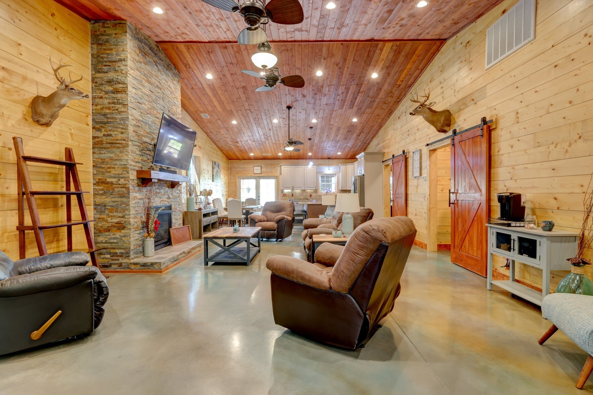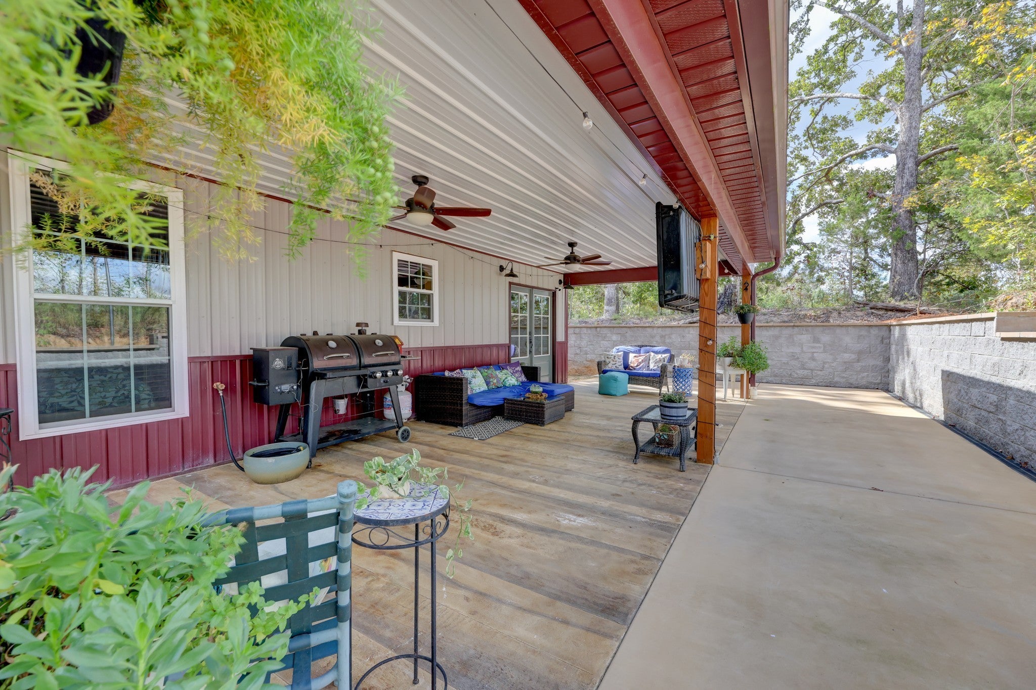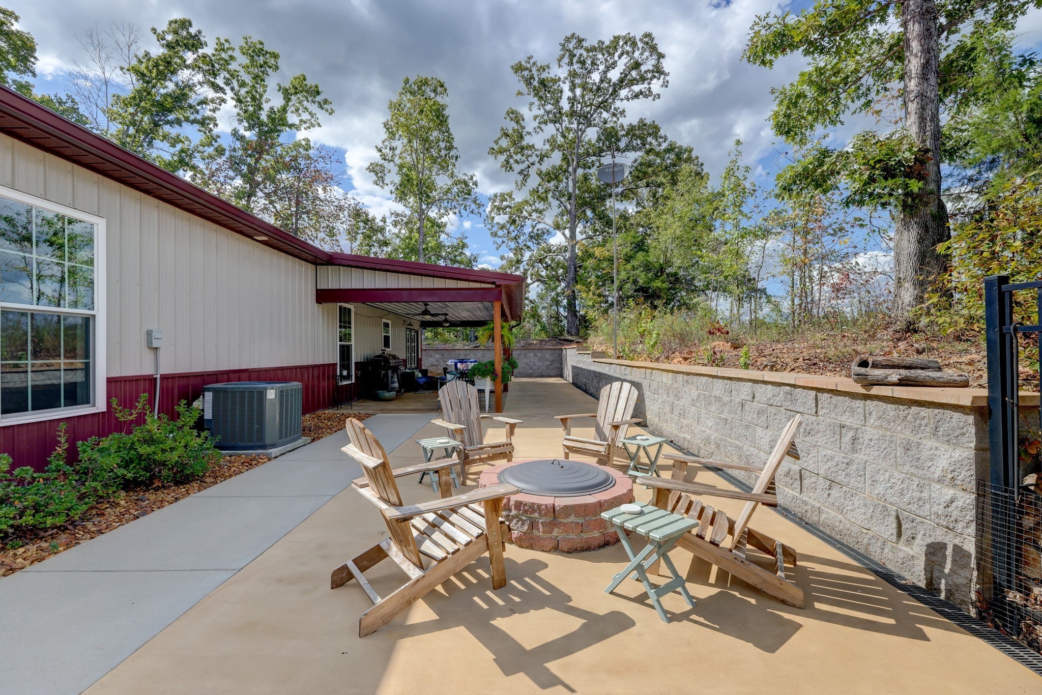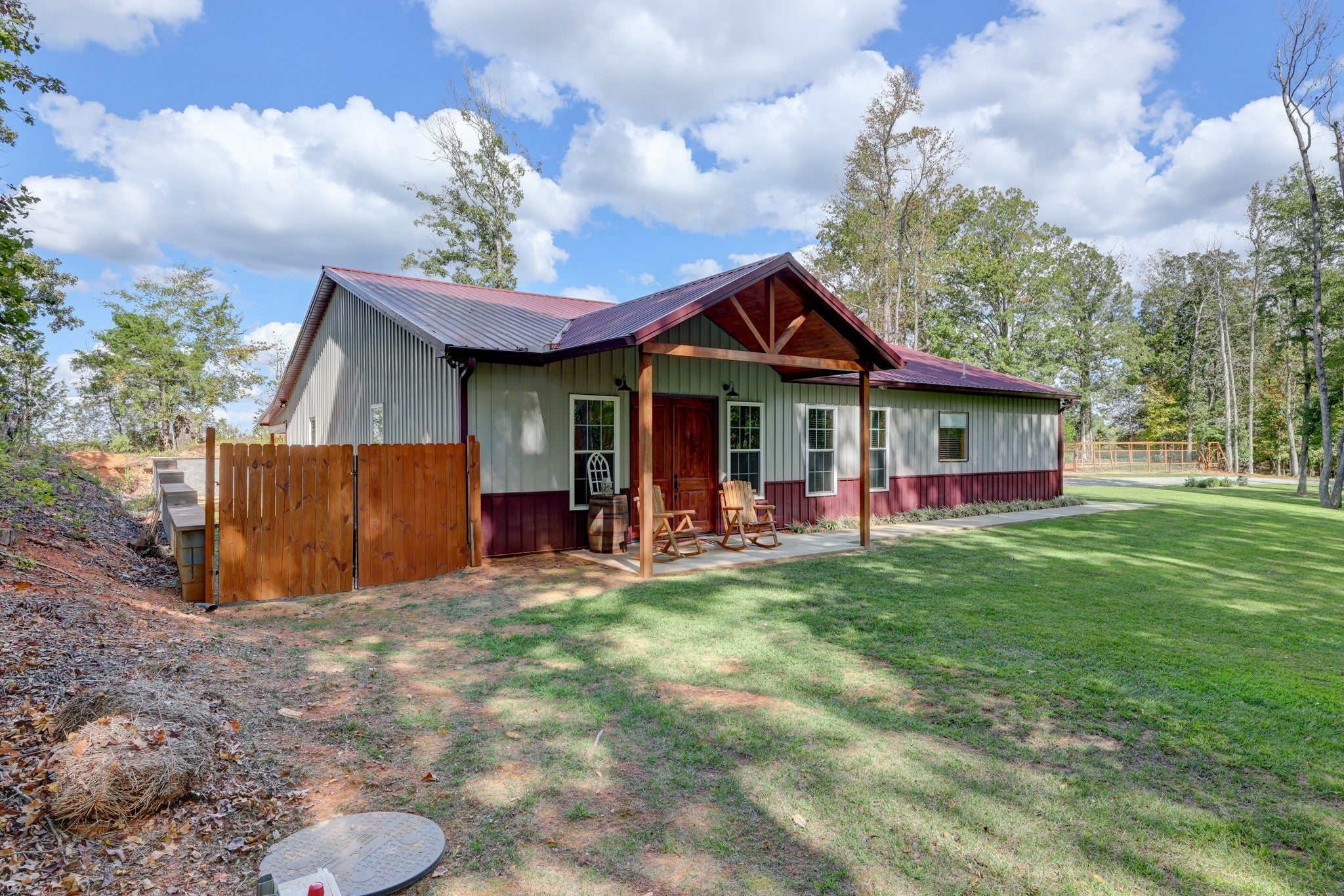 Welcome home to this breathtaking barndominium, where quality craftsmanship meets country serenity. Nestled on 4 private acres, this corrugated metal-constructed home with a durable metal roof (complete with leaf guard) was built with exceptional attention to detail and energy efficiency in mind—featuring spray foam insulation throughout the entire structure, 4” to 6” thick, keeping the home comfortable year-round. Step through the grand 8-foot solid pecan wood double doors into a bright, open-concept living space. Beautiful floors flow throughout, leading to a spectacular vented propane fireplace—the perfect centerpiece for cozy evenings. The custom kitchen is a chef’s dream, featuring marble countertops, a farmhouse sink, custom cabinetry, stainless steel appliances and a spacious open pantry. The primary suite is a peaceful retreat, wrapped in warm pine wood walls with solid wood blinds that convey. Continue into the luxurious primary bath, where you’ll find a clawfoot tub, custom cabinetry and a gorgeous walk-in shower—a true spa-like escape. The primary closet offers generous space and includes a walk-in storm shelter certified for Category 4 winds and equipped with an automatic light. Once you’ve made it through the rest of this beauty and all that it has to offer, step out back through the double French doors to your private oasis. Enjoy the covered back patio with cement overlay floors designed to look like wood, dual ceiling fans, a designated space pre-wired for a hot tub and a fire pit area — all with no view of neighbors for ultimate privacy. Every inch of this home was thoughtfully designed, from the foam-insulated garage to the portable generator hookup outside the property, ensuring comfort and peace of mind in any season. If you’ve been searching for the perfect mix of rustic elegance, privacy and practicality—this one-of-a-kind barndominium is it.