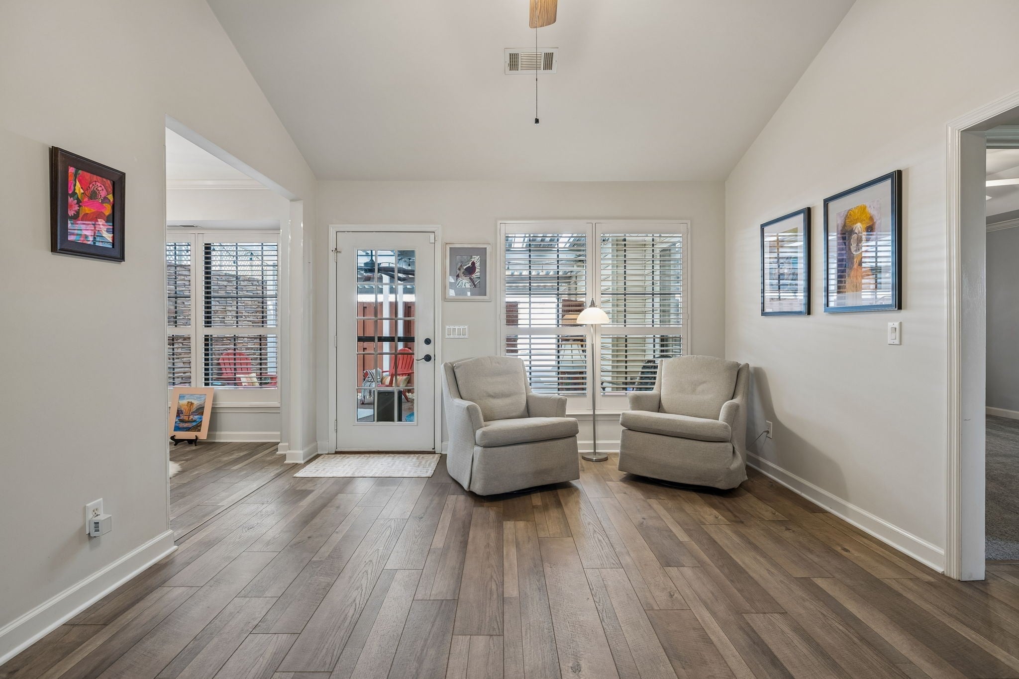 Updated and move in ready! Full covering over patio creating year round enjoyment. Washer/dryer included with t. v.'s over fireplace and front/office bedroom,as well as bonus room t. v. All appliances and new bosch ss quiet dishwasher. New roof, new front windows, new cabinets, and plantation shutters throughout. Wood flooring on main level living with lots of storage with shelves in outside utility room and walk in attic. New walk in shower in guest bath and renovated primary bath. Park views from the front with privacy in the back. 2 car carport and fenced private patio. This home has been truly loved in this awesome location, 55+ Morningside community. HVAC and furnace 3 yrs. new. Beautiful landscaped side yard with irrigation. Water heater 1 yr old as well as smoke detectors. Microwave 2 yrs. old