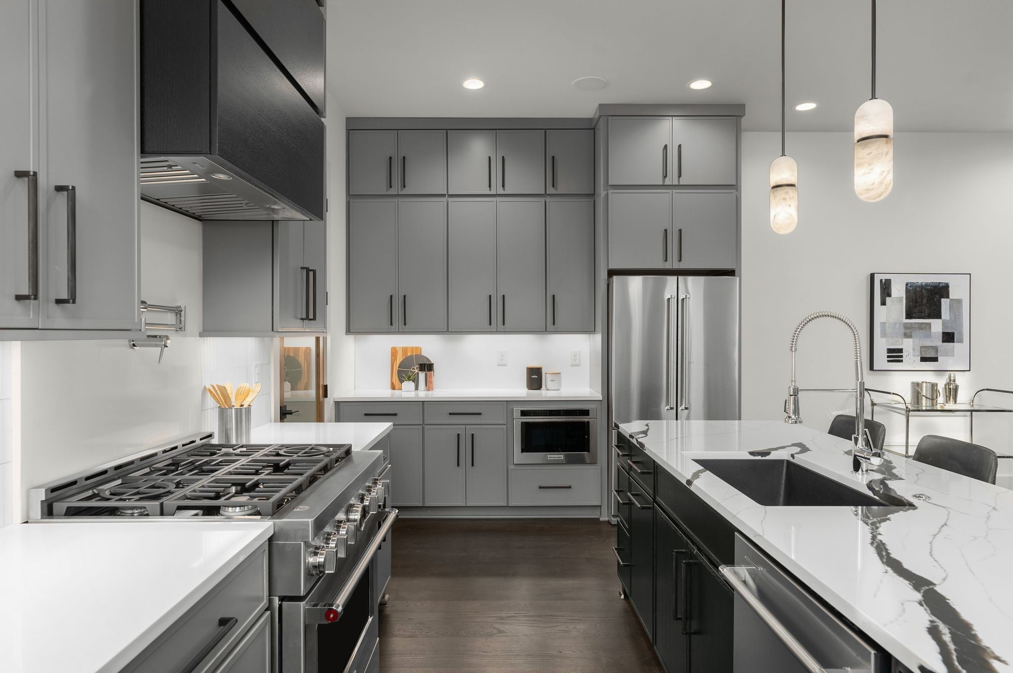 - Gas Oven, Gas Range, Dishwasher, Disposal, Microwave, Refrigerator, Stainless Steel Appliance(s), Smart Appliance(s)