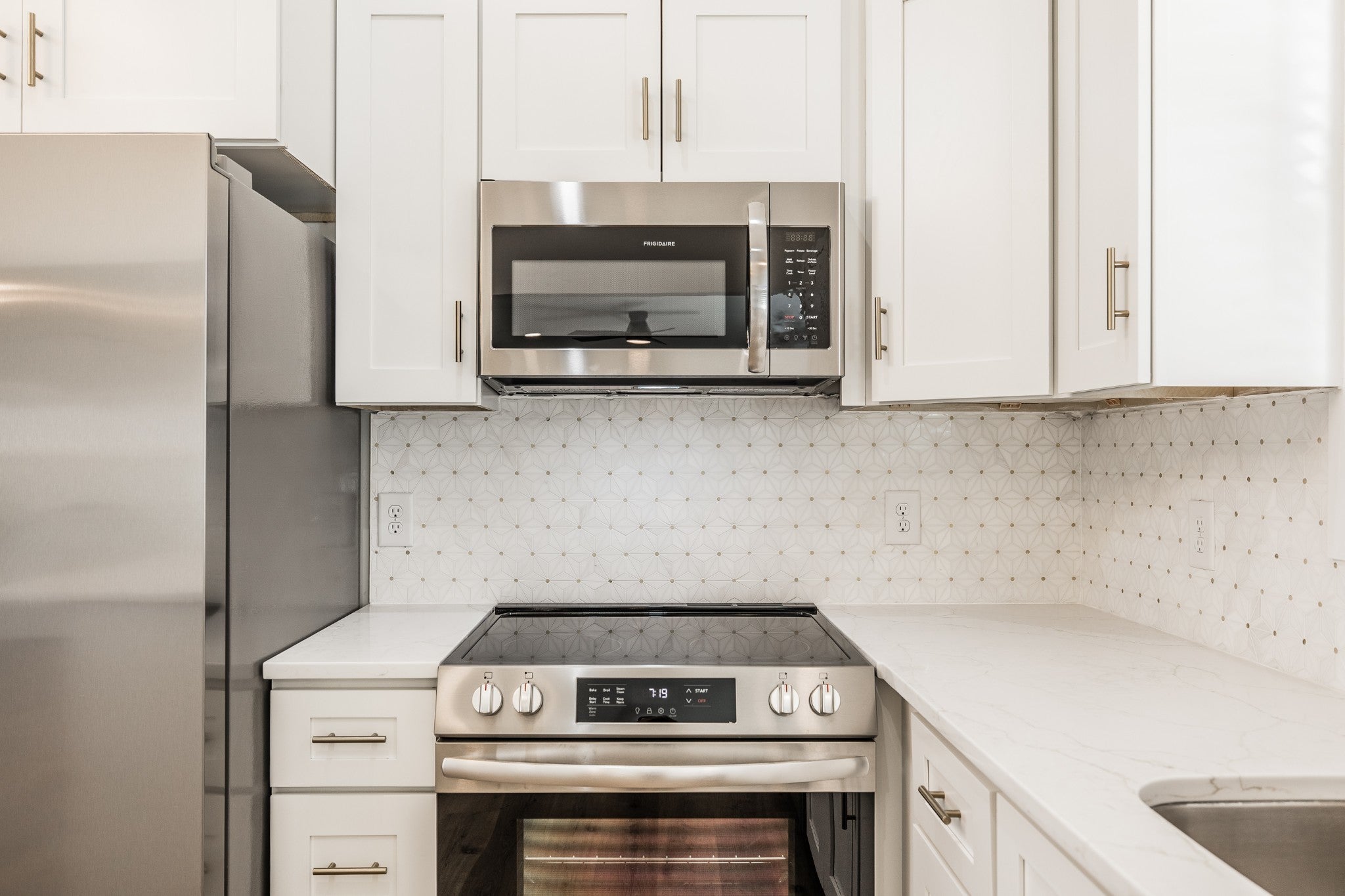 - Electric Range, Dishwasher, Disposal, Microwave, Refrigerator, Stainless Steel Appliance(s)