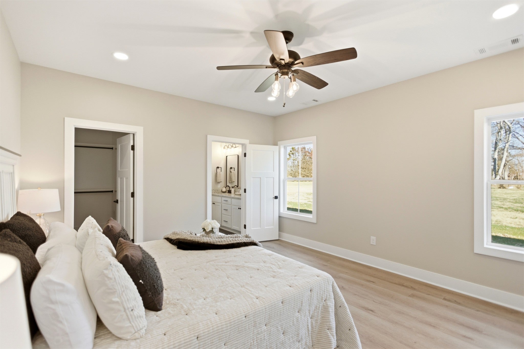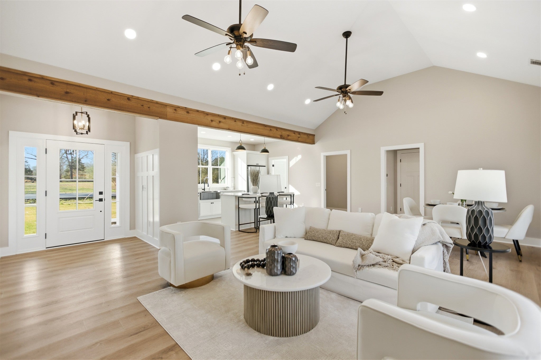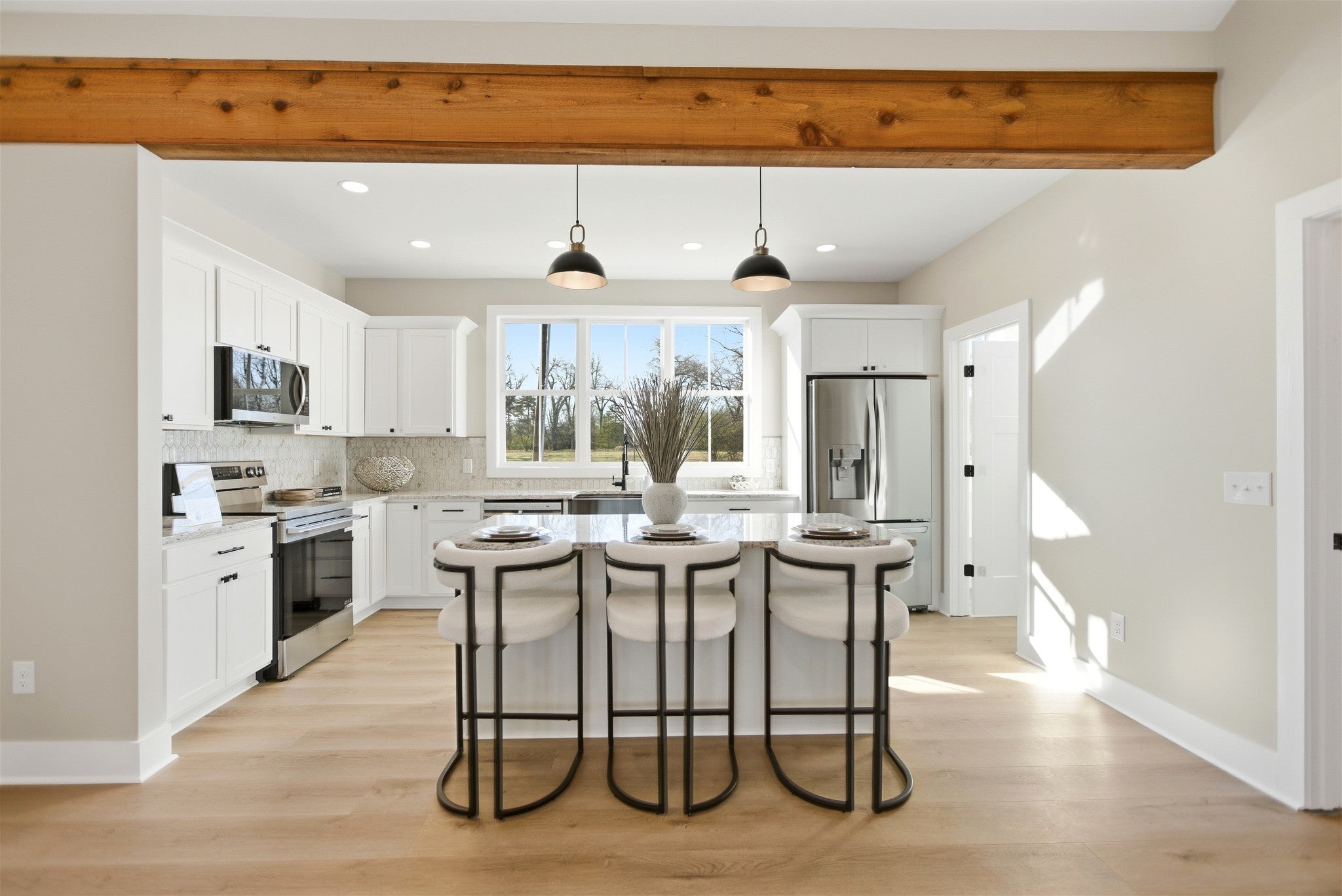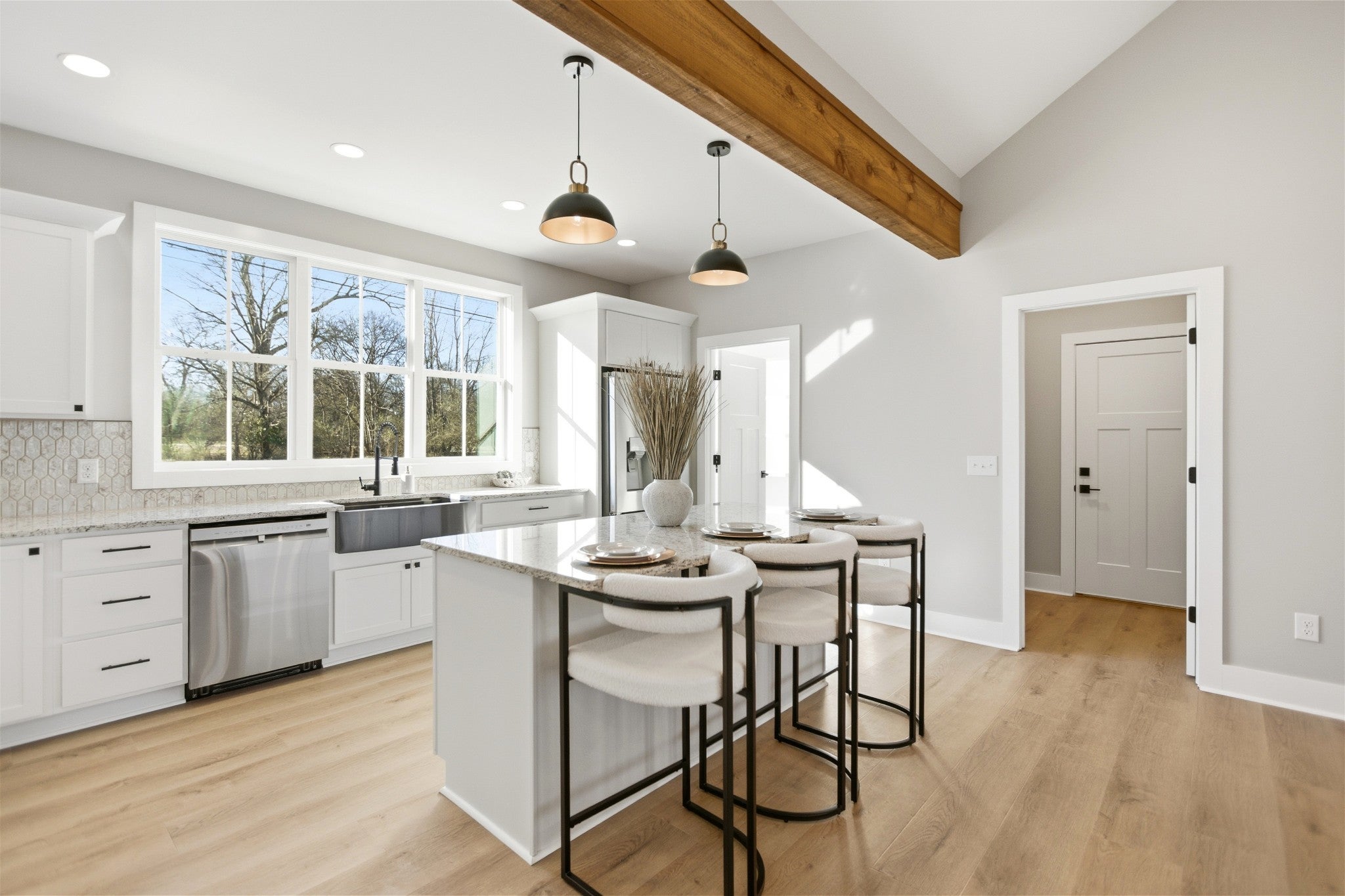 Welcome to this stunning newly constructed home where style, comfort, and quality come together seamlessly. Step inside the inviting entry foyer and be greeted by a beautiful judges-panel feature wall that sets the tone for the craftsmanship found throughout. This thoughtfully designed 3-bedroom, 2-bathroom home offers an open-concept layout with luxury vinyl plank flooring spanning the entire space. The spacious kitchen is a true centerpiece, complete with a large island, sleek granite countertops, and an oversized pantry. It flows effortlessly into the great room, highlighted by impressive vaulted ceilings, perfect for entertaining or everyday living. The split-bedroom floorplan ensures privacy, with the primary suite serving as a relaxing retreat. Enjoy a custom tile shower, double vanities, and a custom walk-in closet designed for maximum organization. Step outside to a covered patio, ideal for morning coffee or evening gatherings. This exceptional home blends modern finishes with functional design—don’t miss your opportunity to make 90 Kings Lane yours!