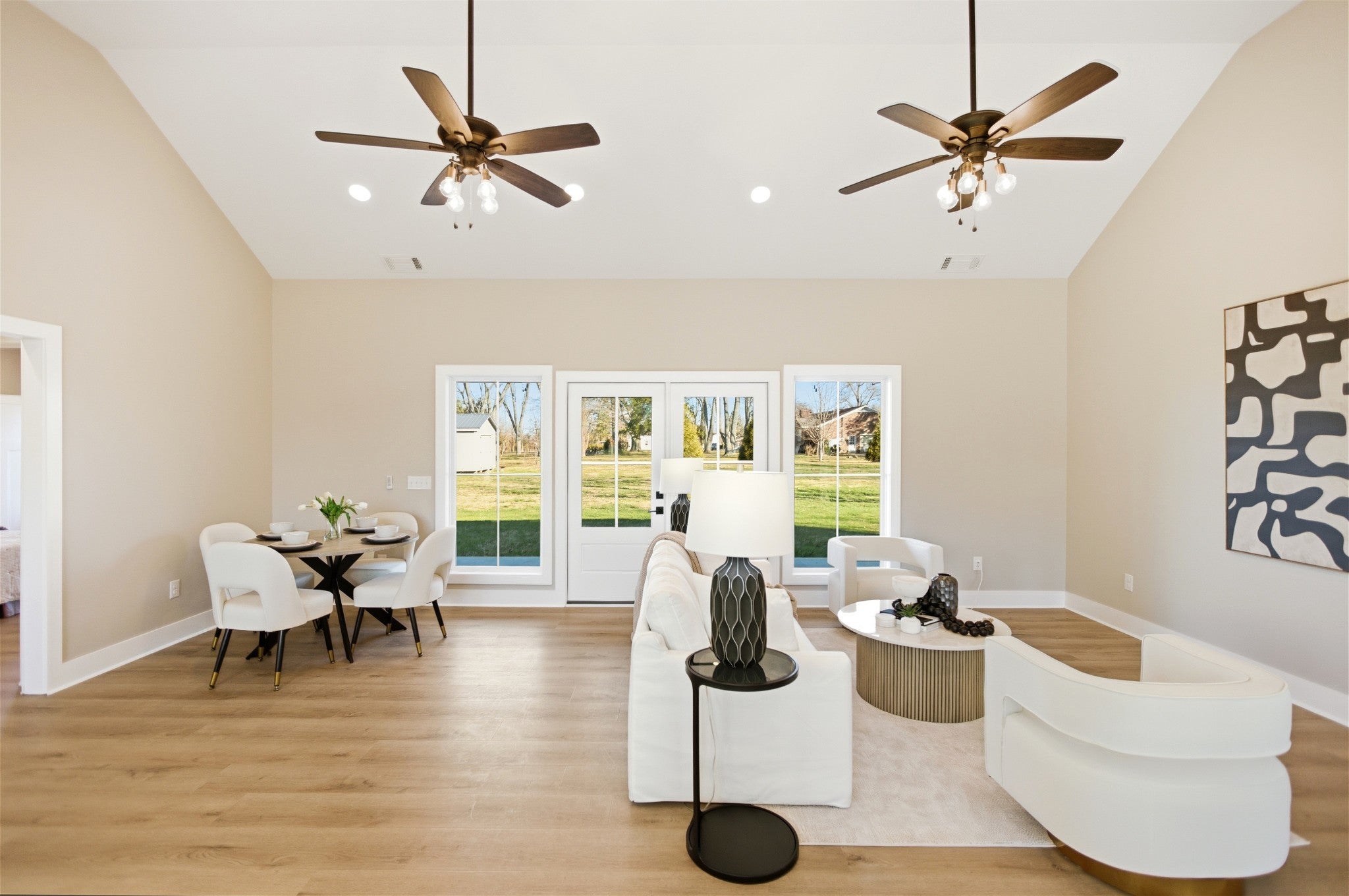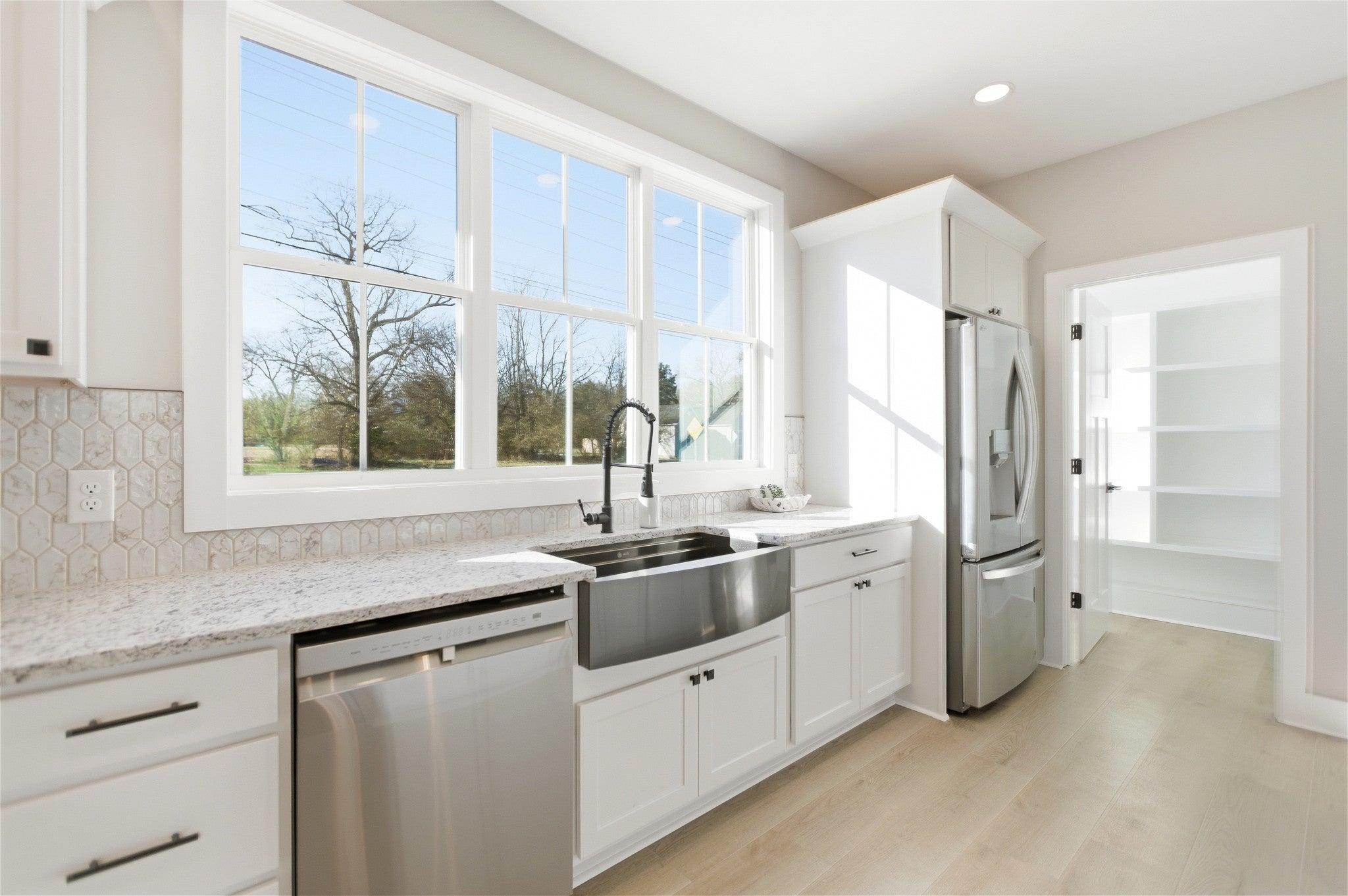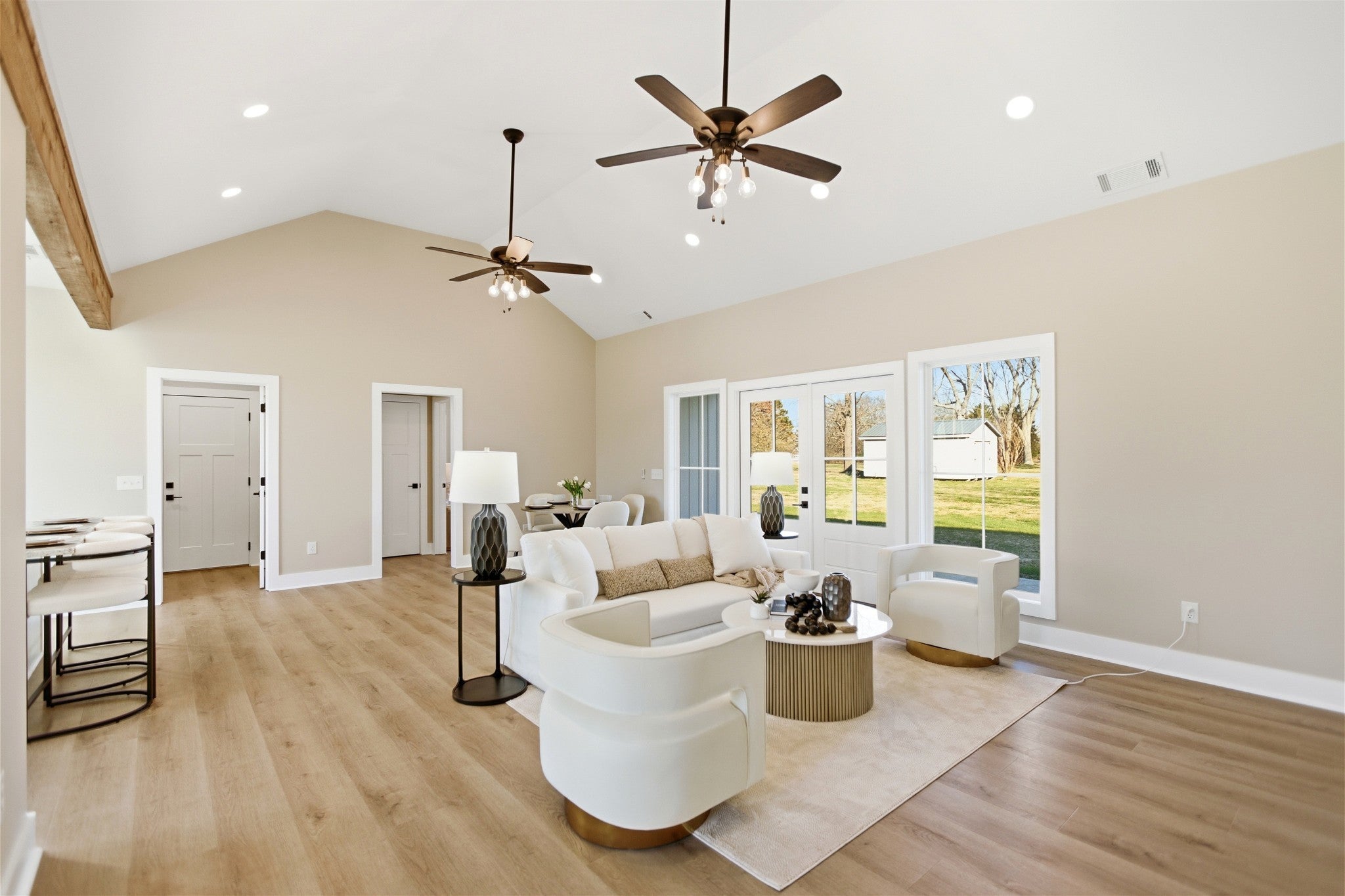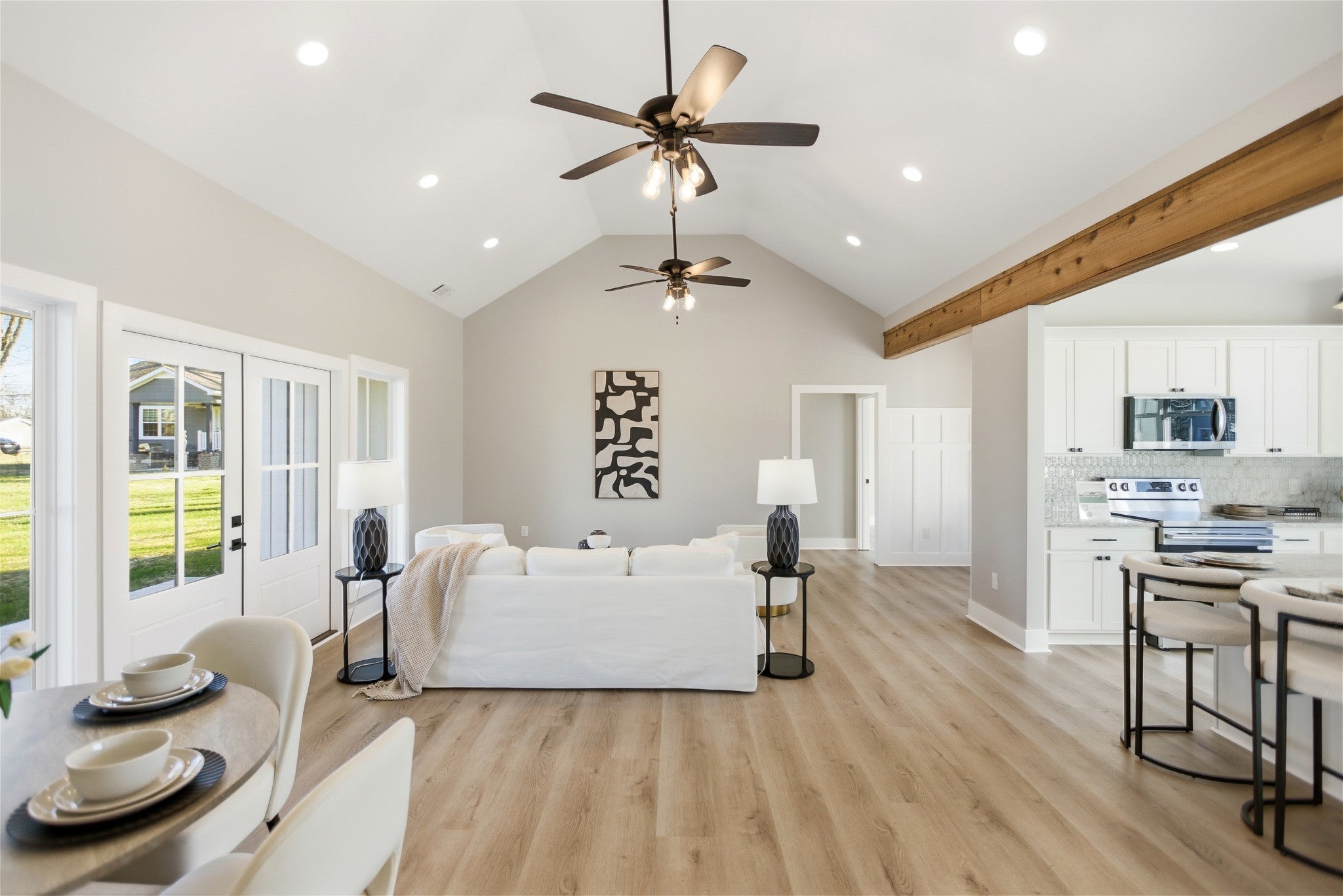 Welcome to this stunning newly constructed home where style, comfort, and quality come together seamlessly. Step inside the inviting entry foyer and be greeted by a beautiful judges-panel feature wall that sets the tone for the craftsmanship found throughout. This thoughtfully designed 3-bedroom, 2-bathroom home offers an open-concept layout with luxury vinyl plank flooring spanning the entire space. The spacious kitchen is a true centerpiece, complete with a large island, sleek granite countertops, and an oversized pantry. It flows effortlessly into the great room, highlighted by impressive vaulted ceilings, perfect for entertaining or everyday living. The split-bedroom floorplan ensures privacy, with the primary suite serving as a relaxing retreat. Enjoy a custom tile shower, double vanities, and a custom walk-in closet designed for maximum organization. Step outside to a covered patio, ideal for morning coffee or evening gatherings. This exceptional home blends modern finishes with functional design—don’t miss your opportunity to make 90 Kings Lane yours!
