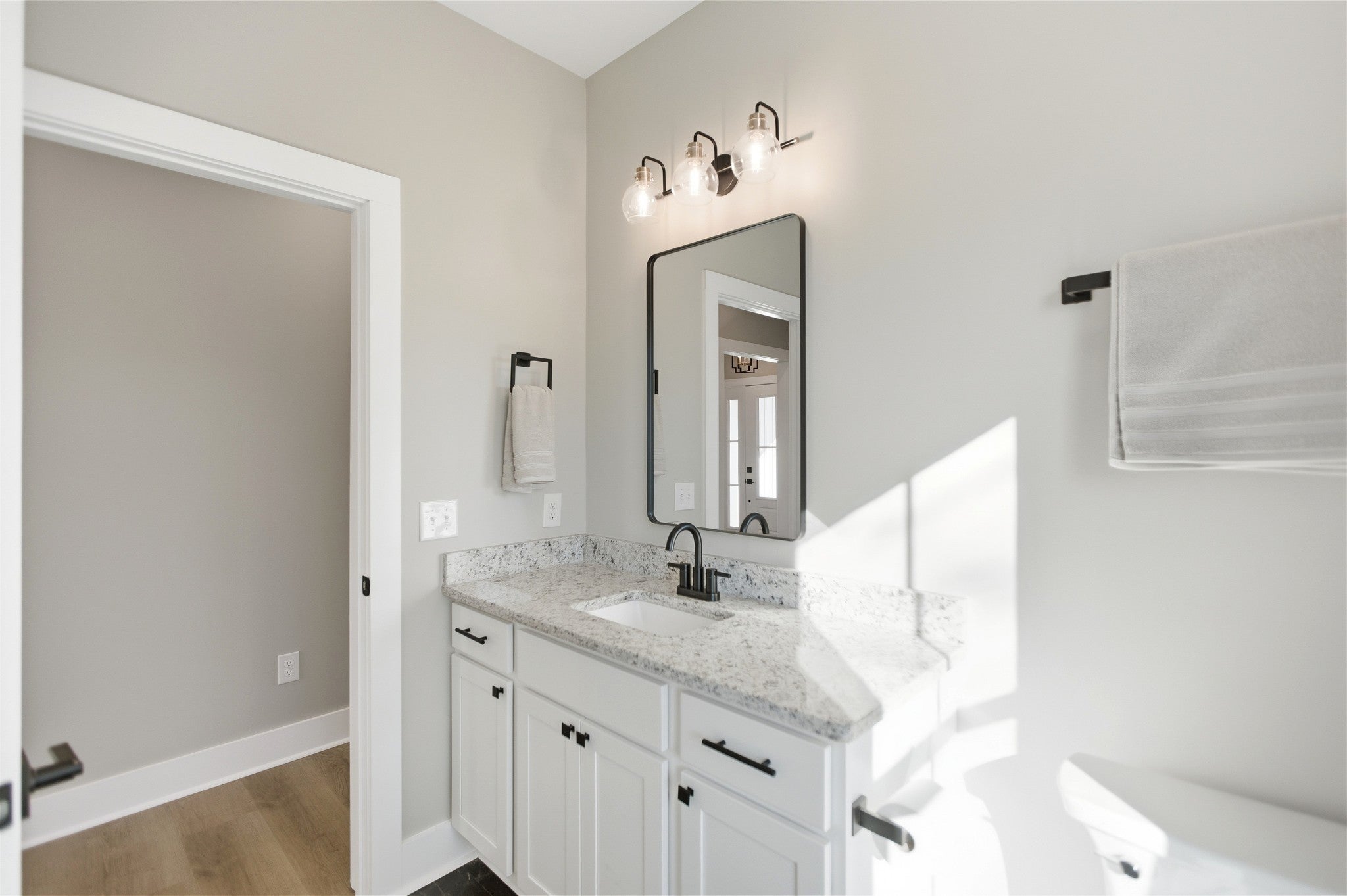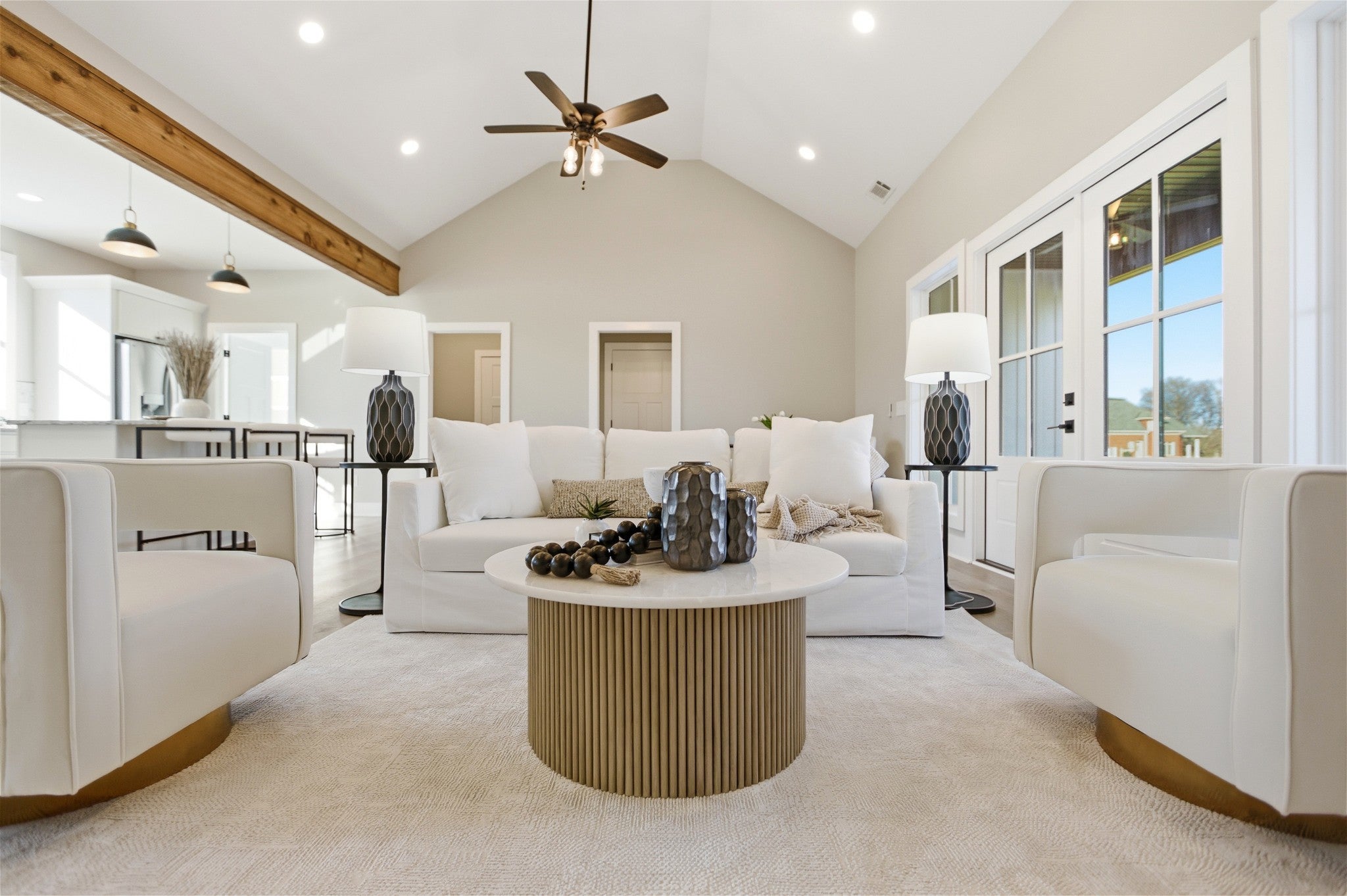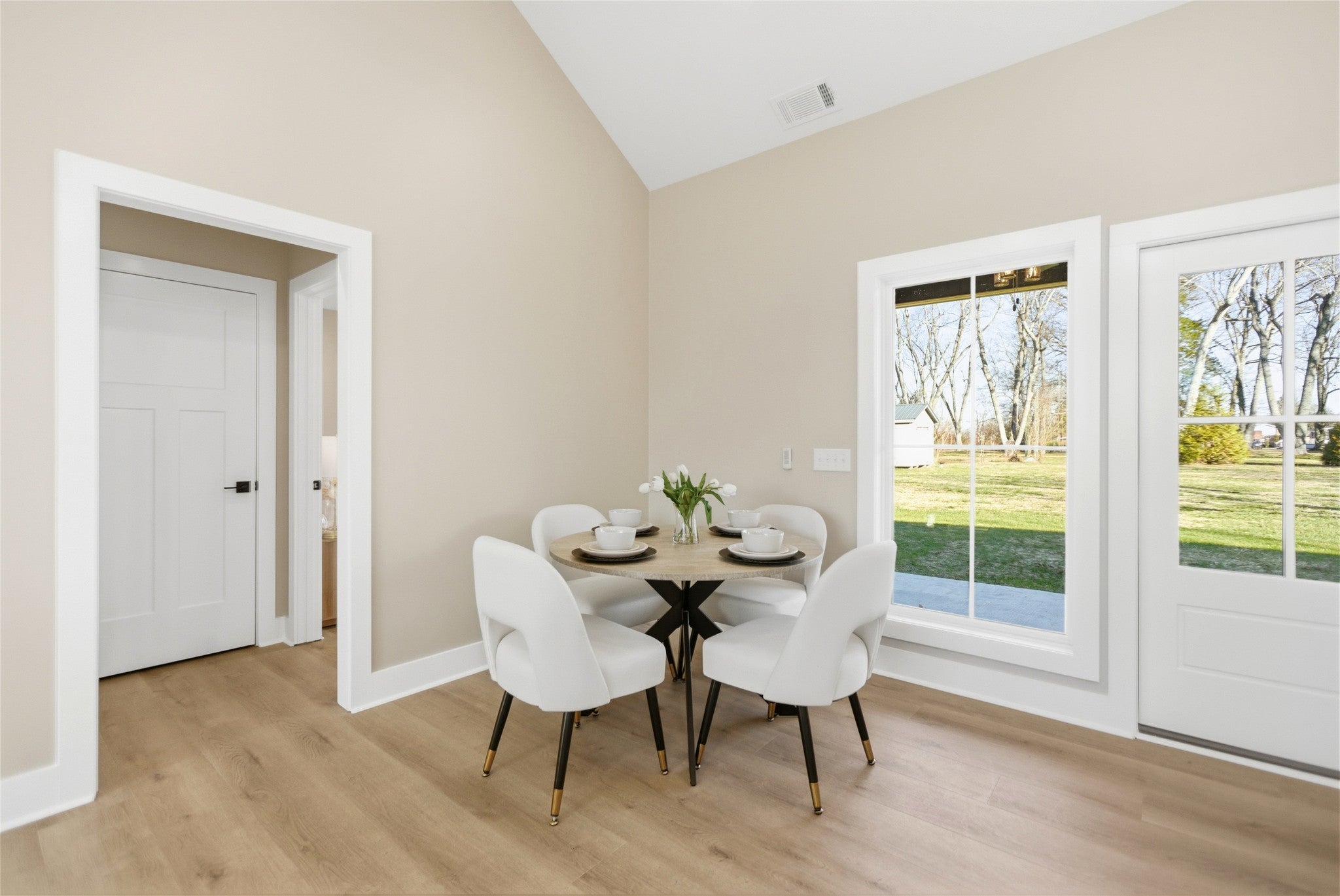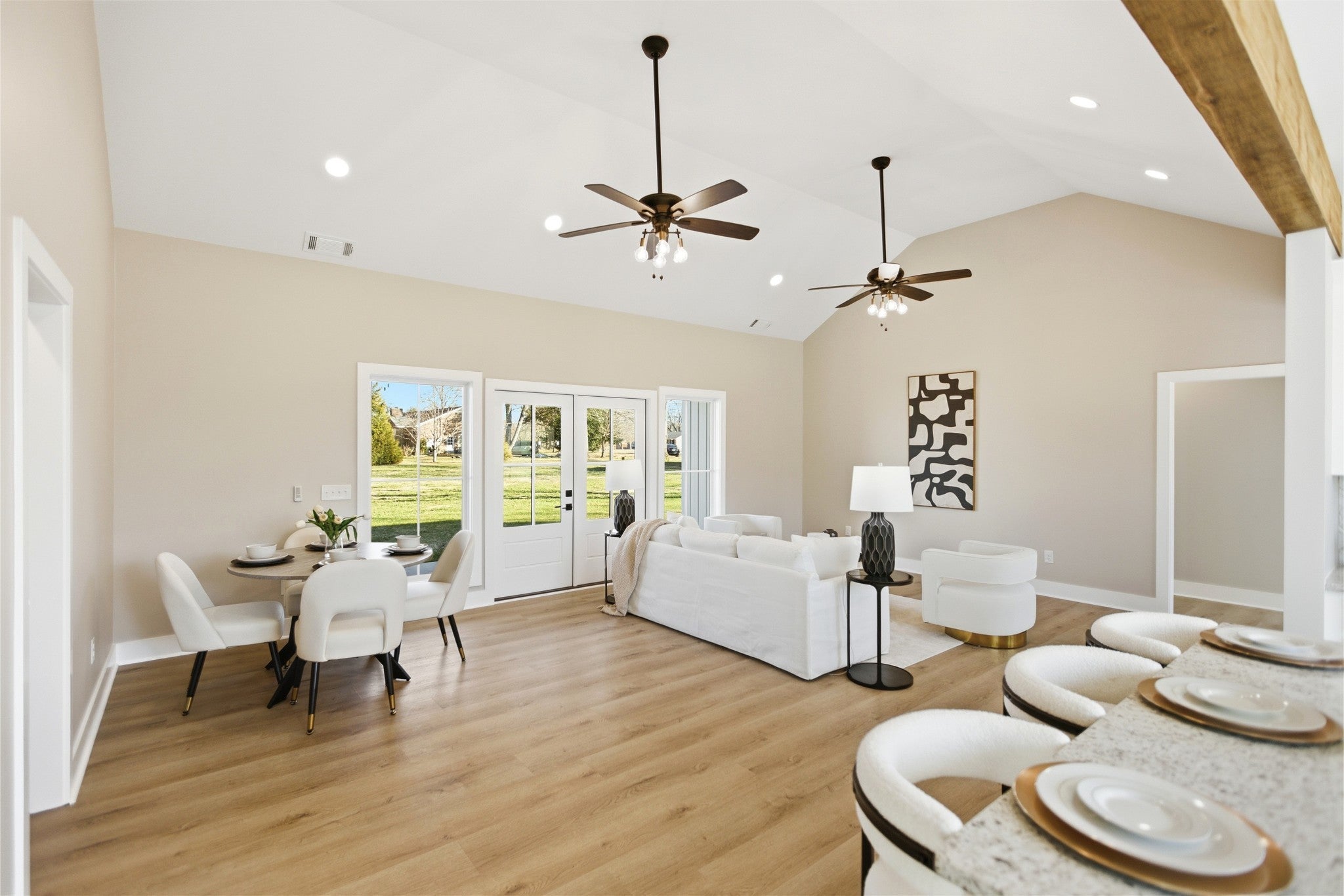Welcome to this stunning newly constructed home where style, comfort, and quality come together seamlessly. Step inside the inviting entry foyer and be greeted by a beautiful judges-panel feature wall that sets the tone for the craftsmanship found throughout. This thoughtfully designed 3-bedroom, 2-bathroom home offers an open-concept layout with luxury vinyl plank flooring spanning the entire space. The spacious kitchen is a true centerpiece, complete with a large island, sleek granite countertops, and an oversized pantry. It flows effortlessly into the great room, highlighted by impressive vaulted ceilings, perfect for entertaining or everyday living. The split-bedroom floorplan ensures privacy, with the primary suite serving as a relaxing retreat. Enjoy a custom tile shower, double vanities, and a custom walk-in closet designed for maximum organization. Step outside to a covered patio, ideal for morning coffee or evening gatherings. This exceptional home blends modern finishes with functional design—don’t miss your opportunity to make 90 Kings Lane yours!