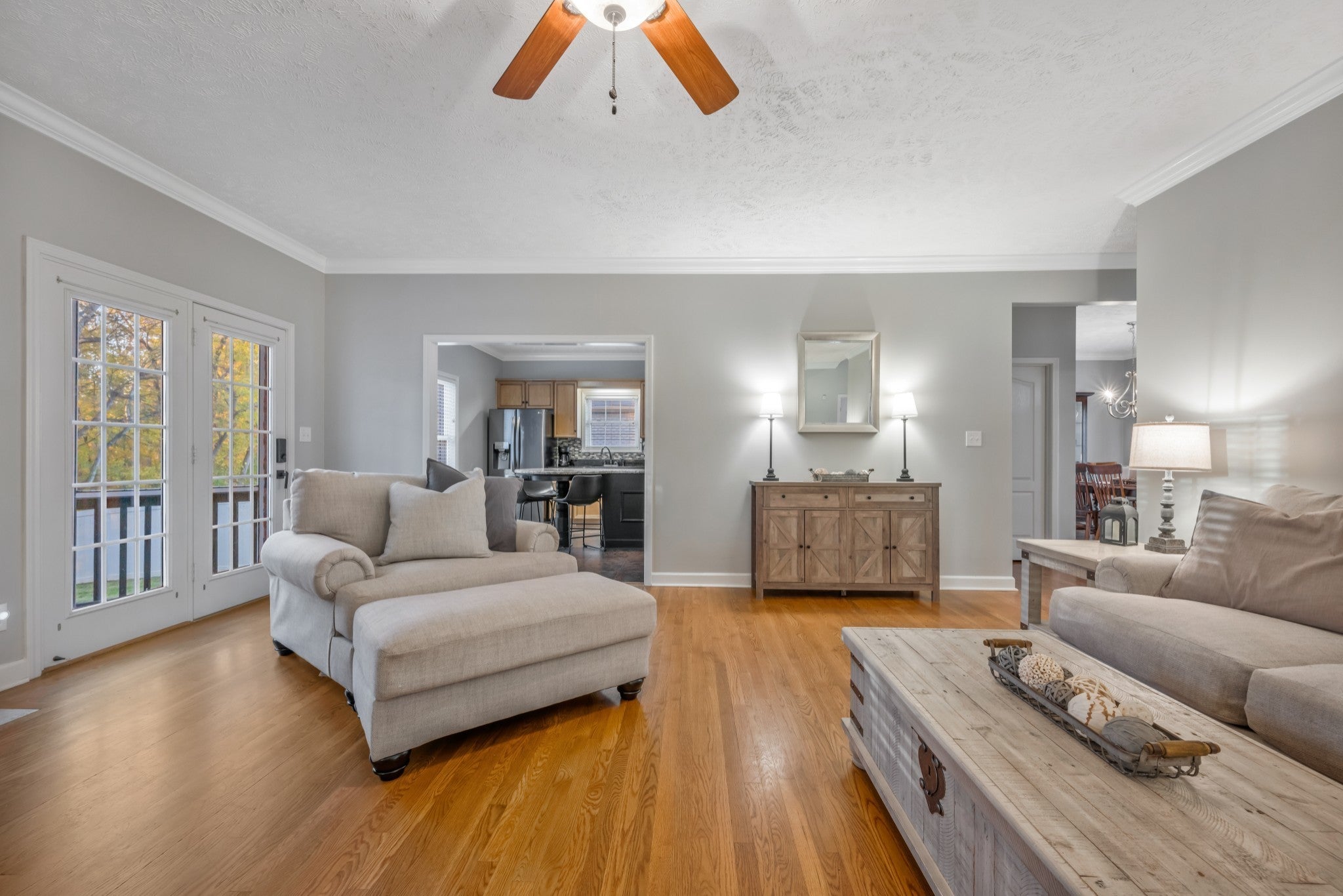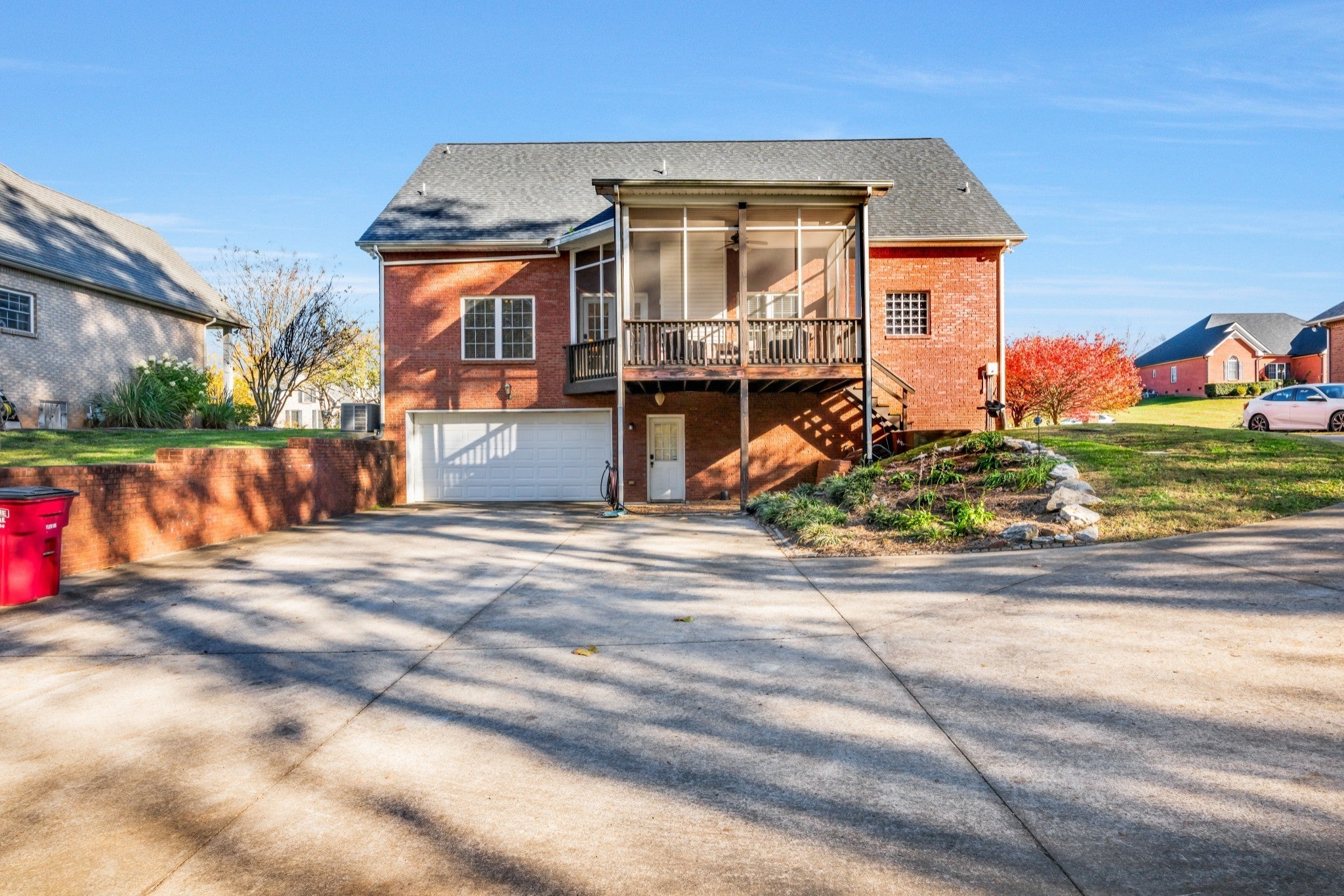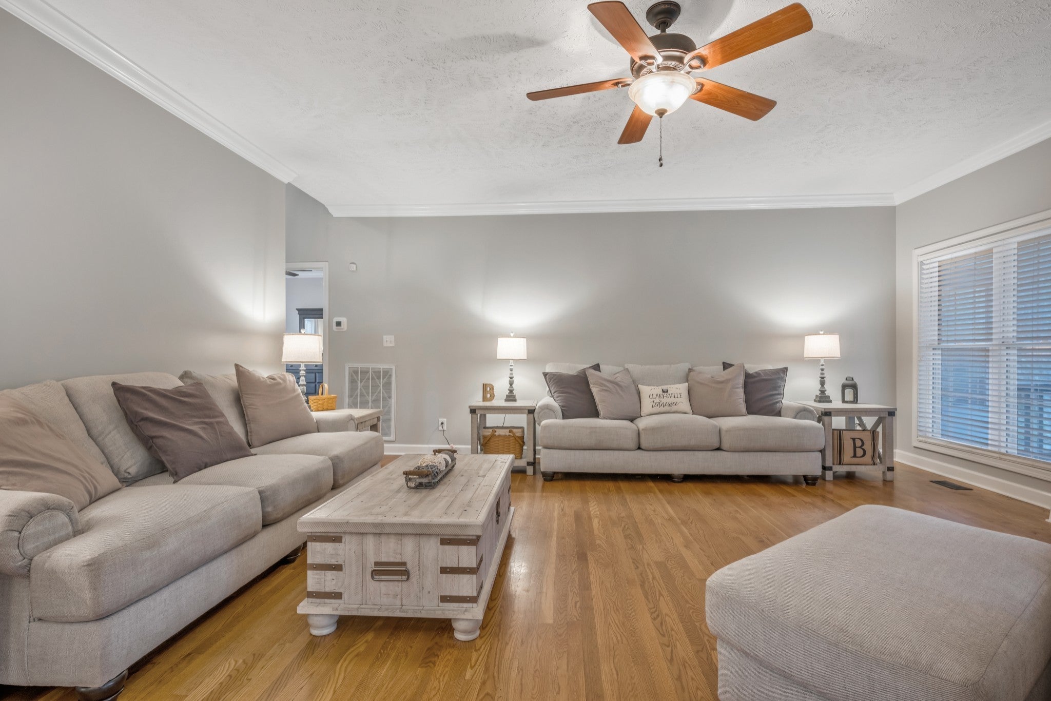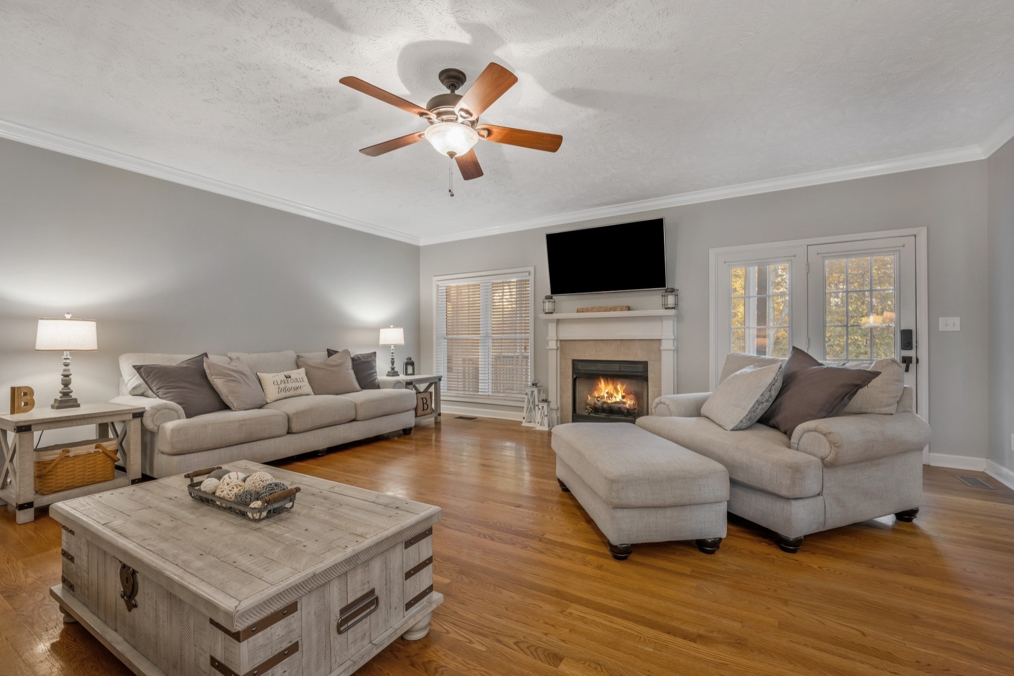 Seller is offering buyer concessions with an acceptable offer. In the heart of Sango! This beautifully maintained all-brick home in South Ridge offers 3 bedrooms and 2.5 baths with hardwood floors, fresh paint, and timeless charm. The primary suite is on the main level, as is the laundry room, and half bath for convenience. The main level also features a formal dining room and a screened-in deck, perfect for morning coffee or evening relaxation. The fully finished basement includes a mud room and a safe room ideal for an office, hobby, or exercise space. It also features a large additional room with a gas fireplace perfect for a family den or guest retreat. The second floor features a Jack and Jill bathroom room with two bedrooms and big closets. Enjoy no neighbors on the back of the property; rather a wood line with beautiful sunsets, extra concrete for parking, and a well-kept yard in one of Clarksville’s most desirable Sango neighborhoods. HVAC, water heater,roof, and appliances have all been recently replaced.
