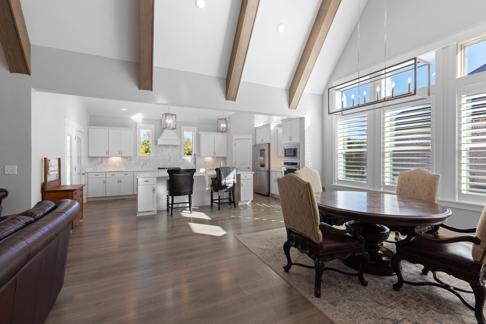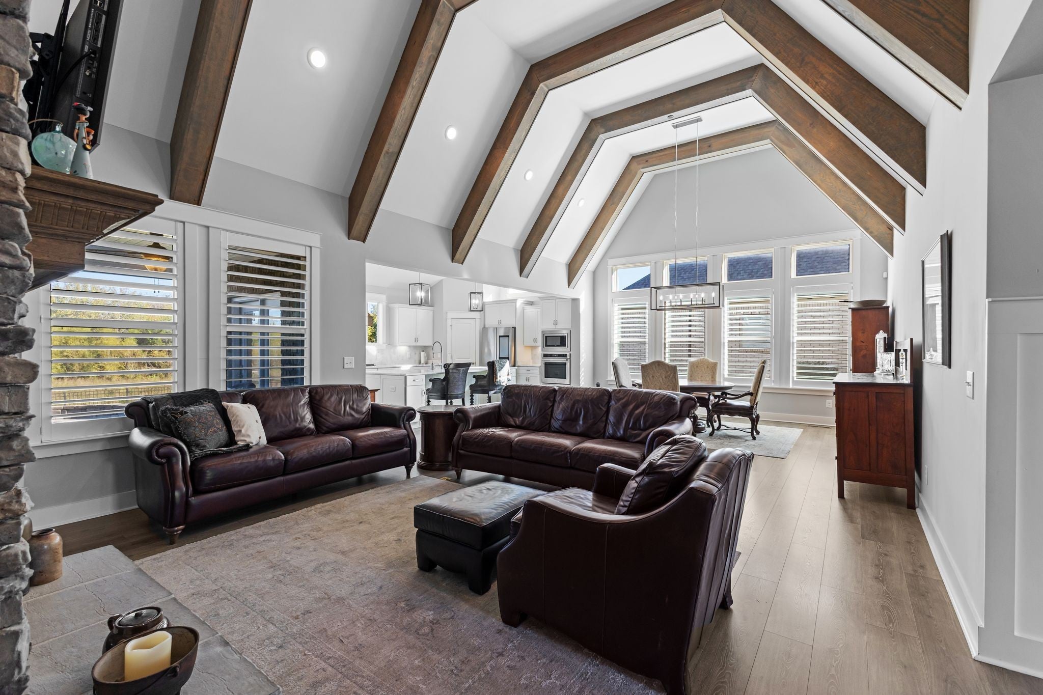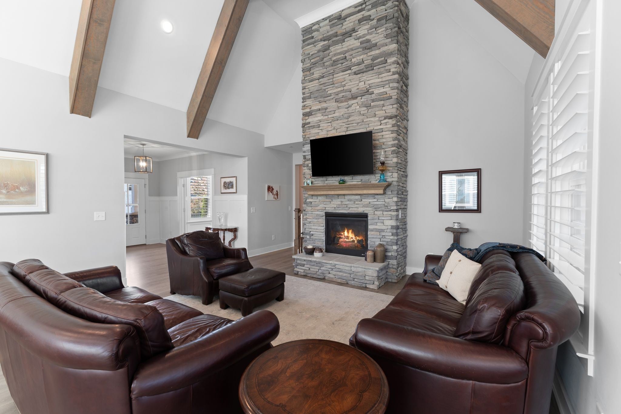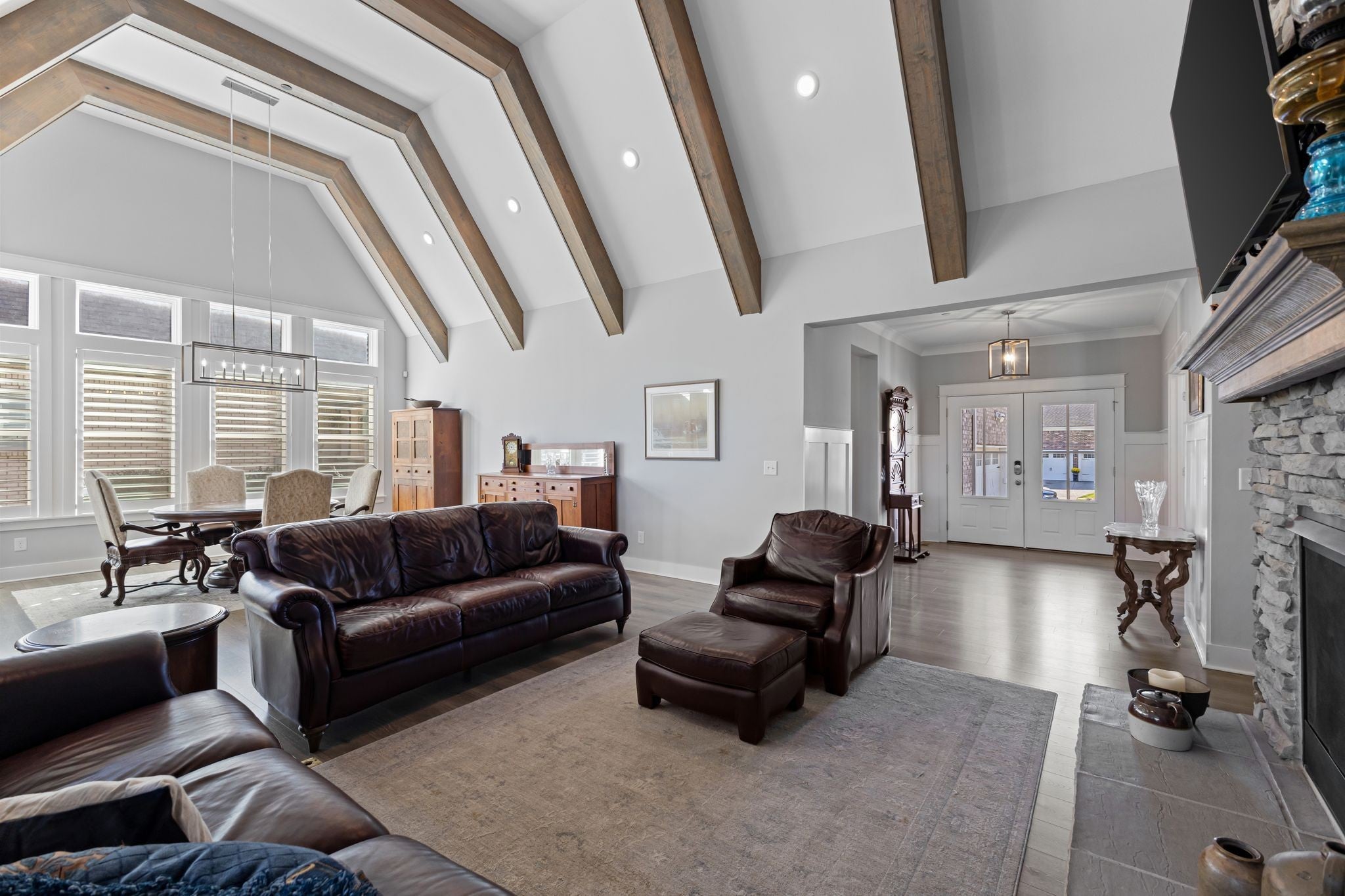 Stunning Summerlyn home in Nolensville with privacy and upscale finishes. The property backs to a protected, wooded area with wildlife and no homes behind, creating a quiet, private setting. Walk to Nolensville High, Mill Creek Middle and Elementary, and the new Publix shopping center. The main level features a primary suite with tray ceiling and private access to the covered patio. The chef’s kitchen has granite counters, gas range with custom vent hood, and reverse-osmosis water at the sink and fridge. All bedrooms include custom California Closet systems—no wire shelving—and plantation shutters add a refined look throughout. The great room shows exposed wood beams and a warm, open layout. A dedicated office includes a tray ceiling and wainscoting. Mechanical upgrades include a Rheem tankless water heater and Kinetico water softener. Outdoors, the covered patio has two ceiling fans and opens to a large paved area with a firepit and seating—ideal for entertaining. The yard is fenced with three gates, on irrigation, and features programmable exterior LED lighting and multiple outdoor outlets. Ample storage above the garage completes this move-in ready home.