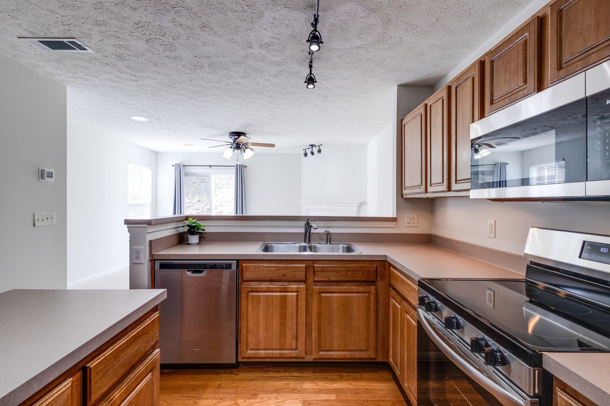 - Electric Range, Dishwasher, Microwave, Refrigerator, Stainless Steel Appliance(s)