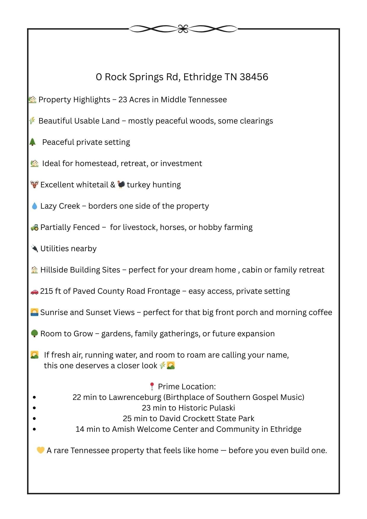 Tucked away in the rolling hills of Middle Tennessee, this 23+/- acre tract (being surveyed) offers the kind of peace that’s getting harder to find. A place where the world slows down, the air feels cleaner, and your days begin with birdsong instead of traffic. Mostly wooded with just the right amount of open clearings, this land offers beautiful, private building sites and endless possibilities. One of the most special features is the hilltop retreat views, just waiting for you and your bench or pavillion or hunting cabin, where you can watch the sun rise over the hills in the morning and take in wide-open sunset views in the evening. It’s also an ideal setting for a front porch, a cup of coffee, and a life lived at a gentler pace. A lazy creek with clear, flowing water borders one side of the property, adding beauty, privacy, and that calming sound that makes this land feel like home the moment you arrive. Marketable timber adds long-term value, partial fencing is already in place. While the setting feels peaceful and private, the property is conveniently located just 14 minutes from the Amish Welcome Center in Ethridge, 23 minutes from Lawrenceburg, and 22 minutes from historic Pulaski. This ideal balance of quiet country living with easy access to nearby towns makes the property perfect for a full-time home, weekend retreat, or land investment. Priced at $15,000 per acre, this Middle Tennessee acreage offers privacy, water, views, and natural beauty in a setting that feels both grounded and inviting. No crowds. No noise. Just room to breathe, build, hunt, and create something lasting. If you’ve been waiting for land that feels right the moment you step onto it, this may be the one calling you home. Use Rock Springs Baptist Church, 619 Rock Spring Br Rd, Ethridge, TN 38456 address for GPS property is about 1/2 mile south.