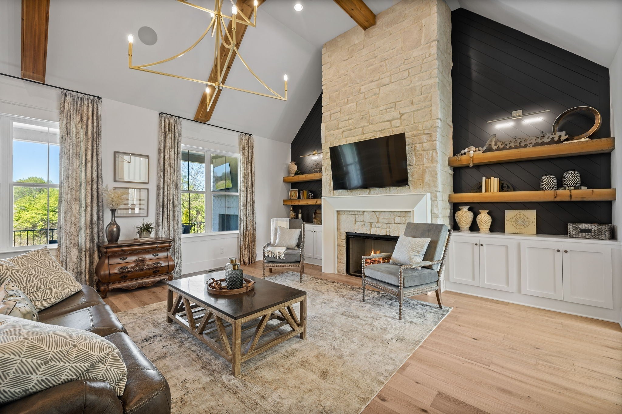 Sinatra Model Home Now Available - All appliances, bedding, draperies, rugs, and mounted televisions to remain, making this an exceptional, move-in-ready opportunity. Experience exceptional craftsmanship and effortless, elevated living in this beautifully appointed Turnberry model home, thoughtfully designed with an open floor plan featuring both the owner’s suite and a guest suite on the main level. Striking designer lighting, curated finishes, and refined architectural details are showcased throughout, while expansive windows fill the home with natural light and enhance the seamless flow ideal for both everyday living and entertaining. The family room is a true focal point, highlighted by custom built-in cabinetry and floating shleves, and architectural ceiling beams that add warmth and character to the space. The main level is designed for ultimate convenience, offering the primary living areas, a stunning vaulted study with built-in bookshelves and a fireplace, chef’s kitchen, dining room, entertaining spaces, owner’s suite, and an additional guest suite—all thoughtfully located on one floor. An expansive laundry room elevates daily living with abundant cabinetry, generous workspace, a dedicated dog wash, and a built-in dog feeding area—combining style and functionality for both homeowners and their four-legged companions. Step outside to an inviting covered porch and stamped-concrete entertaining terrace complete with a fireplace, while an encased patio with outdoor kitchen, and firepit—perfect for morning coffee, alfresco dining, or relaxing fireside evenings. Upstairs, three additional bedrooms are complemented by a generous bonus room with entertaining wetbar and beverage refrigerator. A large walk-in storage room provides exceptional space for seasonal items, décor, and luggage. Situated on a homesite surrounded by common space gives lots of privacy, this home offers a peaceful, serene setting just minutes from shopping, dining, and everyday conveniences.