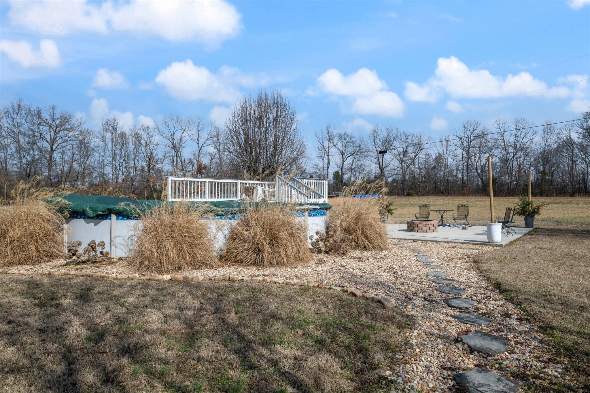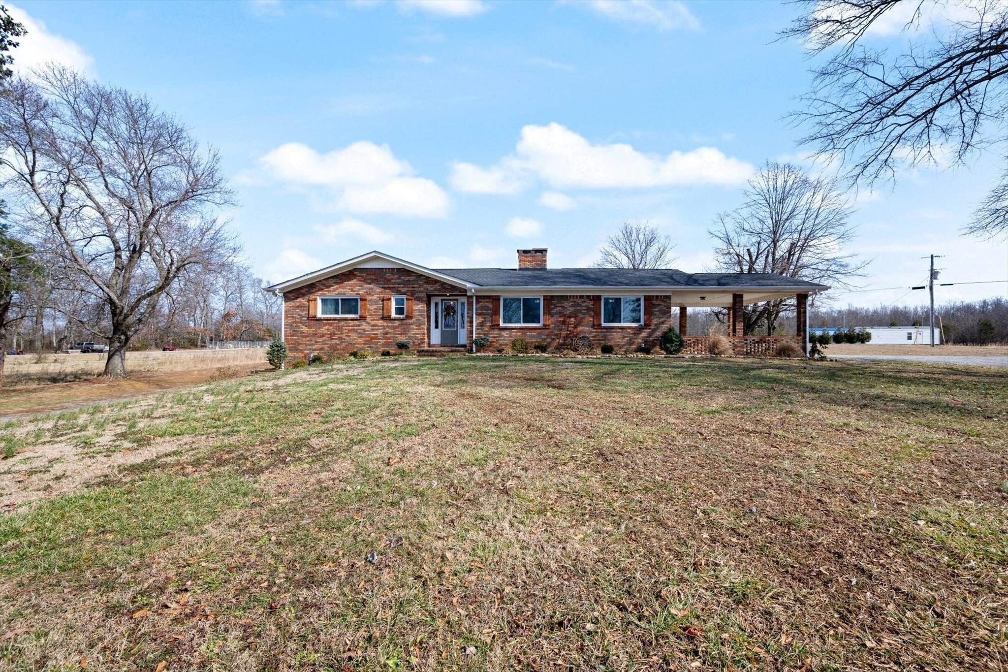 Welcome home to this beautiful all-brick, one-level home with a full basement, perfectly tucked away far off the main road for added privacy and serenity. Sitting on 3.4 gorgeous acres, this property offers space to breathe and room to enjoy the outdoors. Inside this 3bd. 2 bath home, you’ll find no carpet—only tile and luxury vinyl plank flooring throughout, making this home both stylish and easy to maintain. The kitchen comes complete with all appliances remaining and features a convenient island, perfect for gathering or meal prep. Home has 2 separate living areas, one with a fireplace and bookshelves. Roof and HVAC are less than 5 years old. Step outside to relax on the covered patio, cool off in the above-ground pool with deck, or unwind around the firepit—ideal for entertaining or quiet evenings under the stars. Parking and storage are plentiful with a carport plus a basement 2-car garage. The basement also provides great additional space for storage, storm shelter, hobbies, or future expansion. If you’re looking for privacy, comfort, and outdoor living all in one package—this one checks all the boxes!